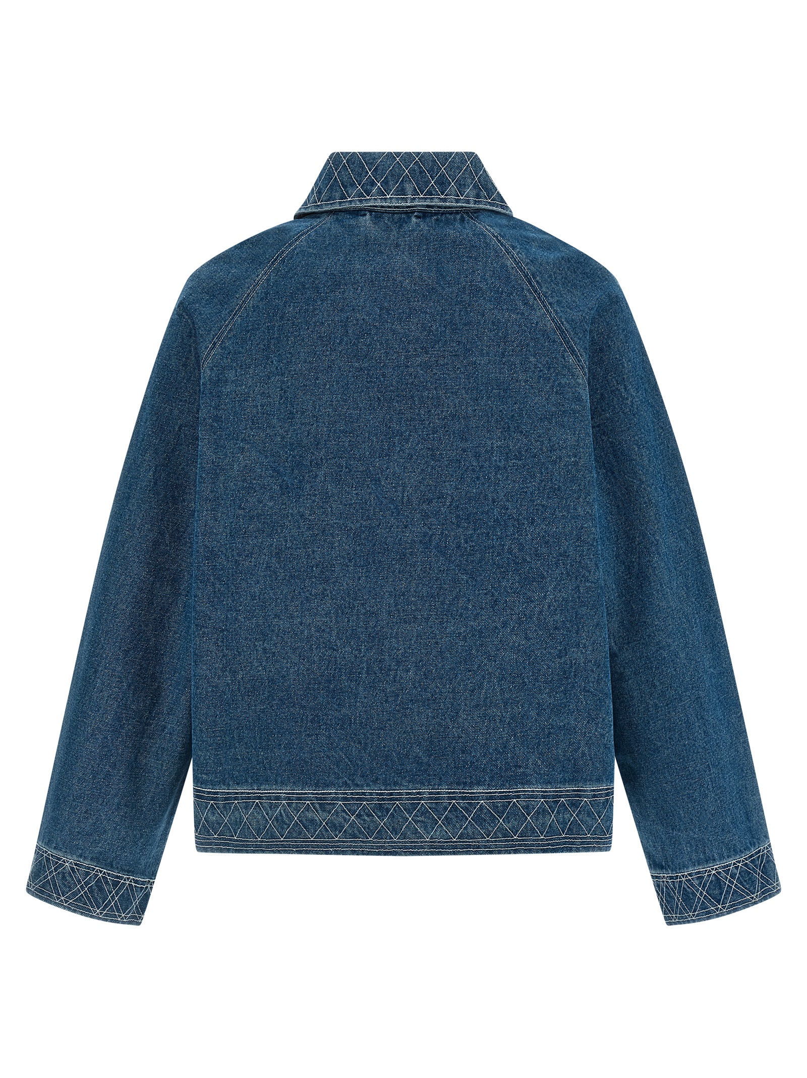 Cotton denim jacket with geometric pattern embroidery and monogram, workwear design, shirt collar, logo embroidery and front horn button closure, pockets, long raglan sleeves with cuffs