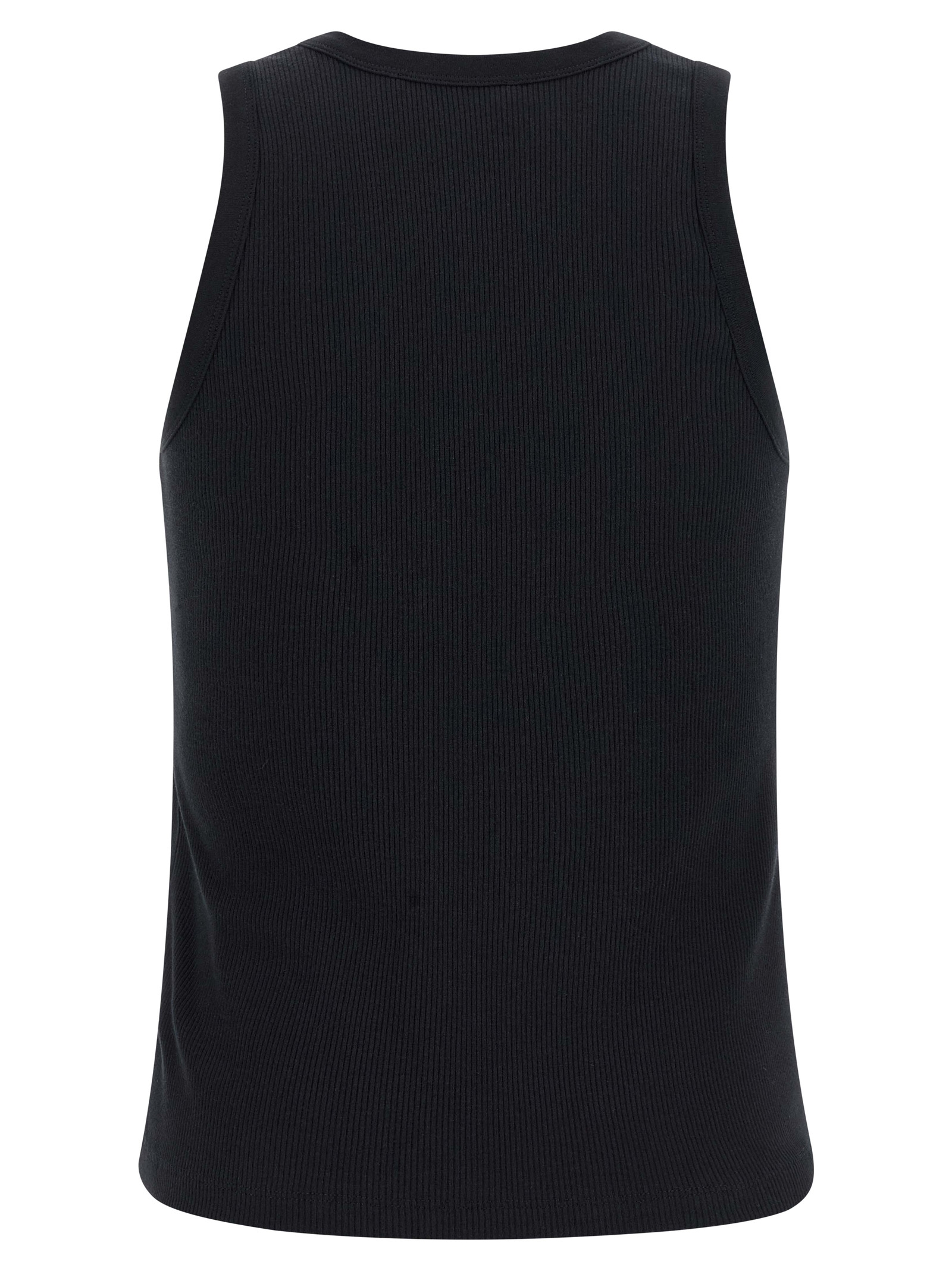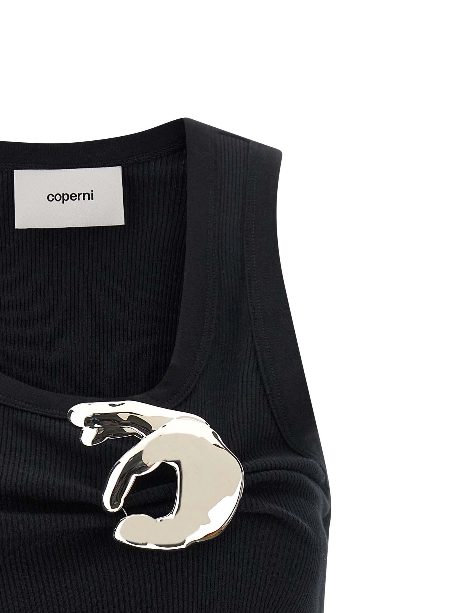 Tank top in cotton jersey, model with curl and ‘Emoji’ brooch in removable silver metal on the front, slightly oblique neckline to form an asymmetrical V.
