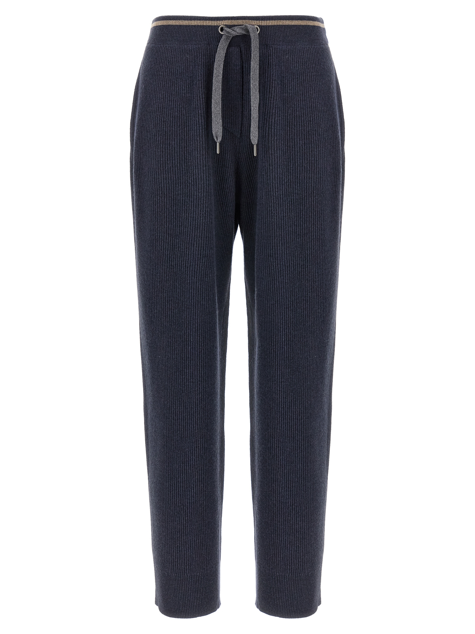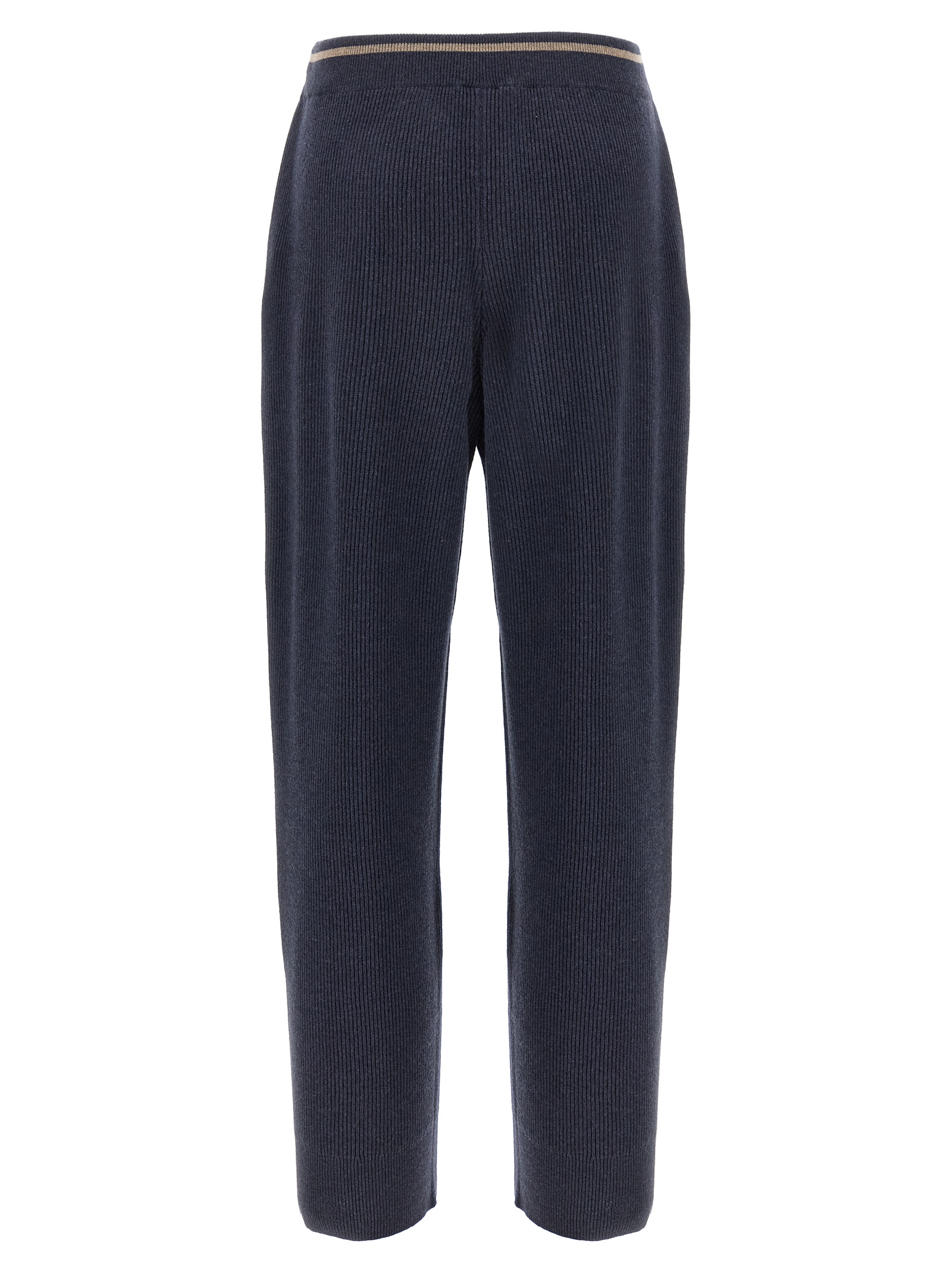 English rib knit cashmere and silk knit pants with contrast details, pull-up model, adjustable drawstring elastic at the waist, trompe l’oeil flap, pockets, straight leg.