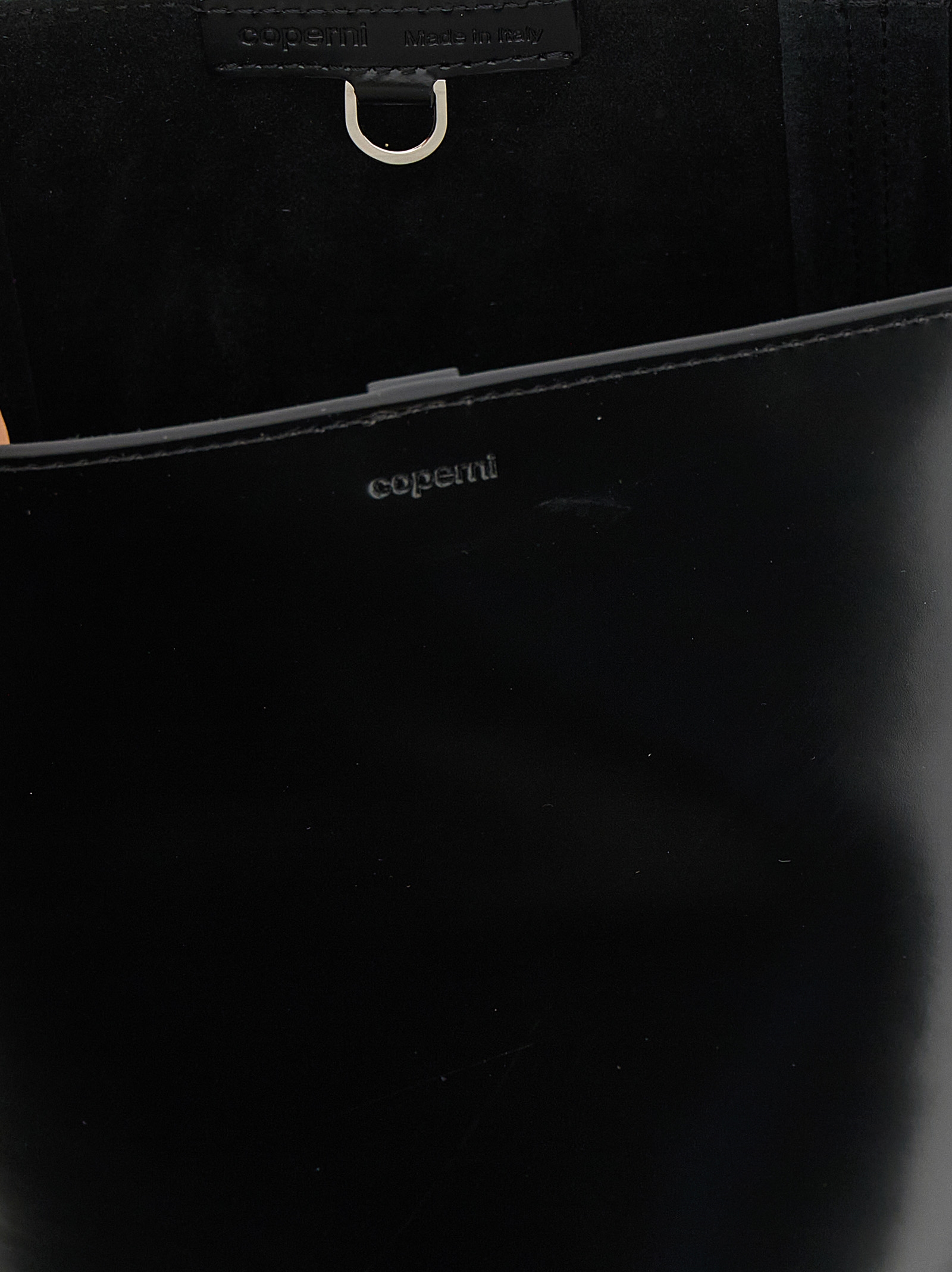 ‘Ergonomic’ bucket bag in smooth abrasive finish leather, sculptural structured design, girido hem, front embossed logo, inner carabiner closure, adjustable handle.