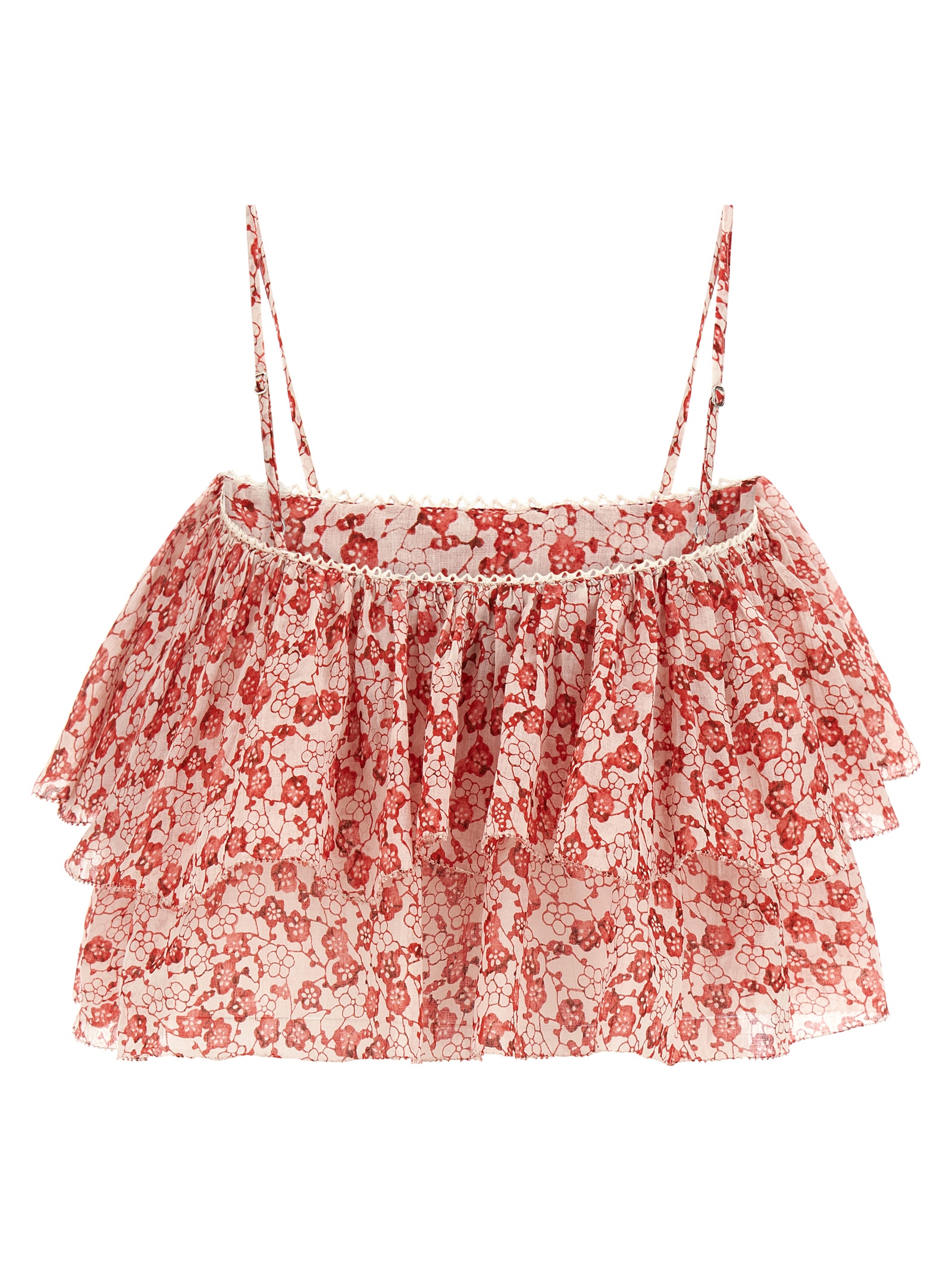 ‘Erisa’ all-over flower-print cotton top, double flounce crop model with curls, lace insert on the neckline, thin and adjustable straps.
