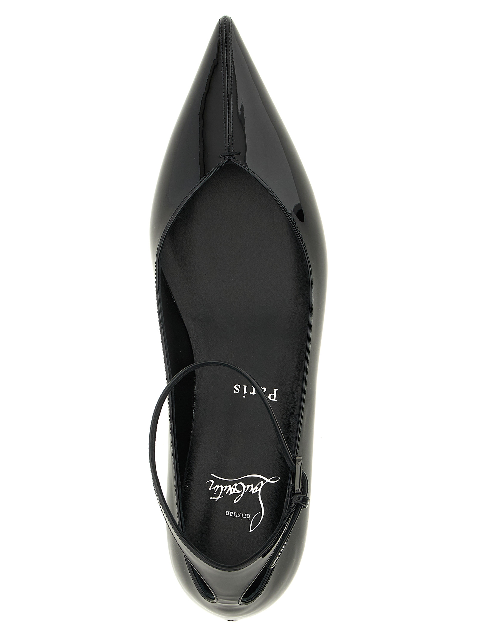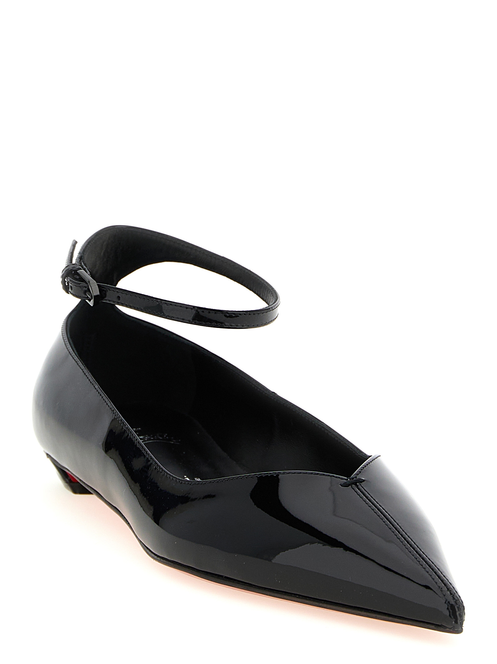 ‘Erozeena’ patent calf leather ballet flats, pointed toe, adjustable ankle strap, chunky heel, iconic red ‘Loubi’ sole.