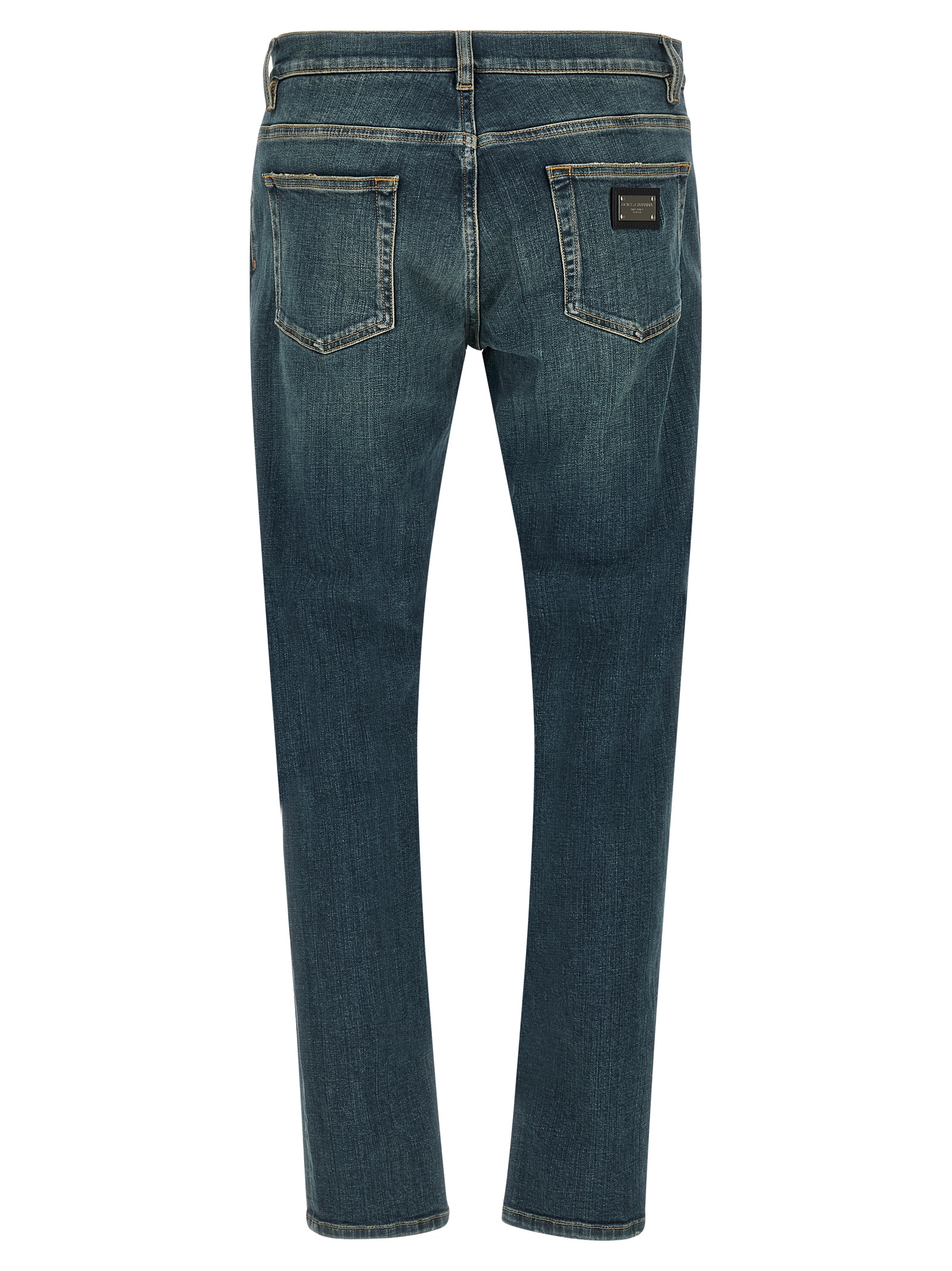 ‘Essential’ used-effect stone washed stretch cotton denim jeans, contrast stitching, low waist, front zip and button closure, five pockets, leather patch with metal logo tag on the back.