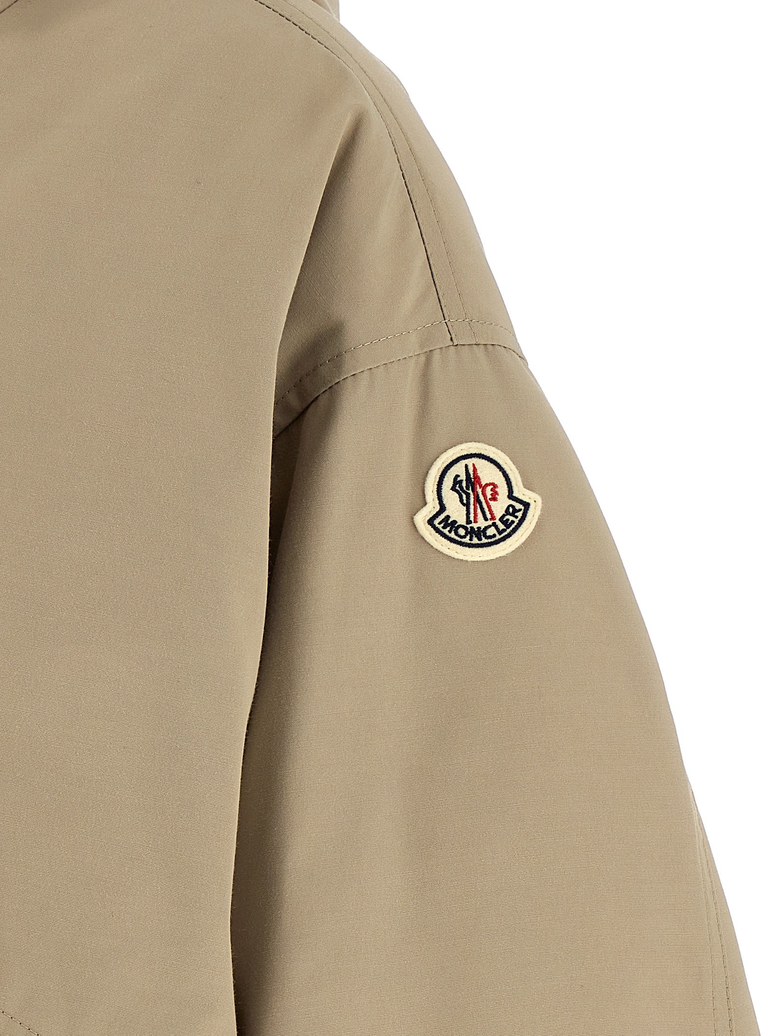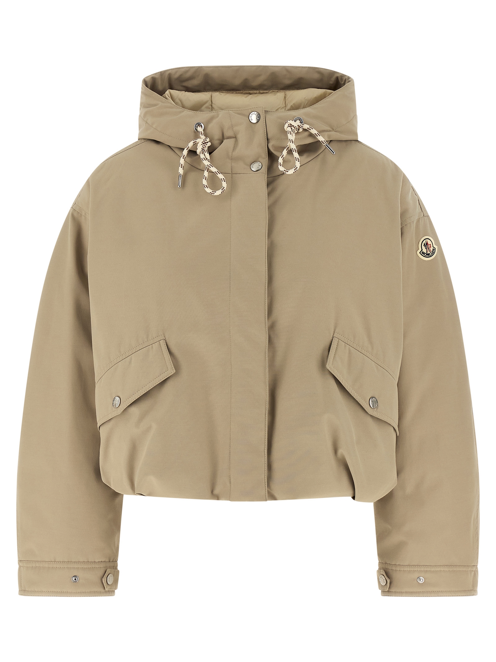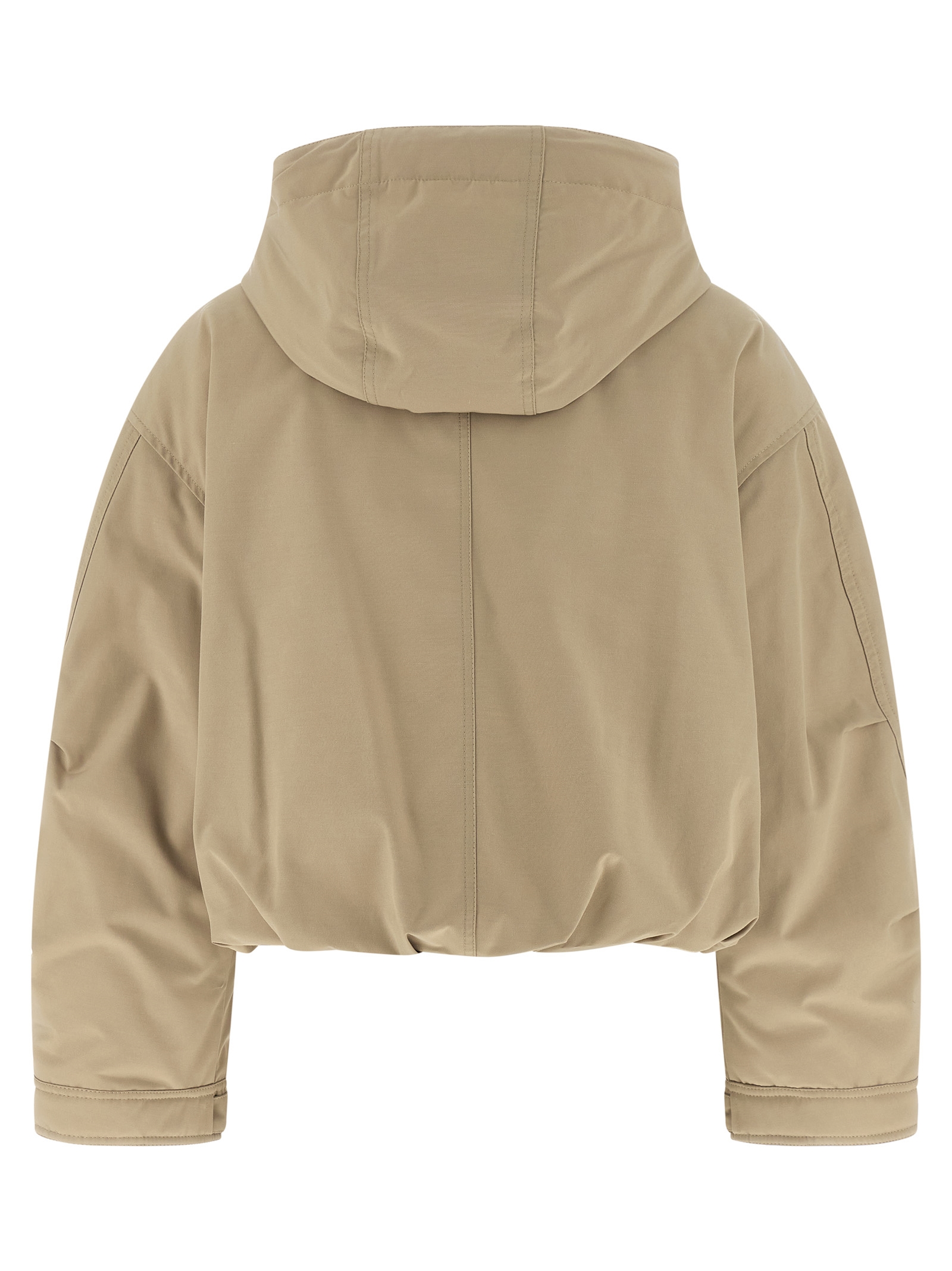 ‘Eucalyptus’ short down jacket in cotton and polyester blend, quilted and slightly quilted goose feather long saison ue lining, cropped style, adjustable hood, high neck, zip and snap button closure, pockets, long cuffed sleeves, dropped shoulders and felt logo patch, drawstring on the hem.