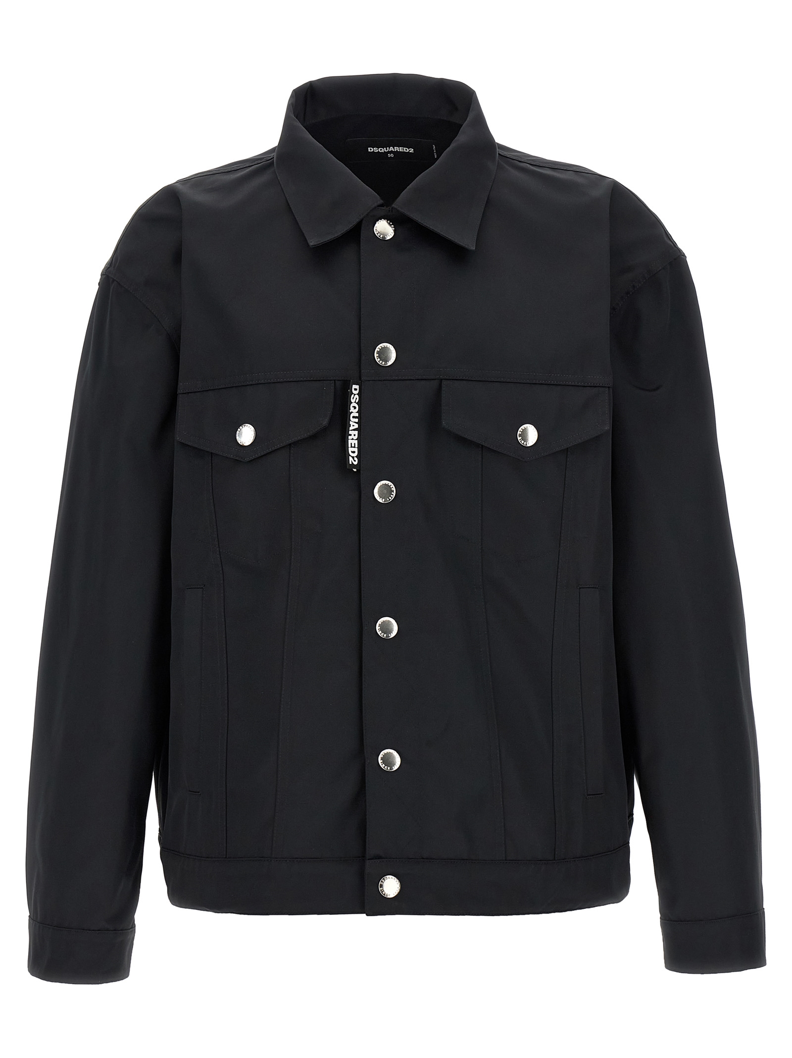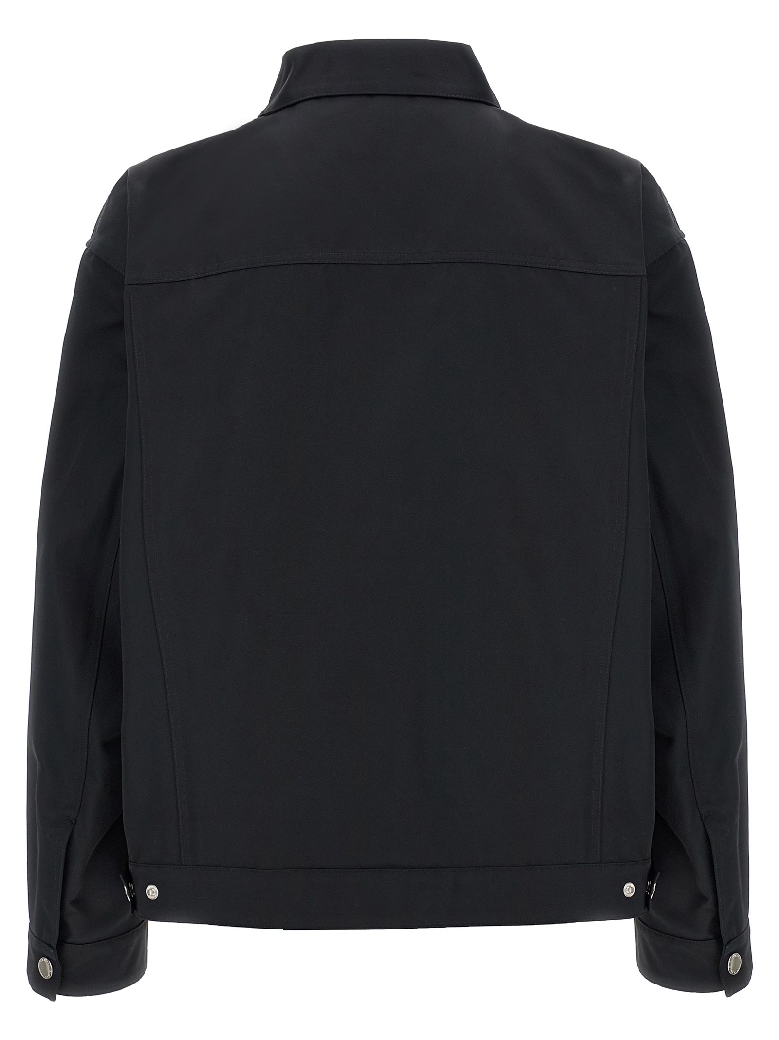Jacket in semi-gloss fabric, with collar stitching and pockets, front closure with snap buttons, long sleeves with cuffs.