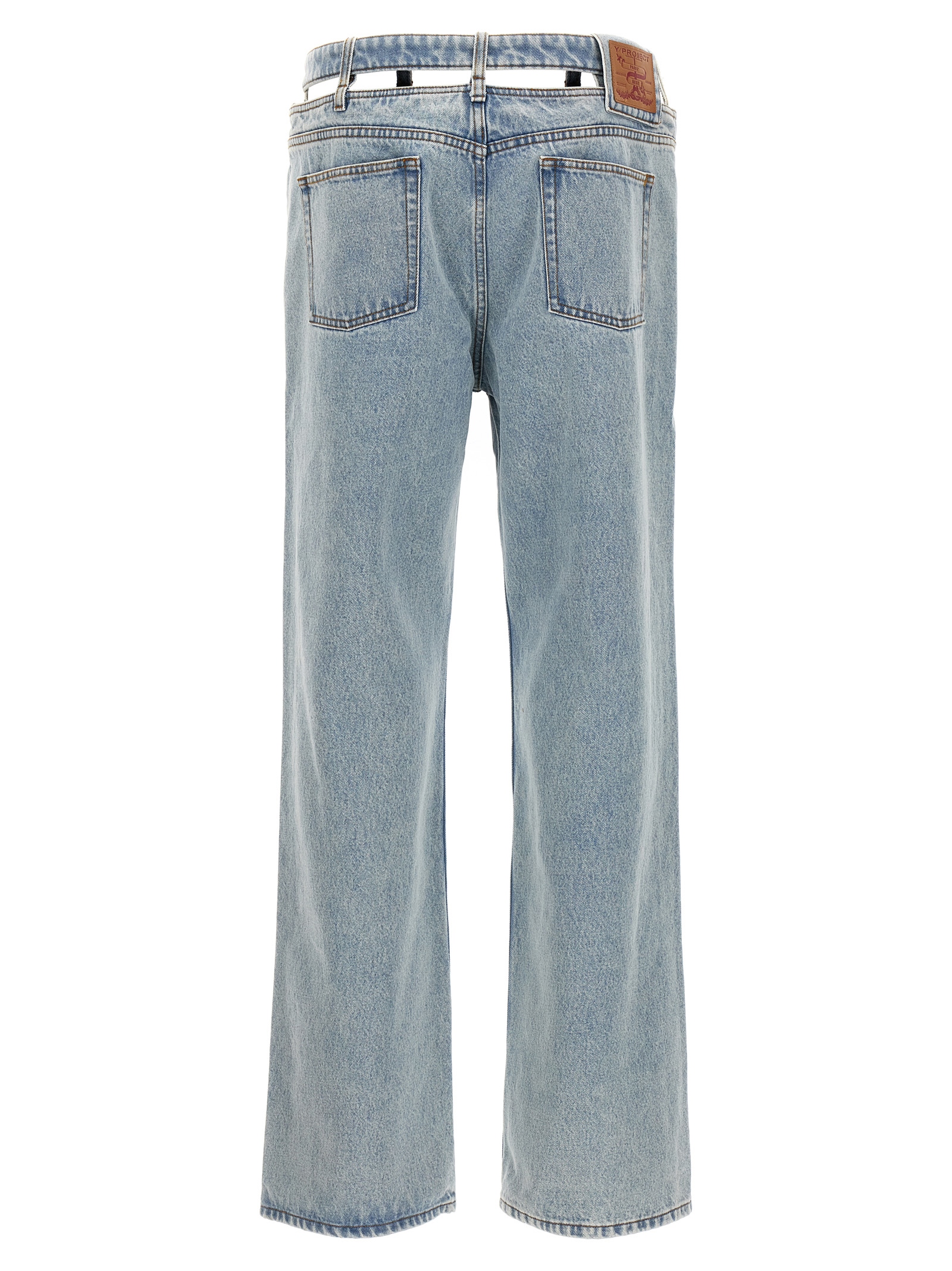 ‘Evergreen Y Belt’ cotton denim jeans with cut-out details and logo buckle belt at the waist, zip and button closure, five pockets, leather logo label at the back.