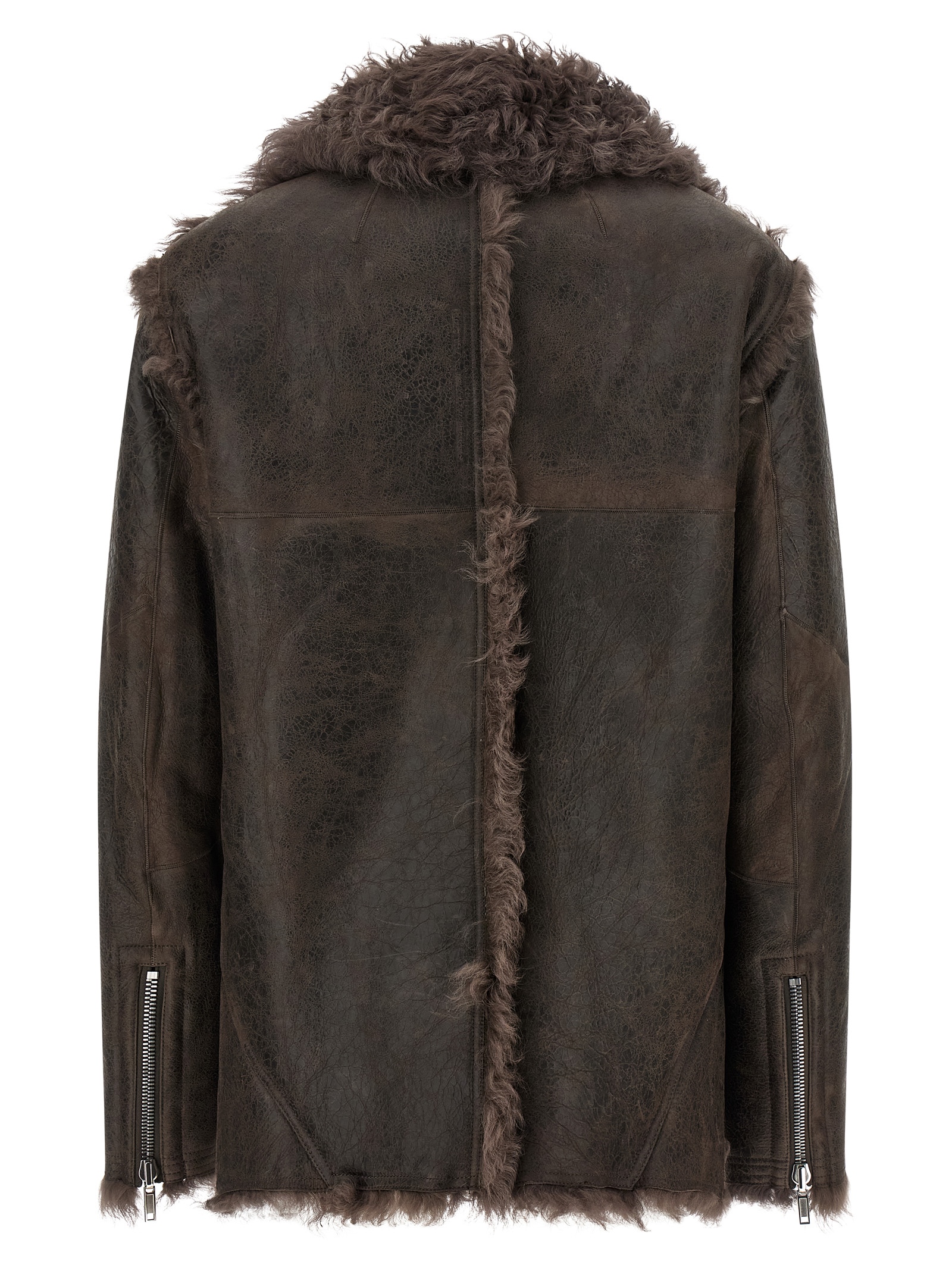 ‘Exploder’ jacket in used-effect worked leather, shearling lining, adjustable high collar as a collar on the shoulders, front zip closure, pockets, long sleeves with zip on the cuffs, asymmetrical hem.