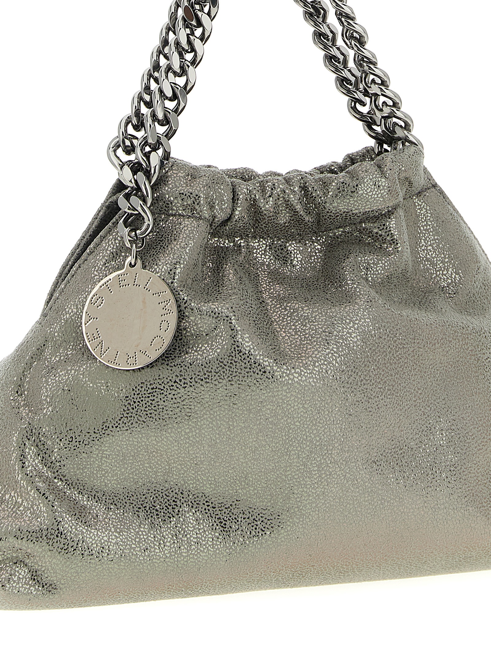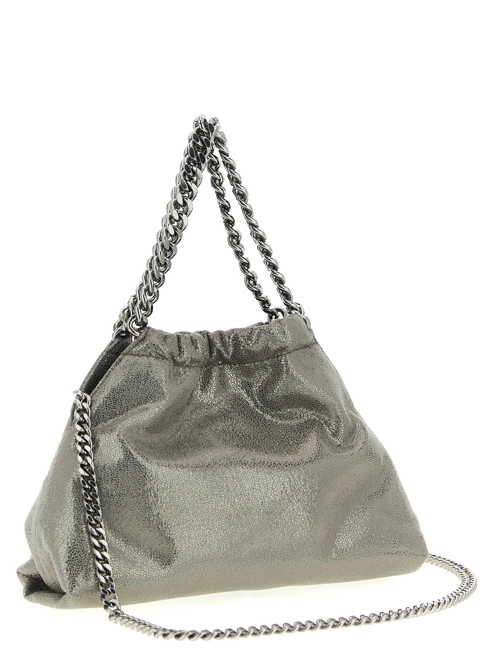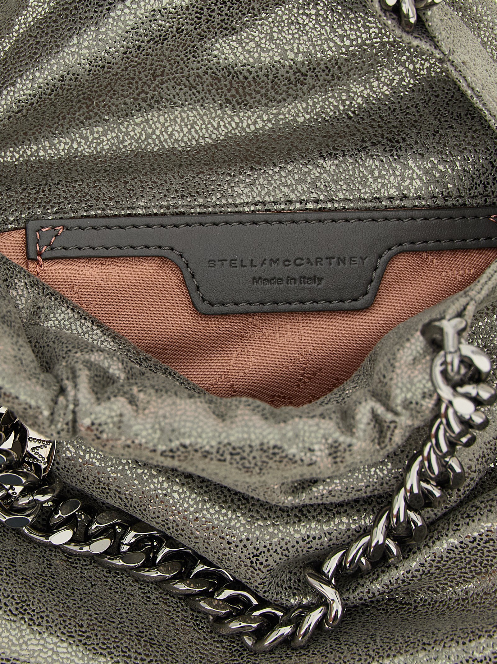 ‘Falabella’ crossbody bag in Shaggy Deer pearlescent vegan fabric with magnetic closure, double handle, diamond-effect chain shoulder strap.