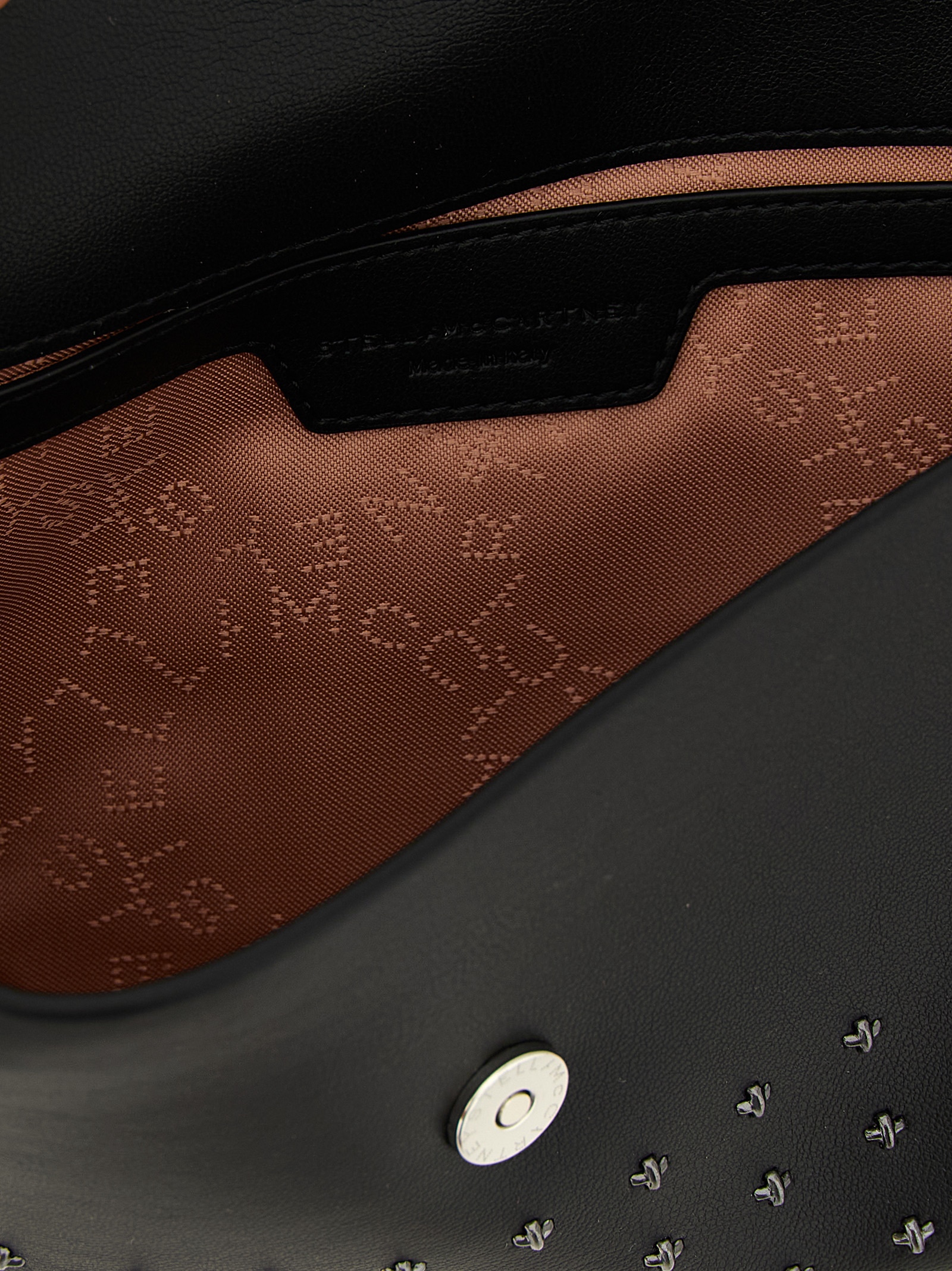 Wallet on chain – Limited Edition in Alter-Mat with all-over hand-knit silver star studs, ‘Falabella’ diamond chain, magnetic flap closure, chain shoulder strap, medallion charm with engraved logo.