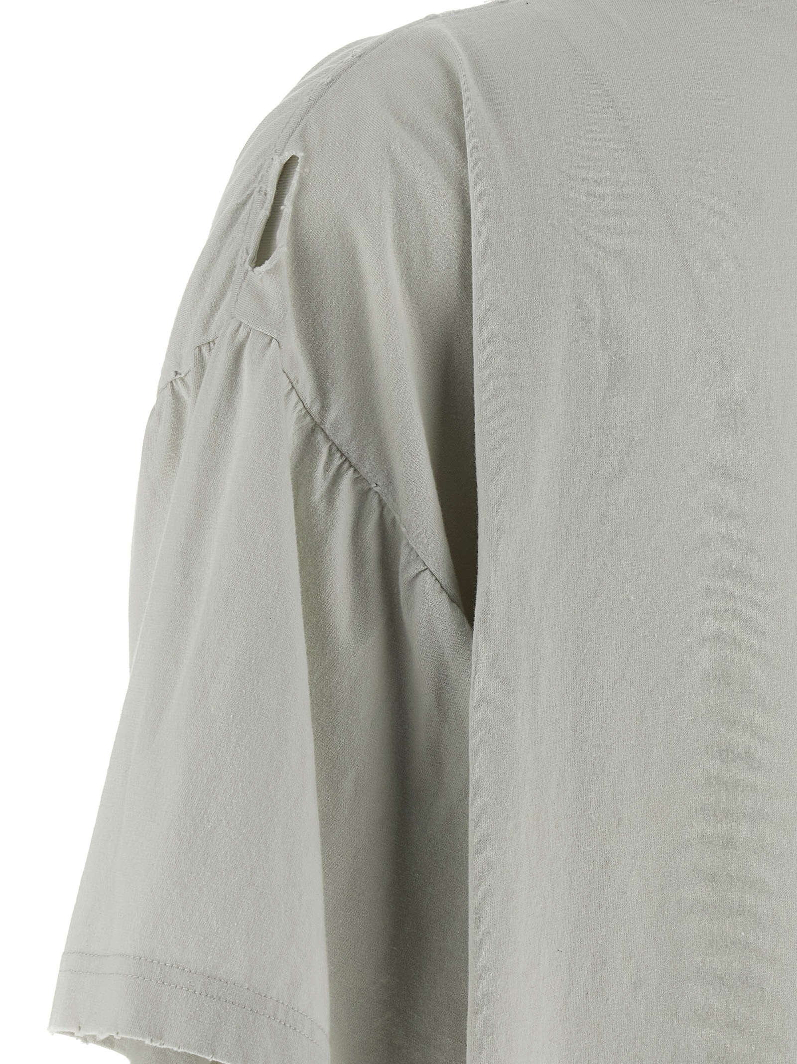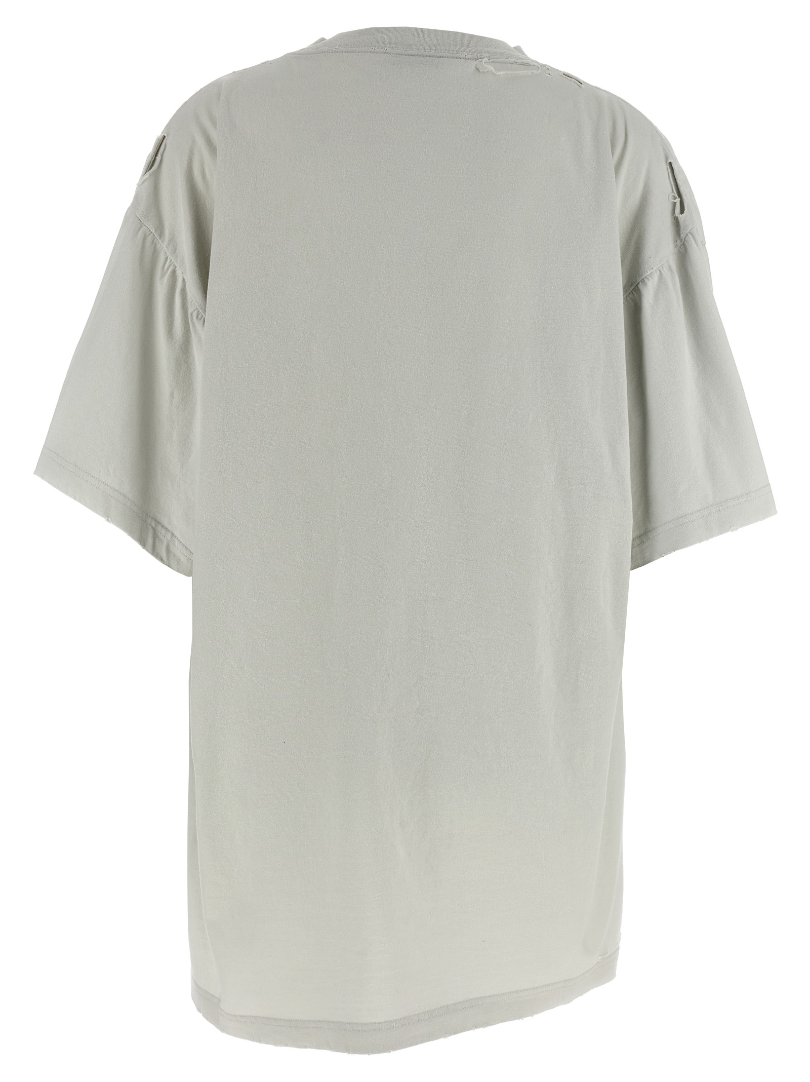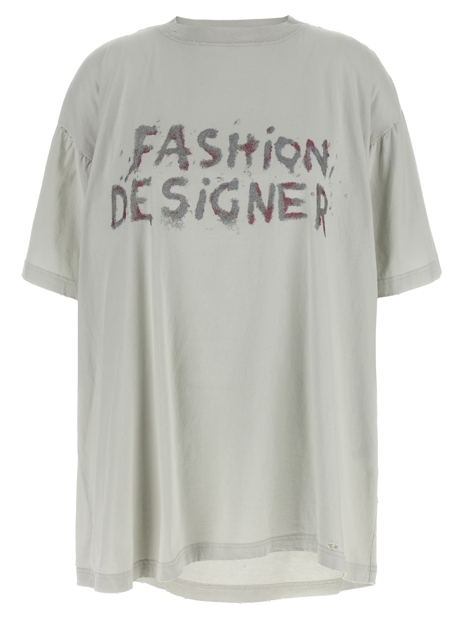Used and torn dry jersey T-shirt, ‘Fashion Designer’ print with front glitter, crew neck, short sleeves with dropped shoulder.