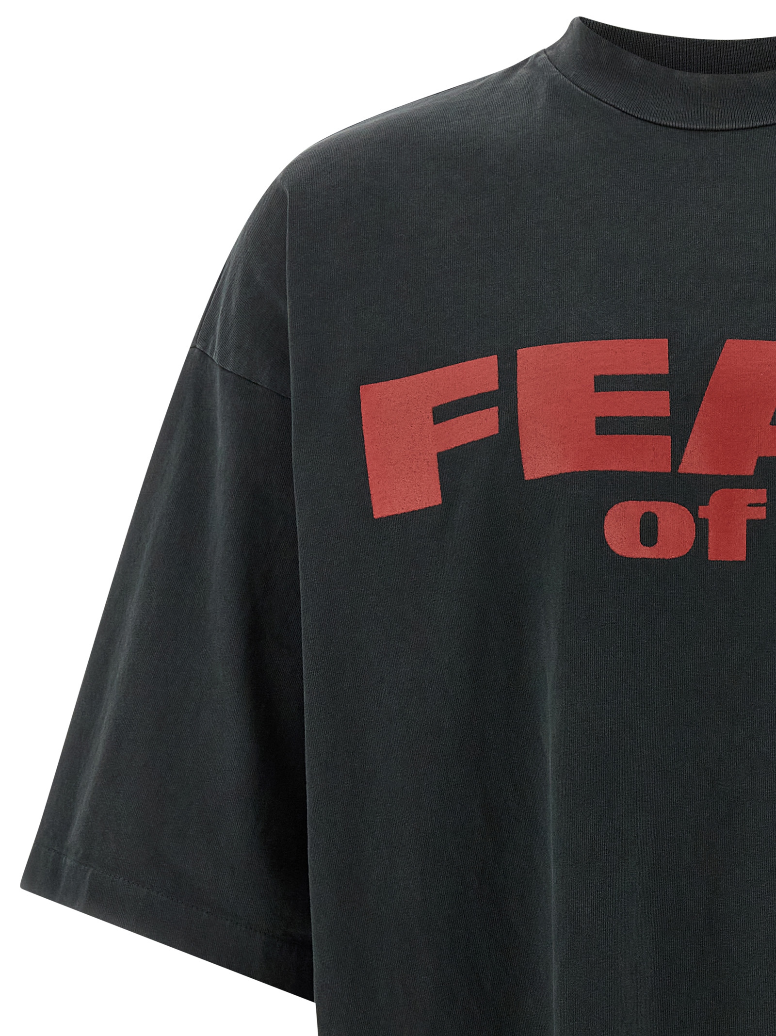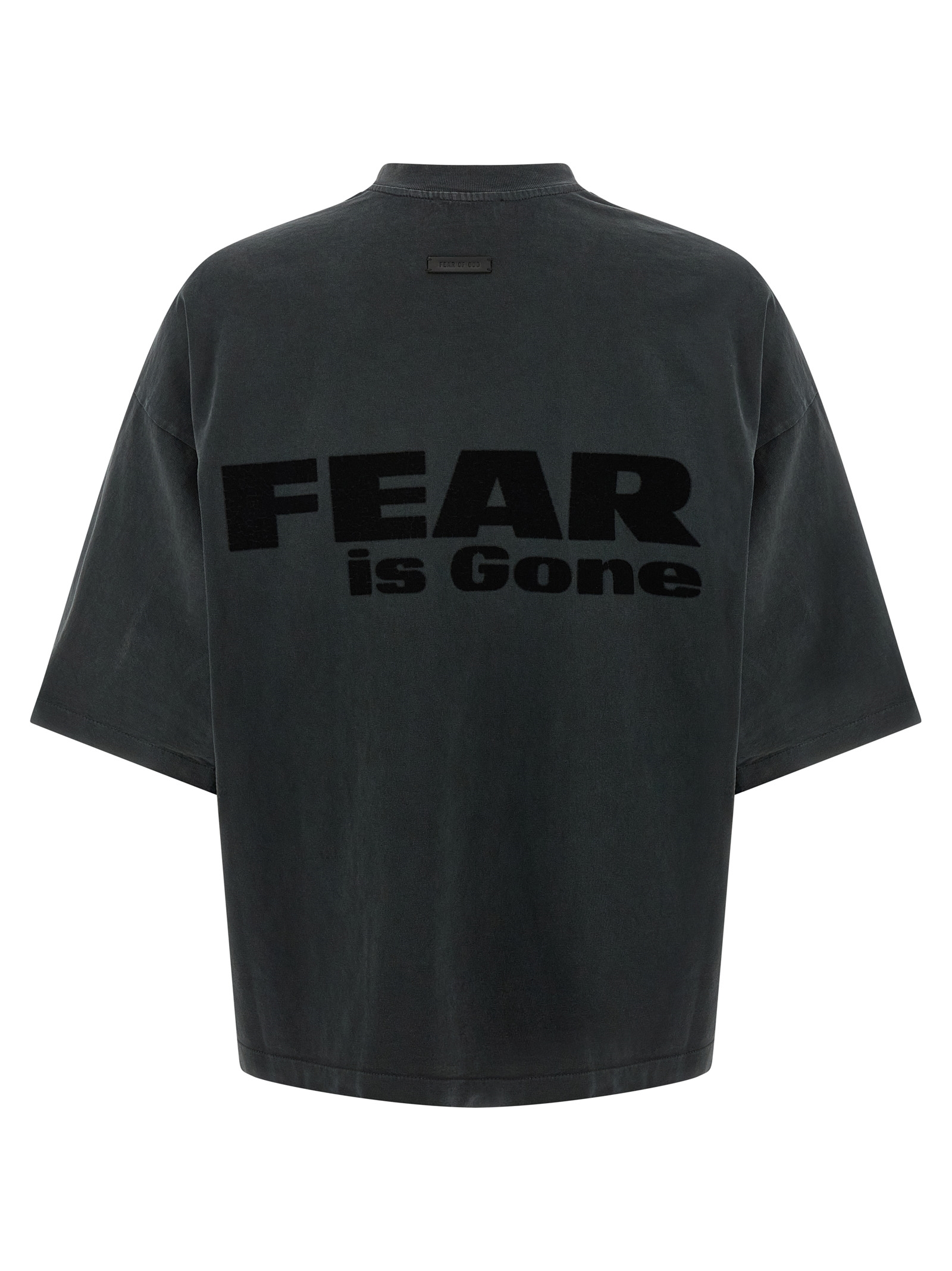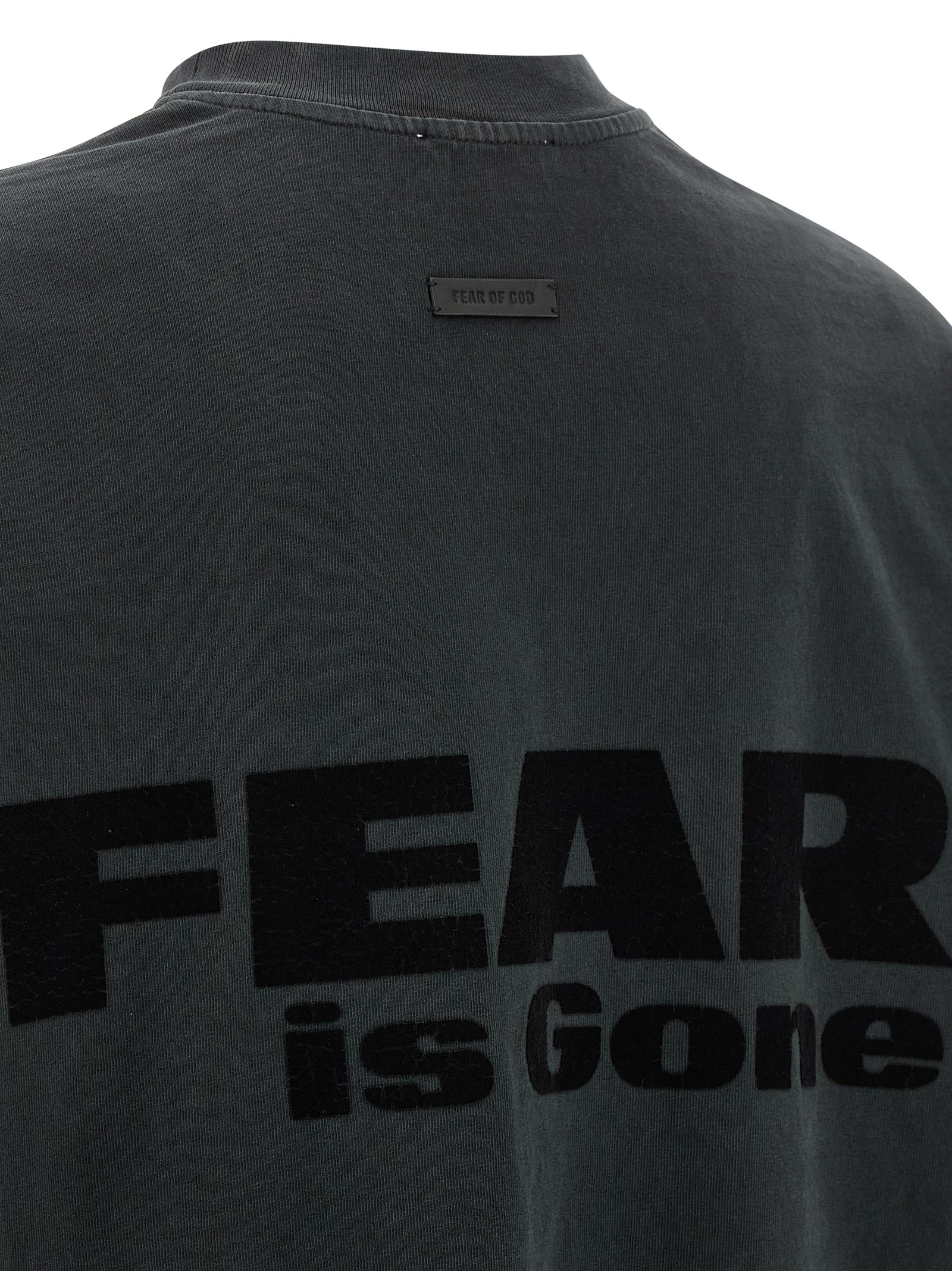 ‘Fear Is Gone’ heavy cotton jersey T-shirt with vintage sunfade treatment, front hand graphic print, flocked print and back leather logo patch, crew neck, short sleeves with dropped shoulders.