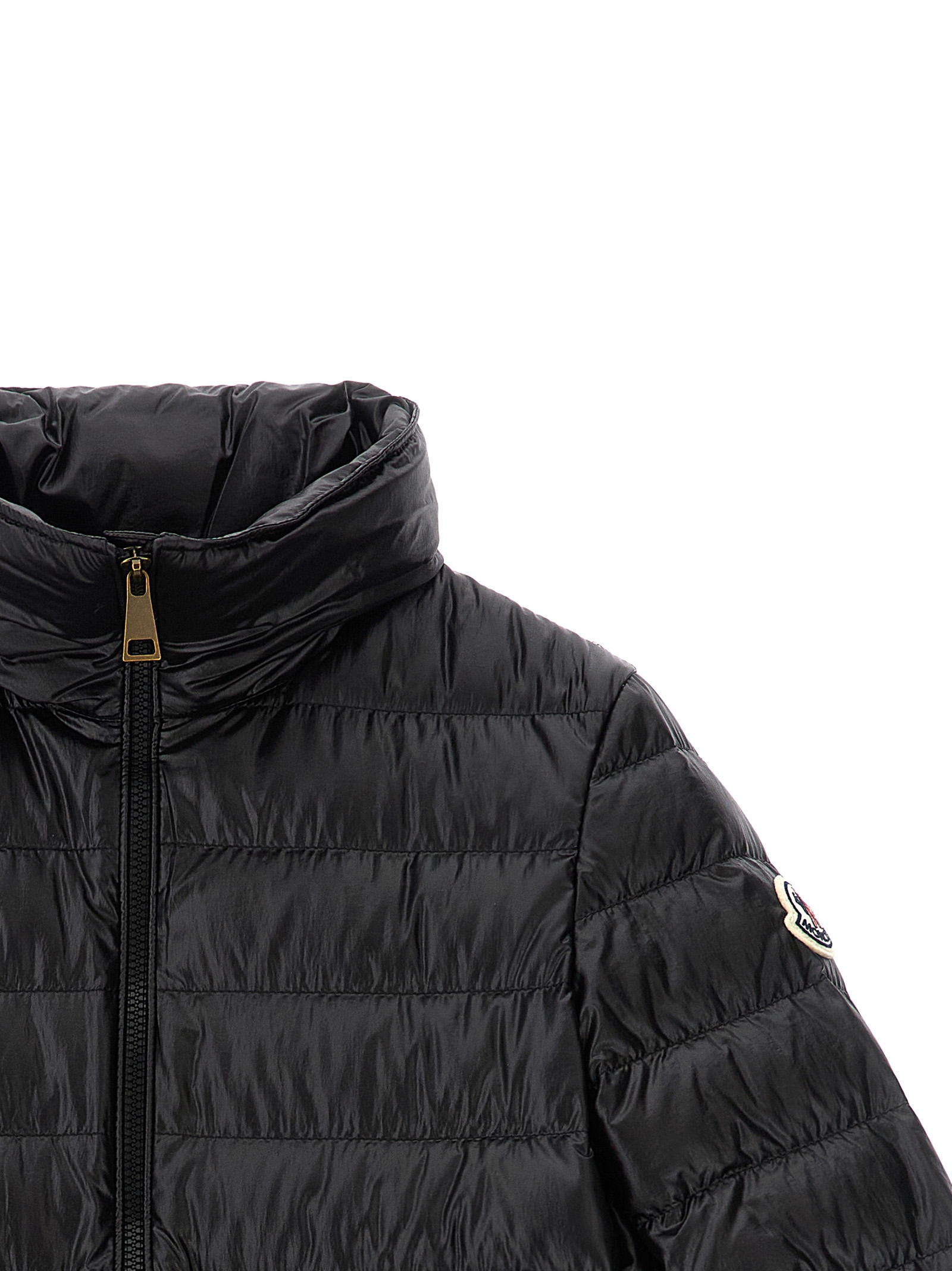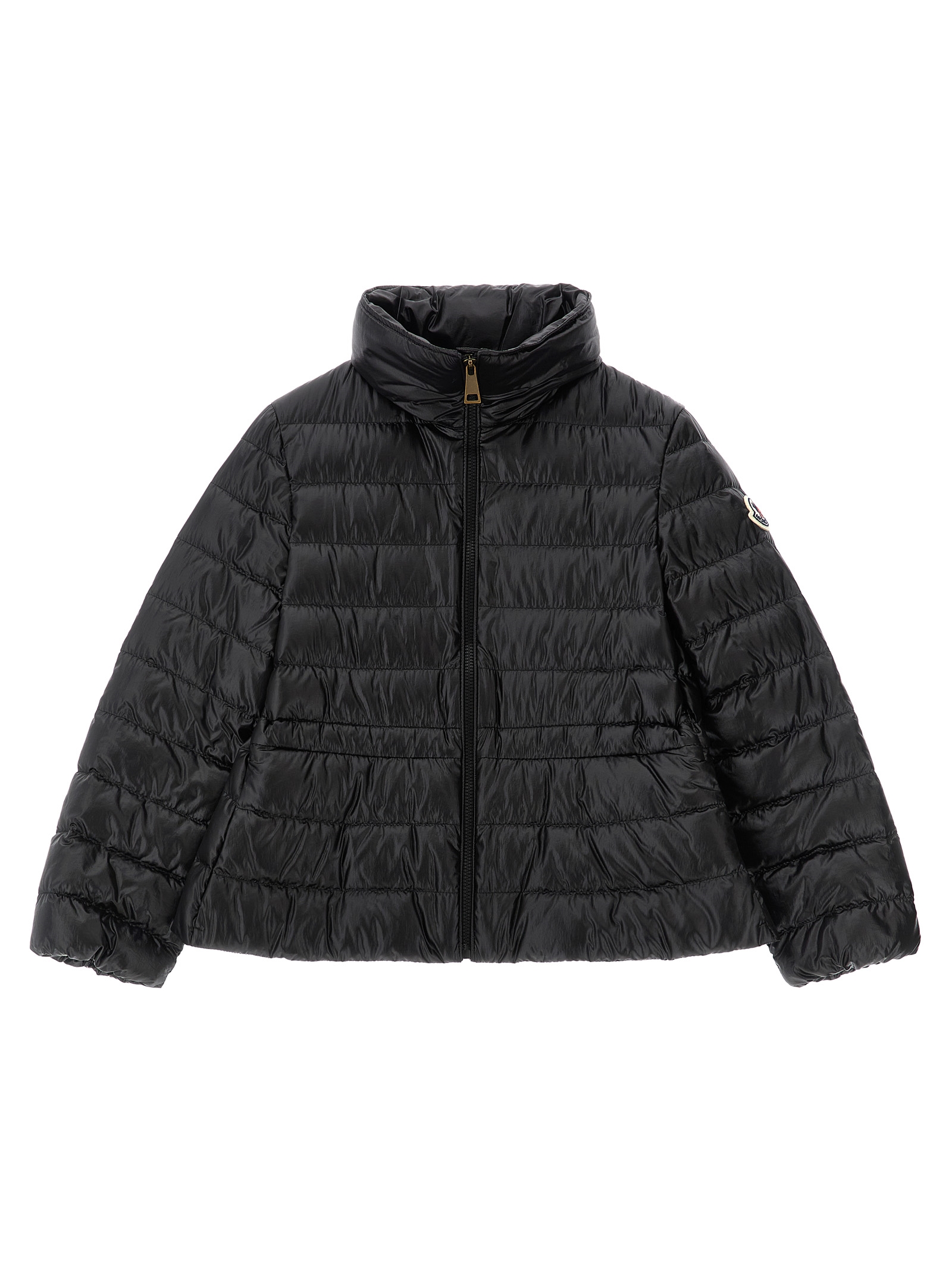 Fem’ quilted nylon down jacket, goose down padded saison longue lining, removable hood, crater neck, front zip closure, drawstring at the waist, hourglass silhouette, pockets, long sleeves with elastic cuffs and felt logo patch.