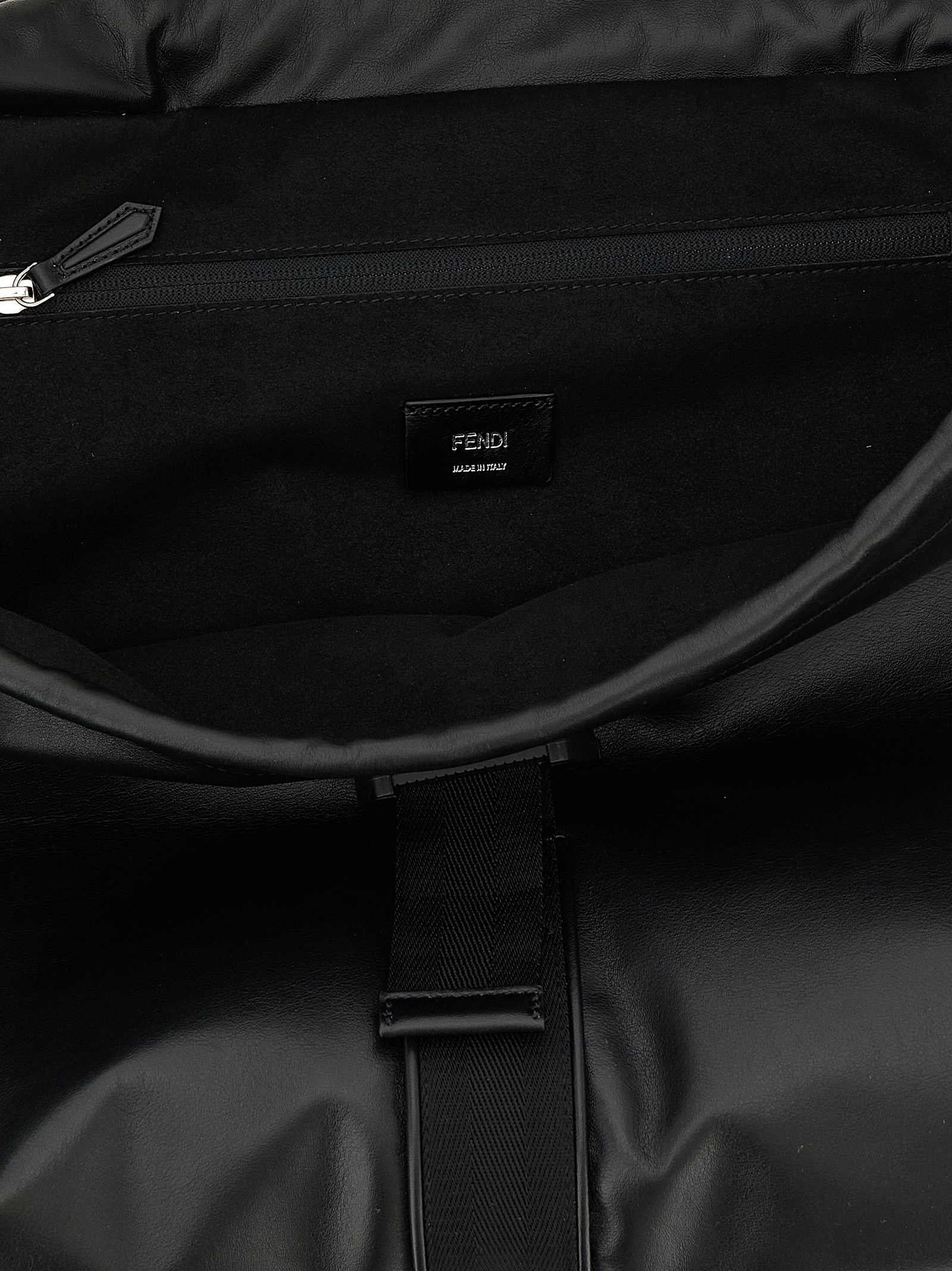 Fendi Flux’ maxi shoulder bag in smooth calf leather, flap closure with FF-shaped metal tuc, inner drawstring, removable handle, adjustable and removable tape shoulder strap.