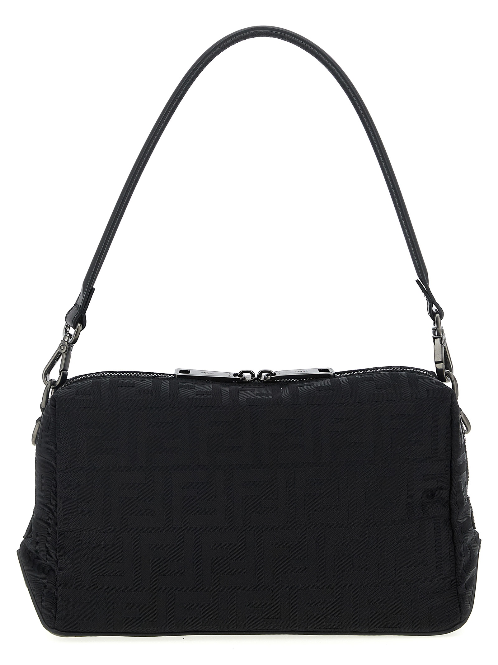 ‘Fendi Lui Medium Squared FF’ shoulder bag in padded FF nylon with tone-on-tone smooth calf leather base and handle, metallic FF logo with satin ruthenium finish on the sides, top zip closure, removable handle, adjustable and removable tape shoulder strap.