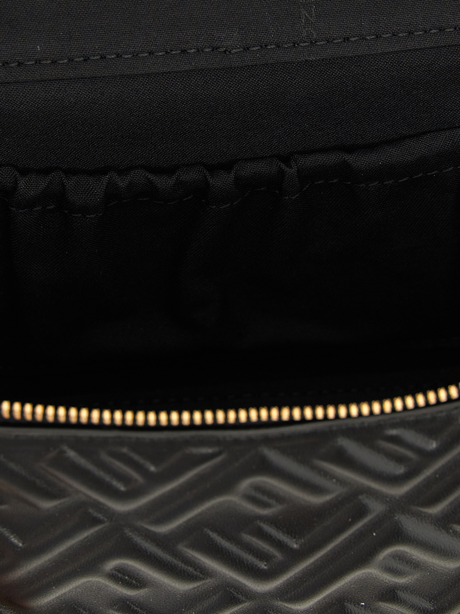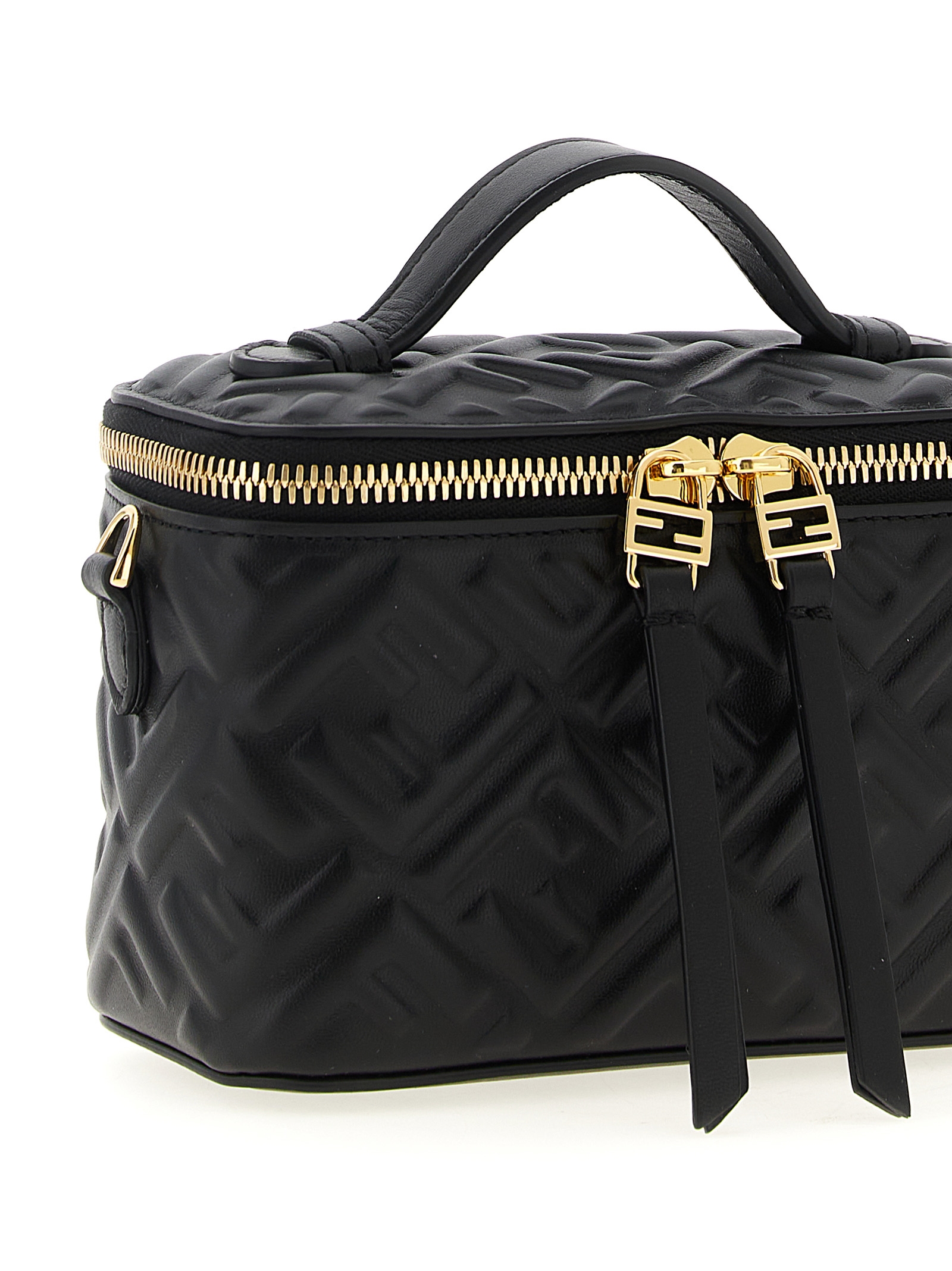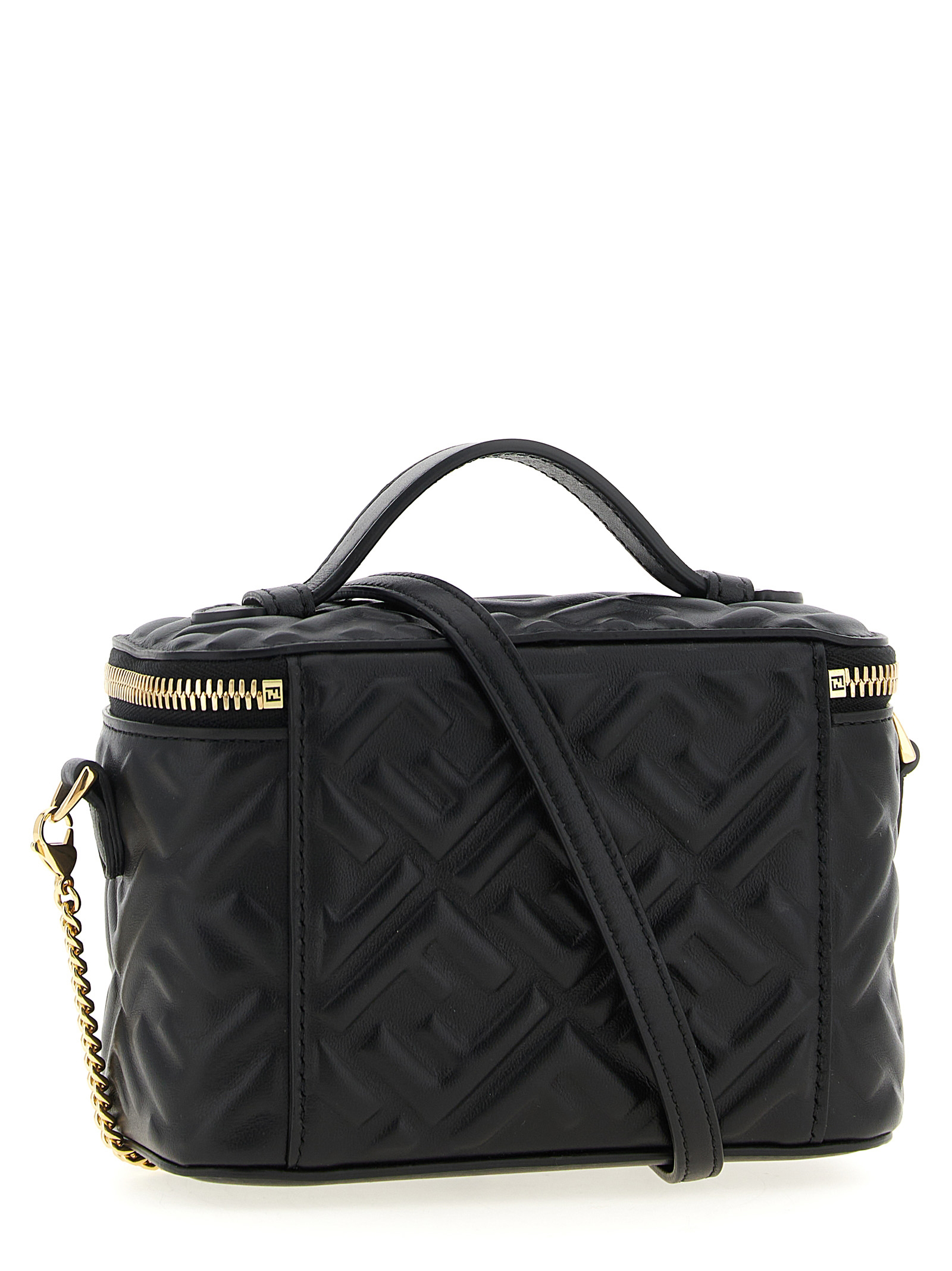 ‘Fendi Vanity’ nappa leather handbag with iconic embossed FF pattern with a three-dimensional effect, fixed handle, zip closure, chain and removable leather shoulder strap.