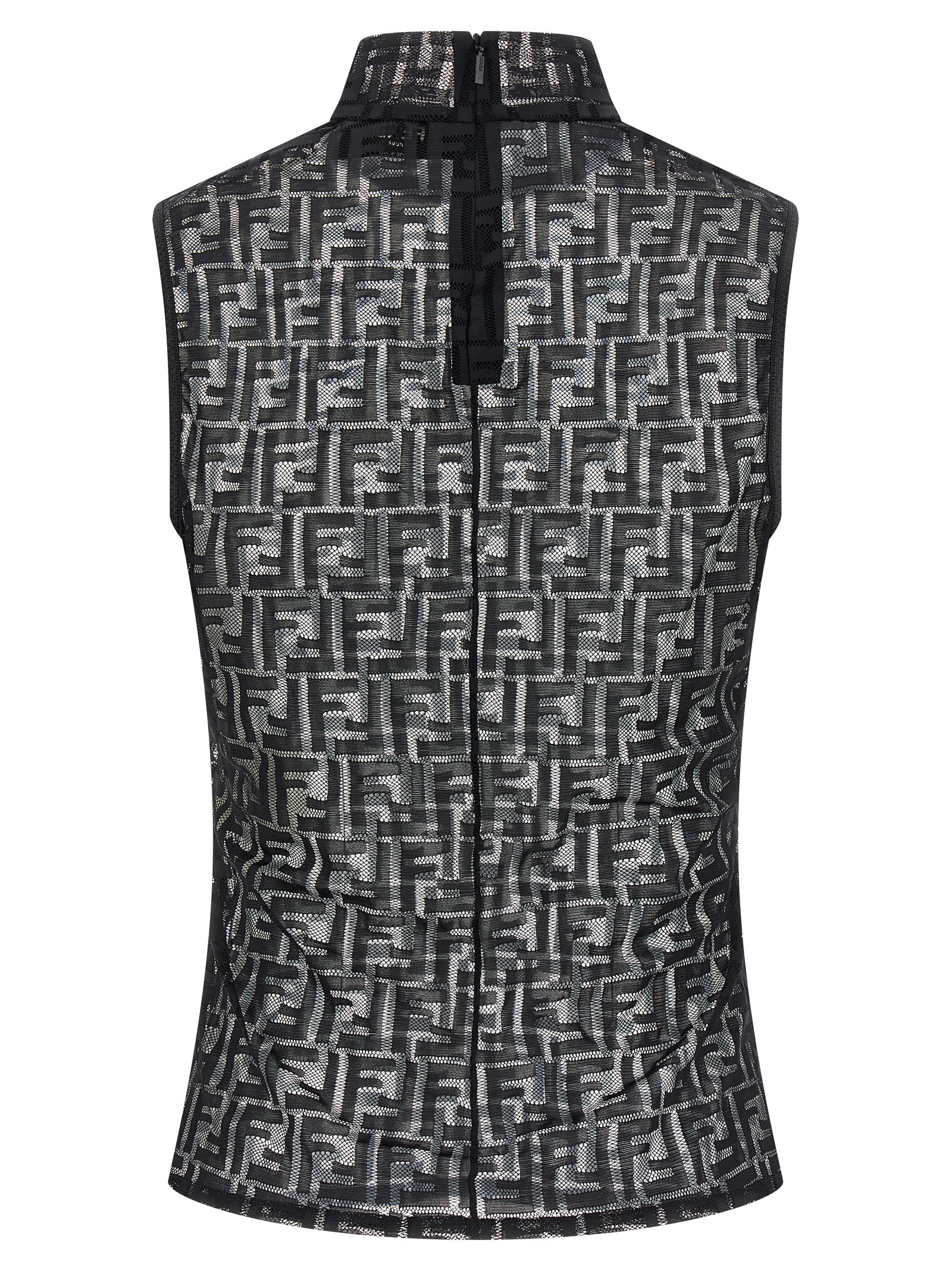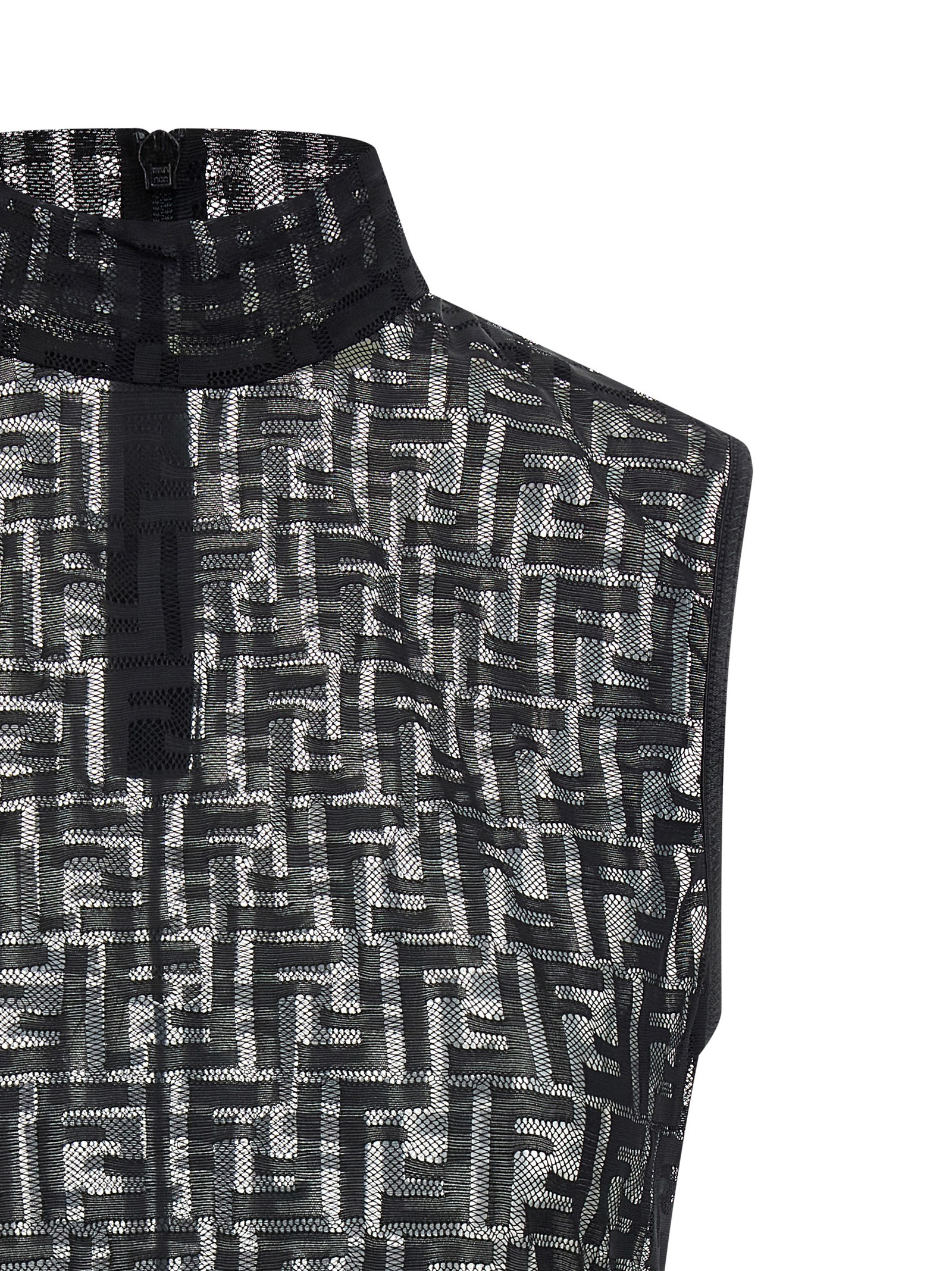All over ‘FF’ lace jersey top, transparent, high neck, back closure with hidden zip, sleeveless.