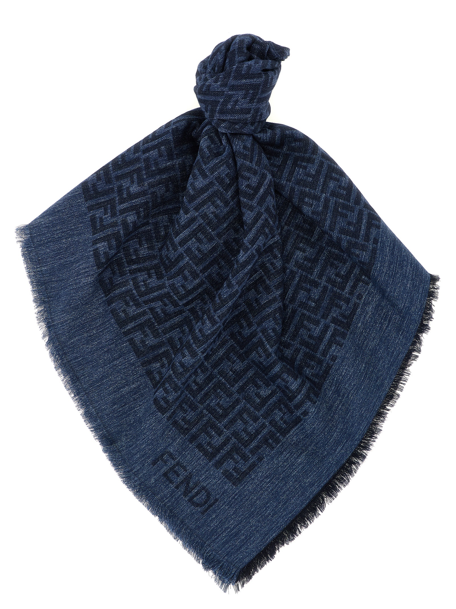 Denim-effect cotton and wool blend shawl with all-over jacquard FF pattern and fringed edges.