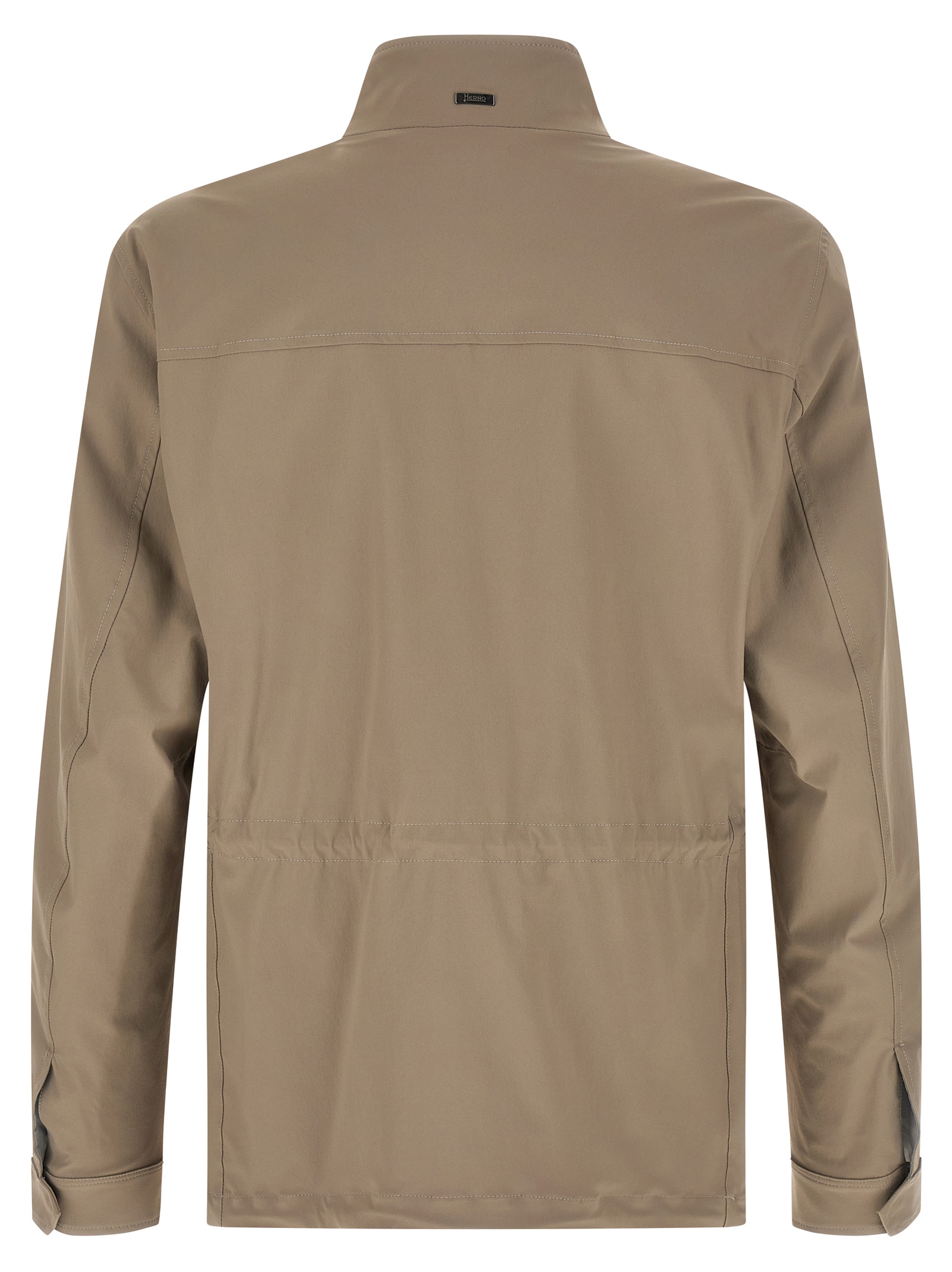 ‘Field’ stretch nylon jacket with matt tear-effect wind and rain style, Saharan style, high neck, zip and snap button closure on the front, pockets, drawstring at the waist, long sleeves with cuffs, inner backpack braces.