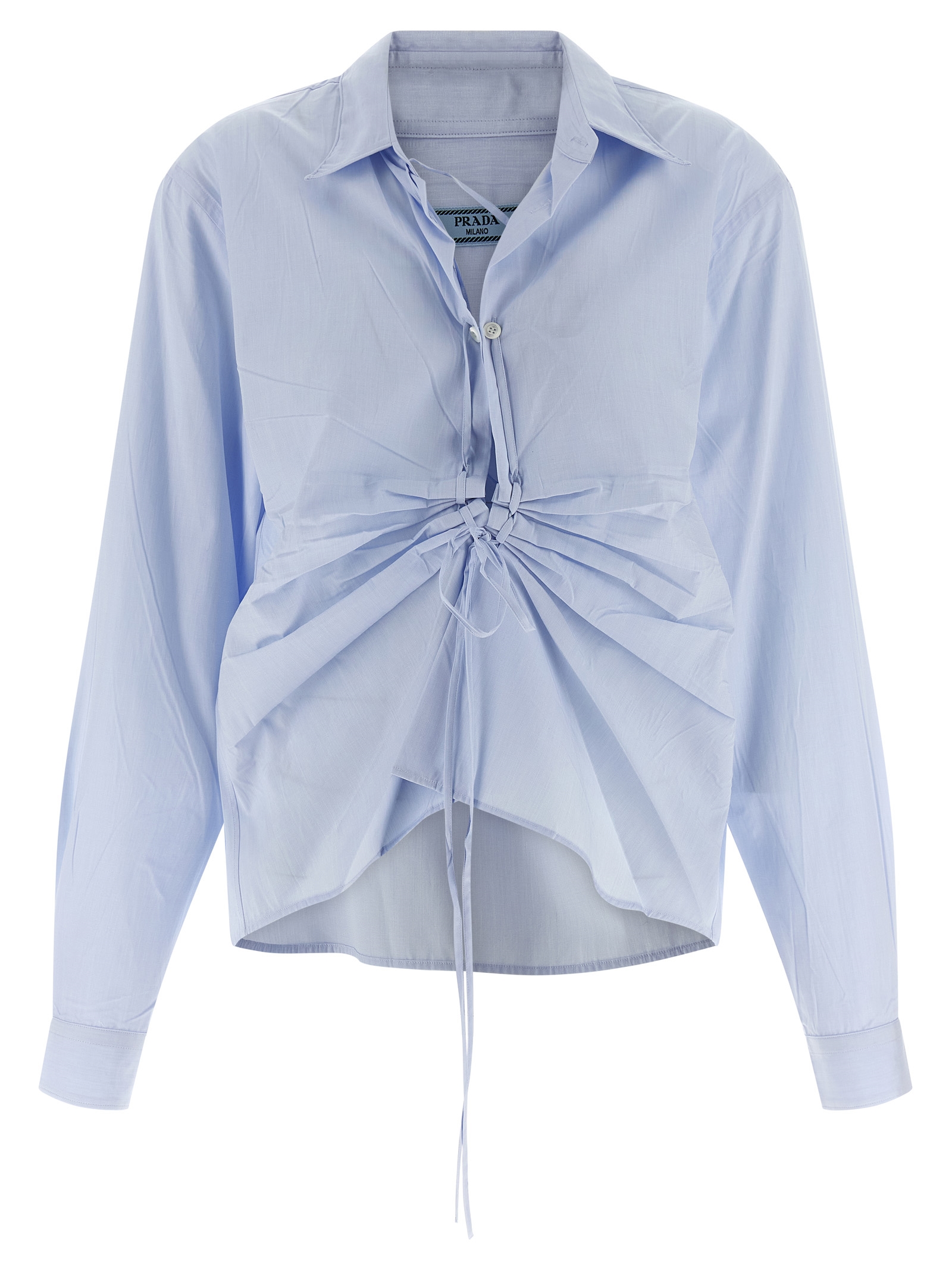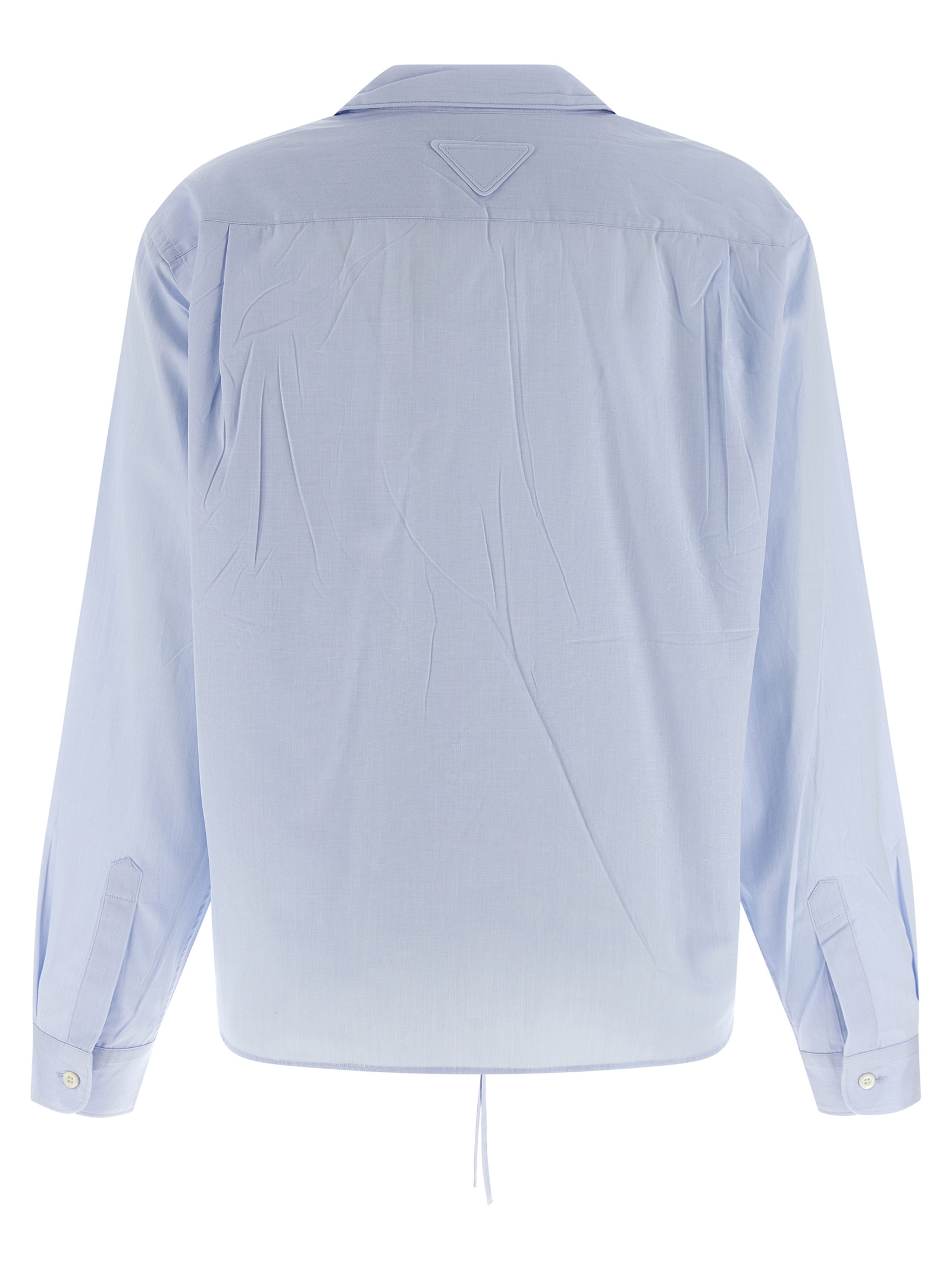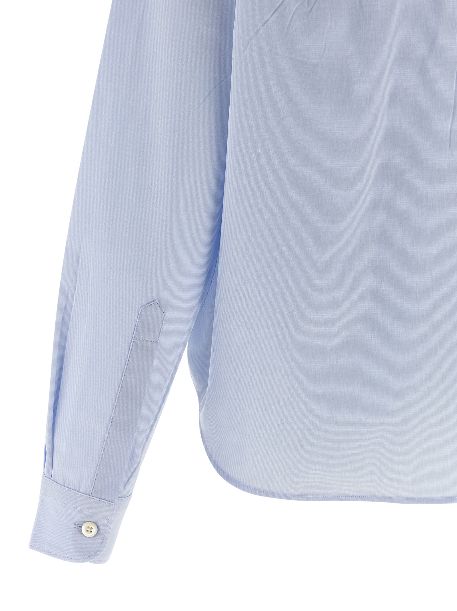 Wrinkled-effect fil-à-fil cotton shirt, draped front with tie and button closure, long sleeves with cuffs, and asymmetrical hem.