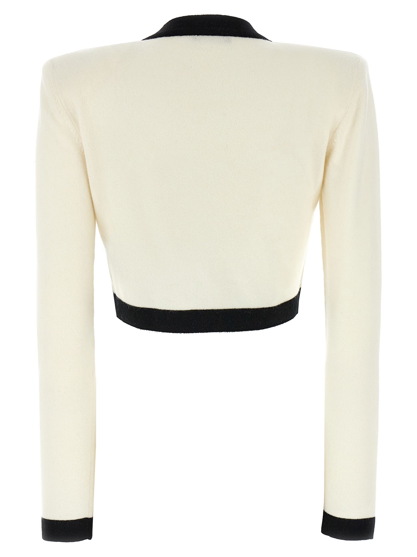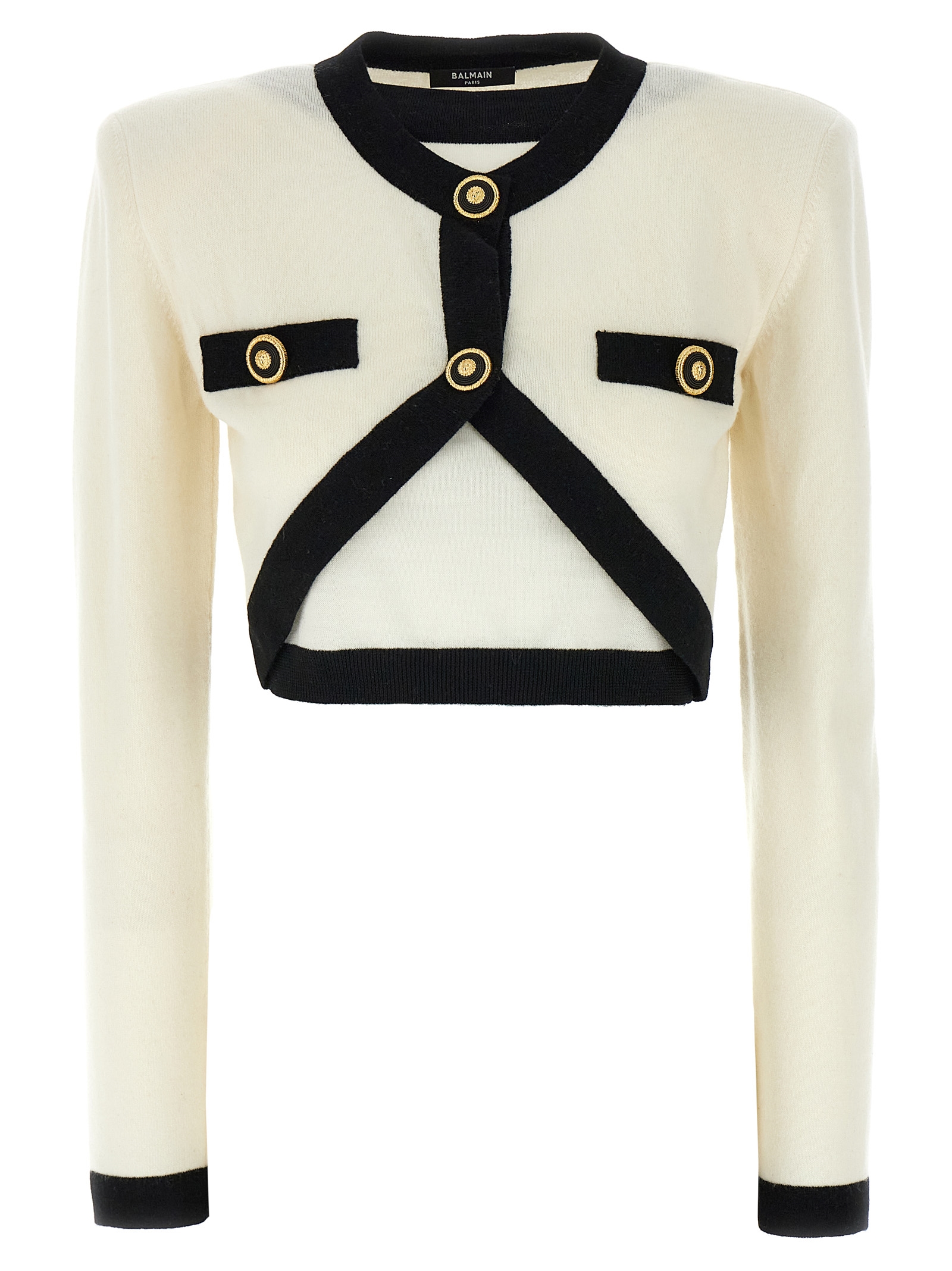 Wool and cashmere blend sweater with trompe l’oeil details and ‘Filo Leone Catena’ buttons, layered cardigan, crew neck, padded shoulders, long sleeves.