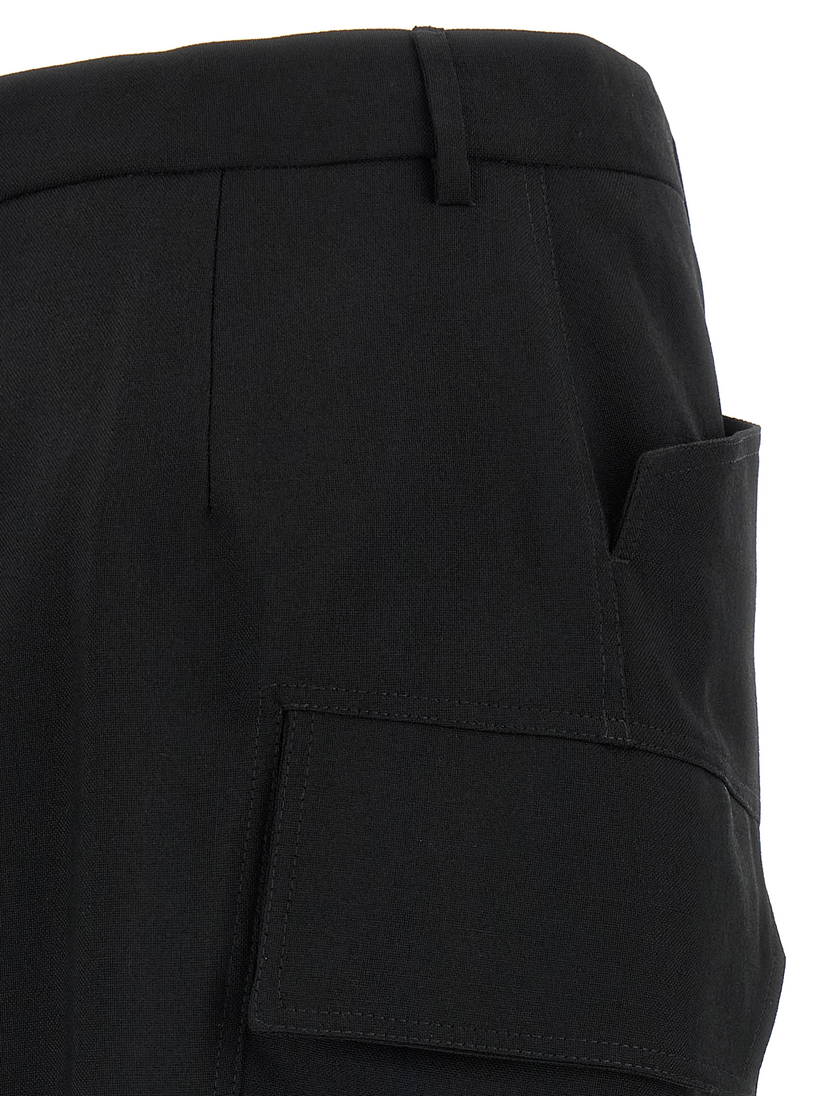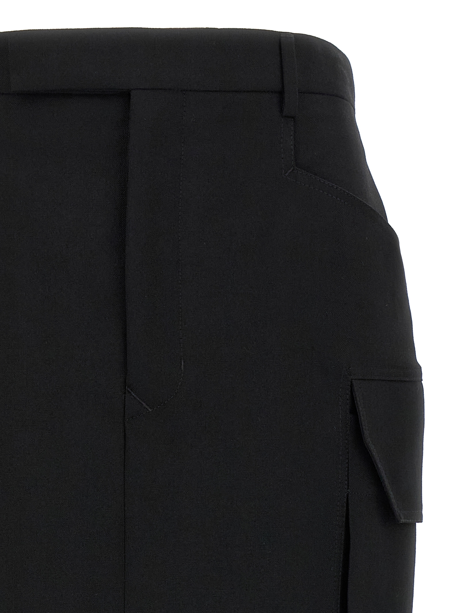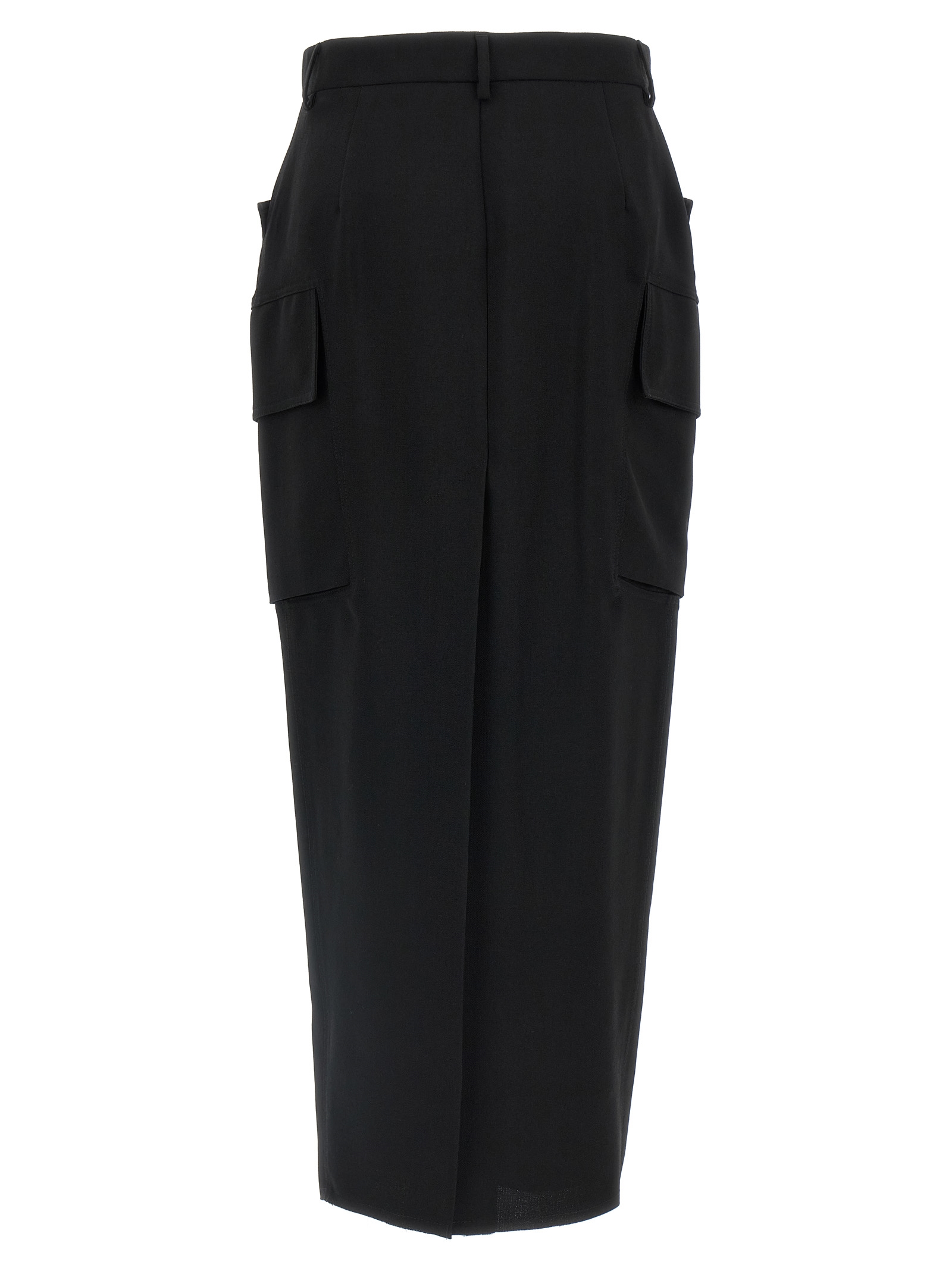 ‘Firebanks’ wool midi skirt, cupro lining, cargo style with side pockets, zip hook and front button closure, pockets, wide back split.