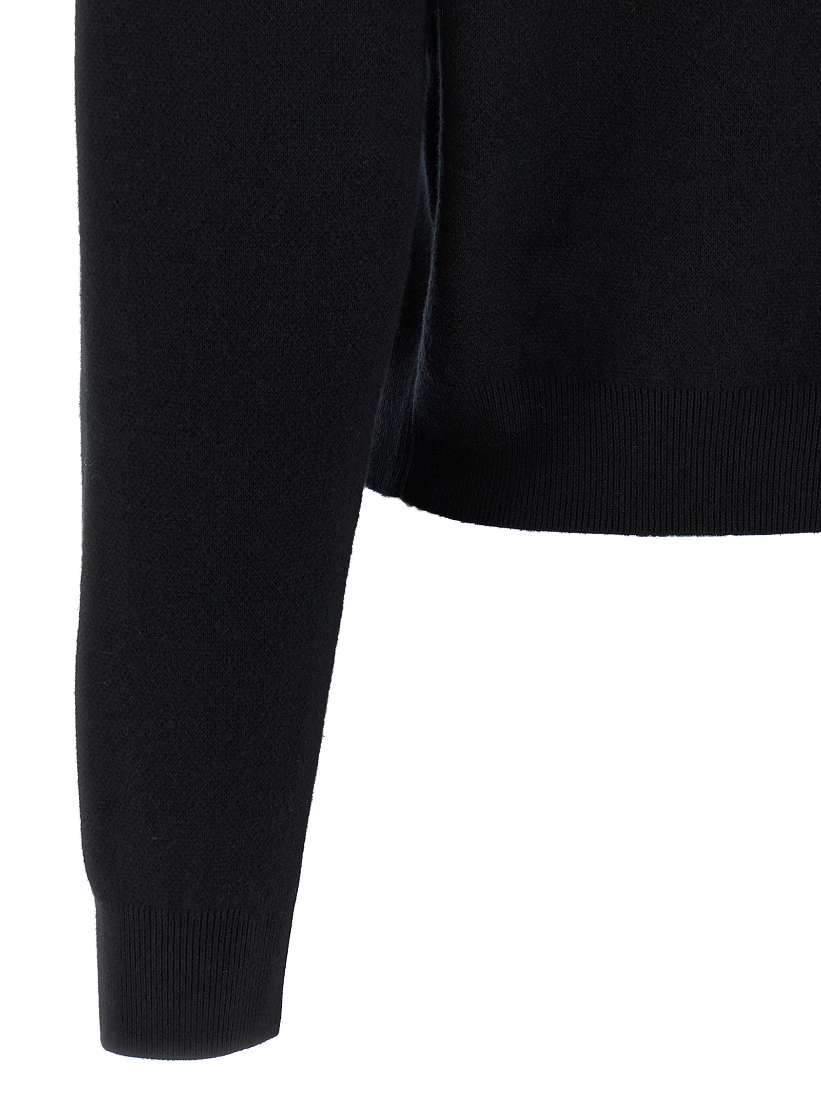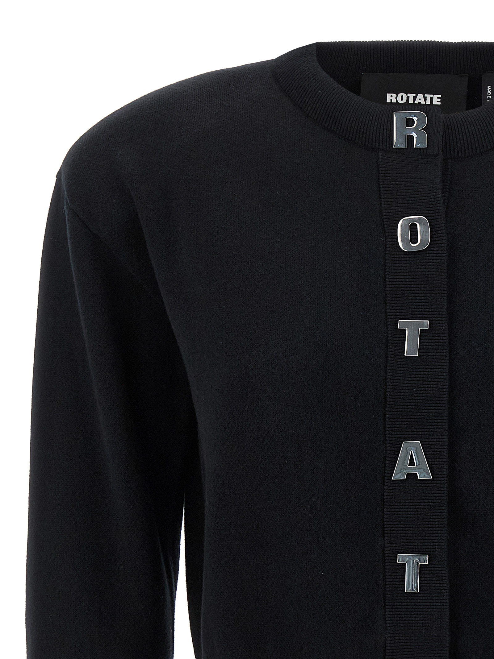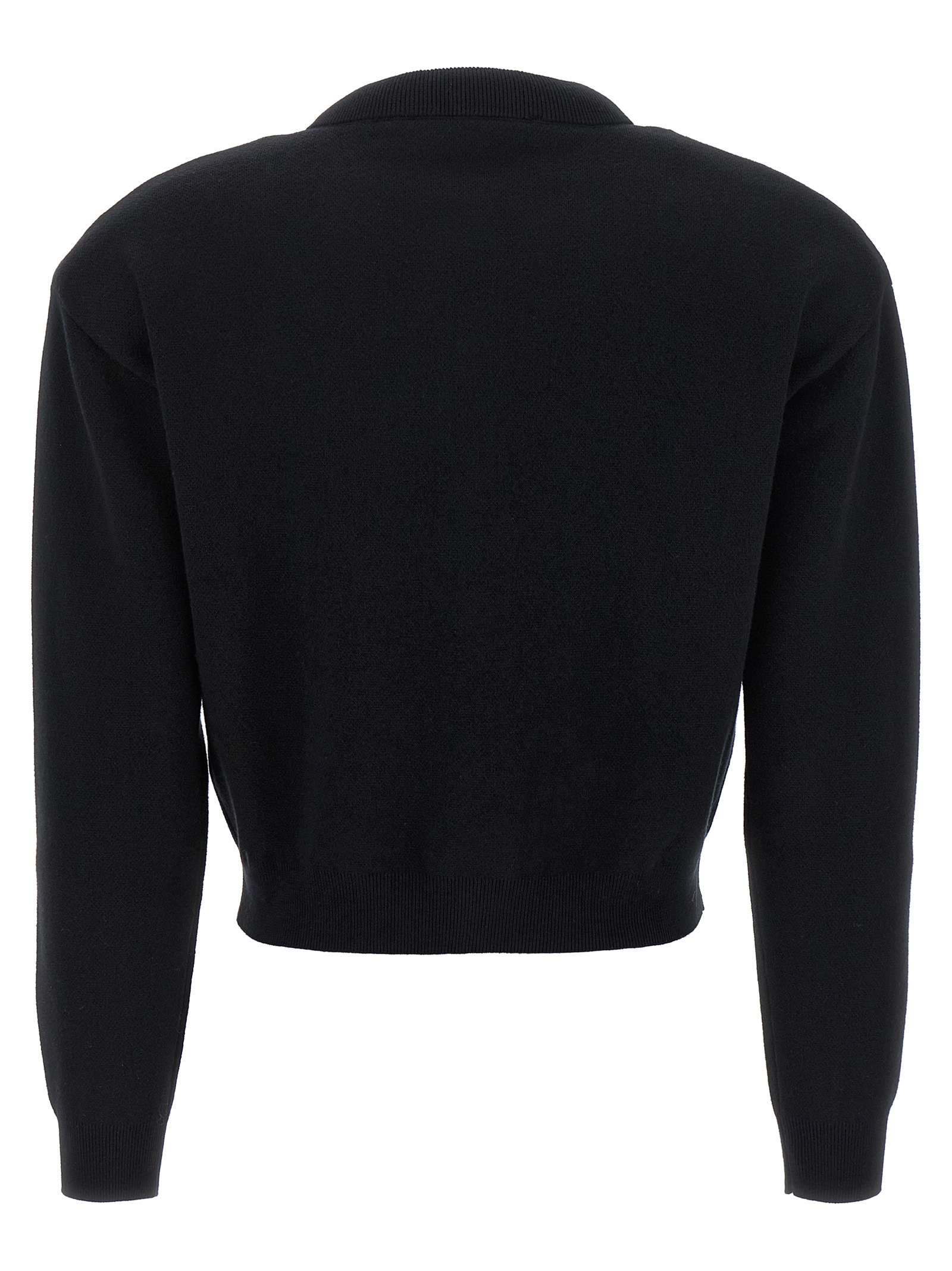 ‘Firm Knit’ cashmere blend cotton cardigan with button closure that form the brand logo, crop style, crew neck, long sleeves with cuffs and removable padded shoulders.