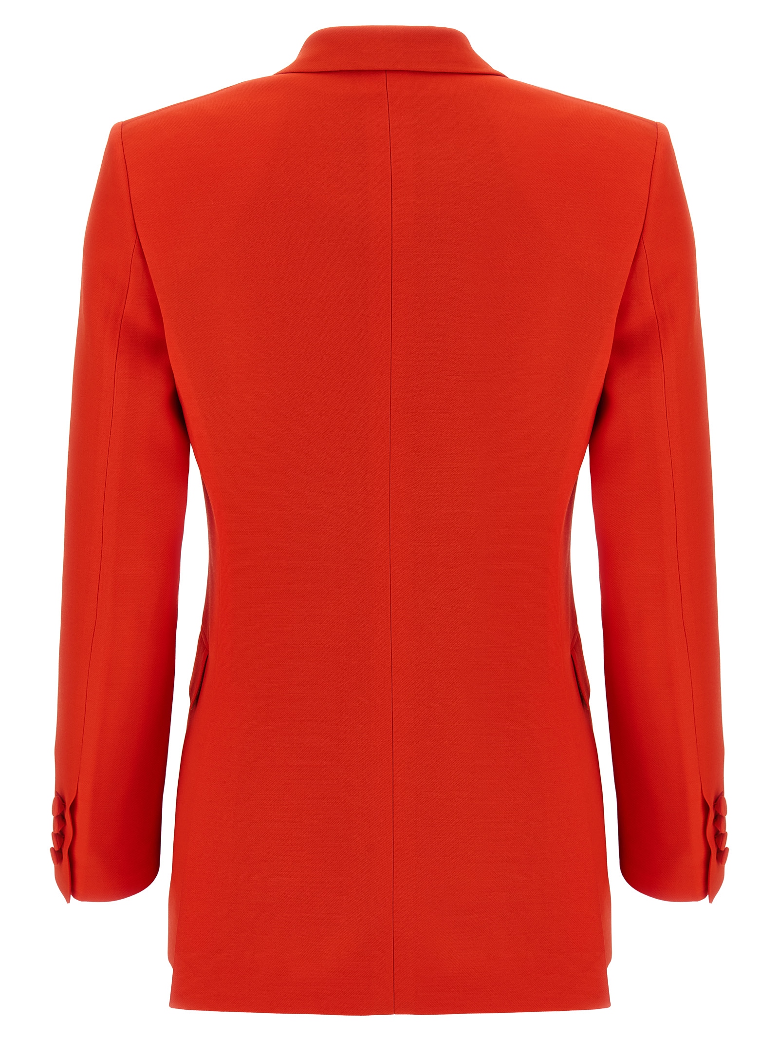 ‘Flavia’ double-breasted blazer in wool and silk blend with front button closure, peak lapels, breast pocket, flap pockets, structured shoulder strap, long sleeves, side slits, cupro lining.
