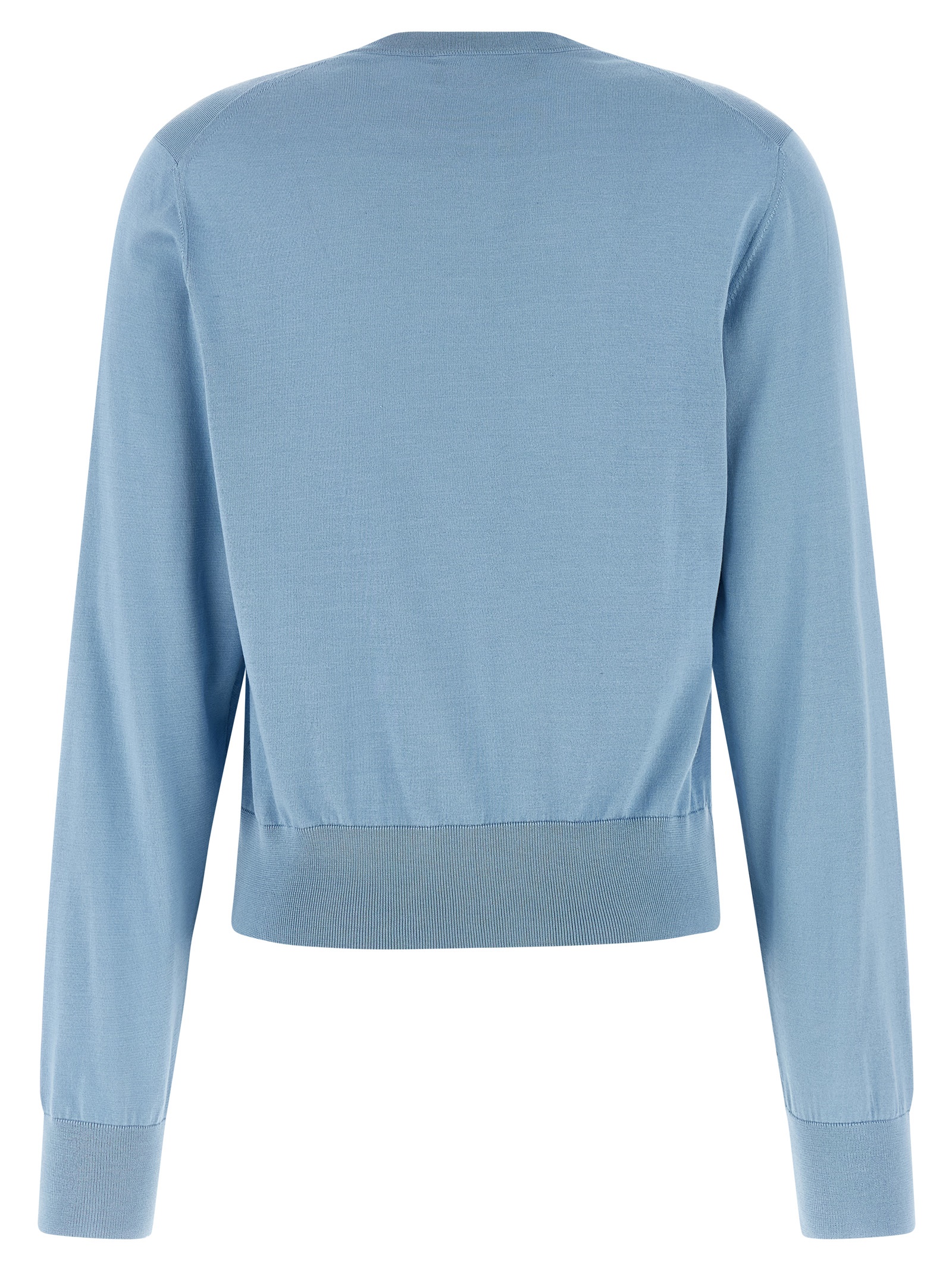 Silk cardigan, patch with floral embroidery and front beads, mother-of-pearl button closure, crew neck, long sleeves with cuffs, band on the hem.
