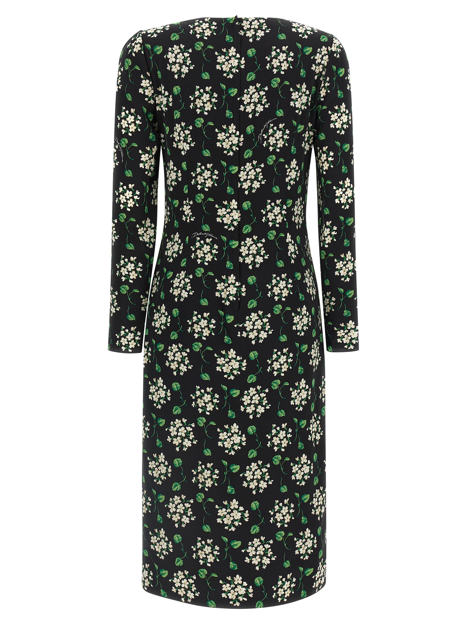 Silk charmeuse midi dress with all-over flower print, crew neck style, side draping with split, back zip closure, long sleeves.