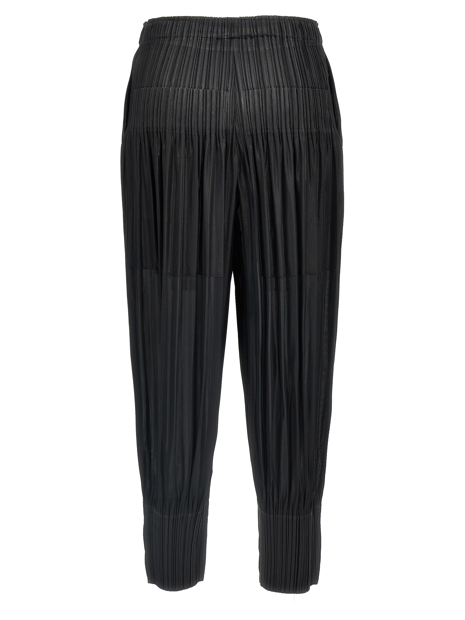 ‘Fluffy Basics’ pleated fabric pants, elastic waistband, side and back pockets, slightly cropped fit, wider leg narrower at the hem.