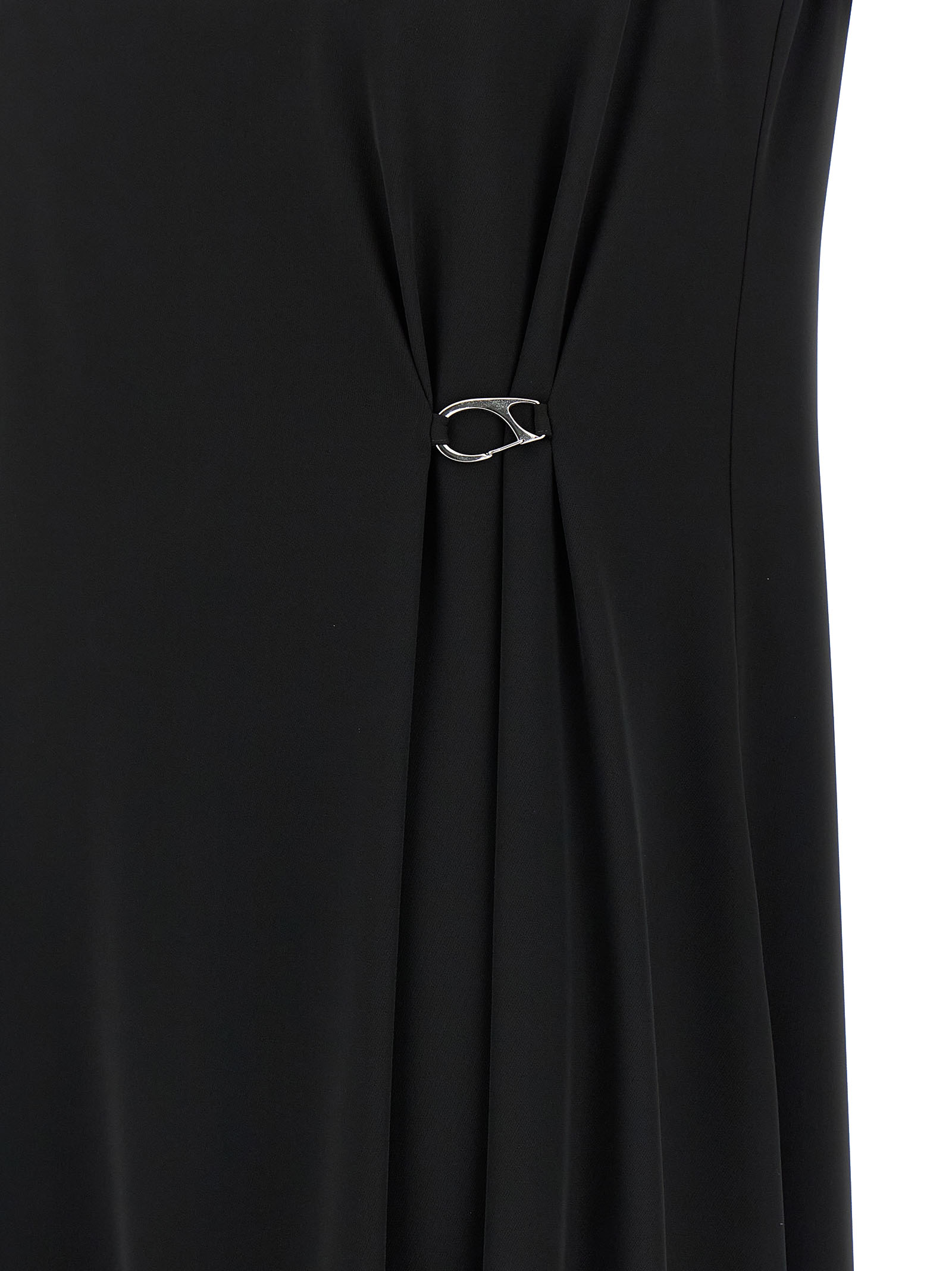 Long fluid fabric dress with diagonal armor, front metal hook detail to create side drapes, flared silhouette, round neckline with button closure and back teardrop cut-out detail.