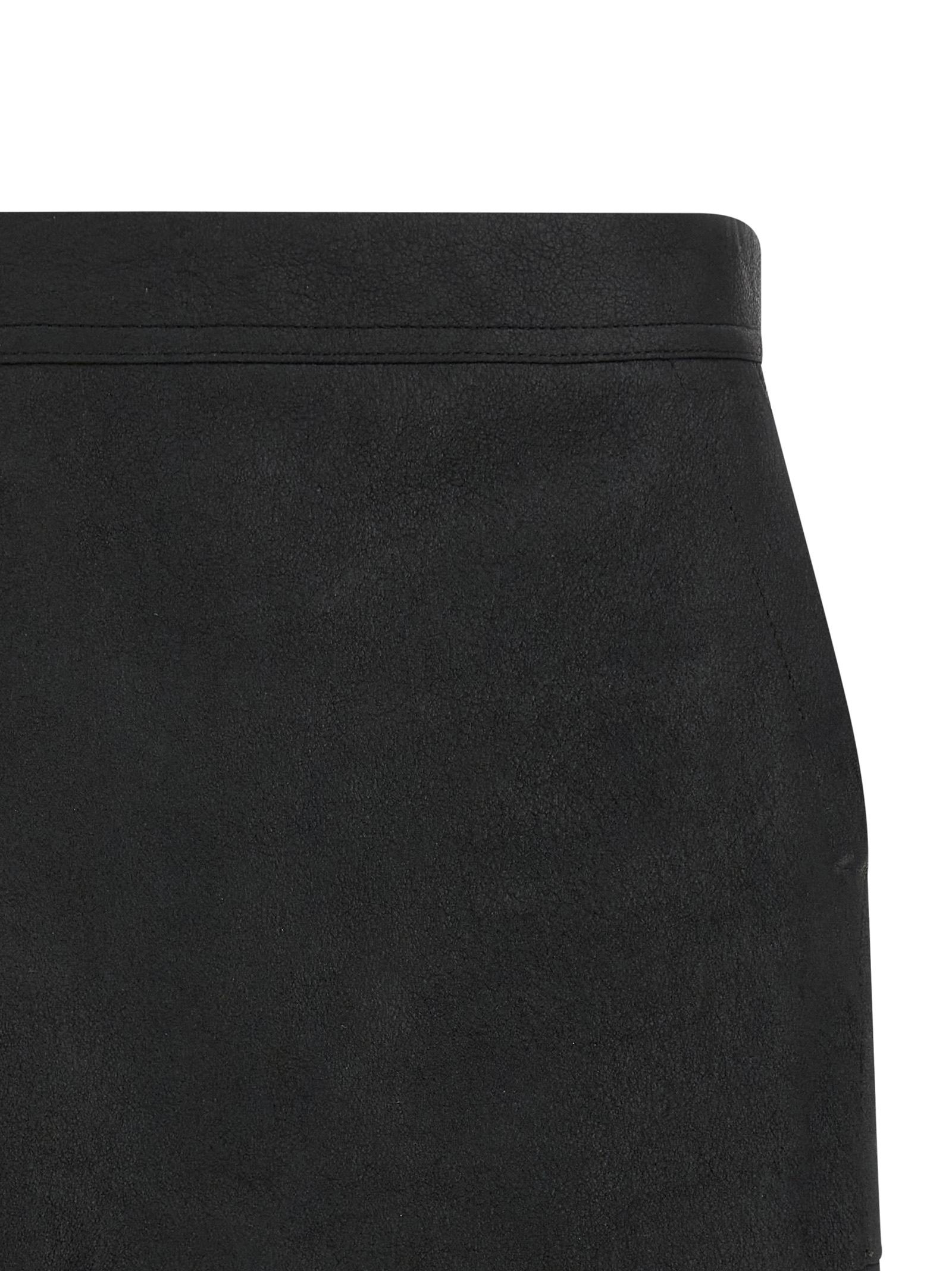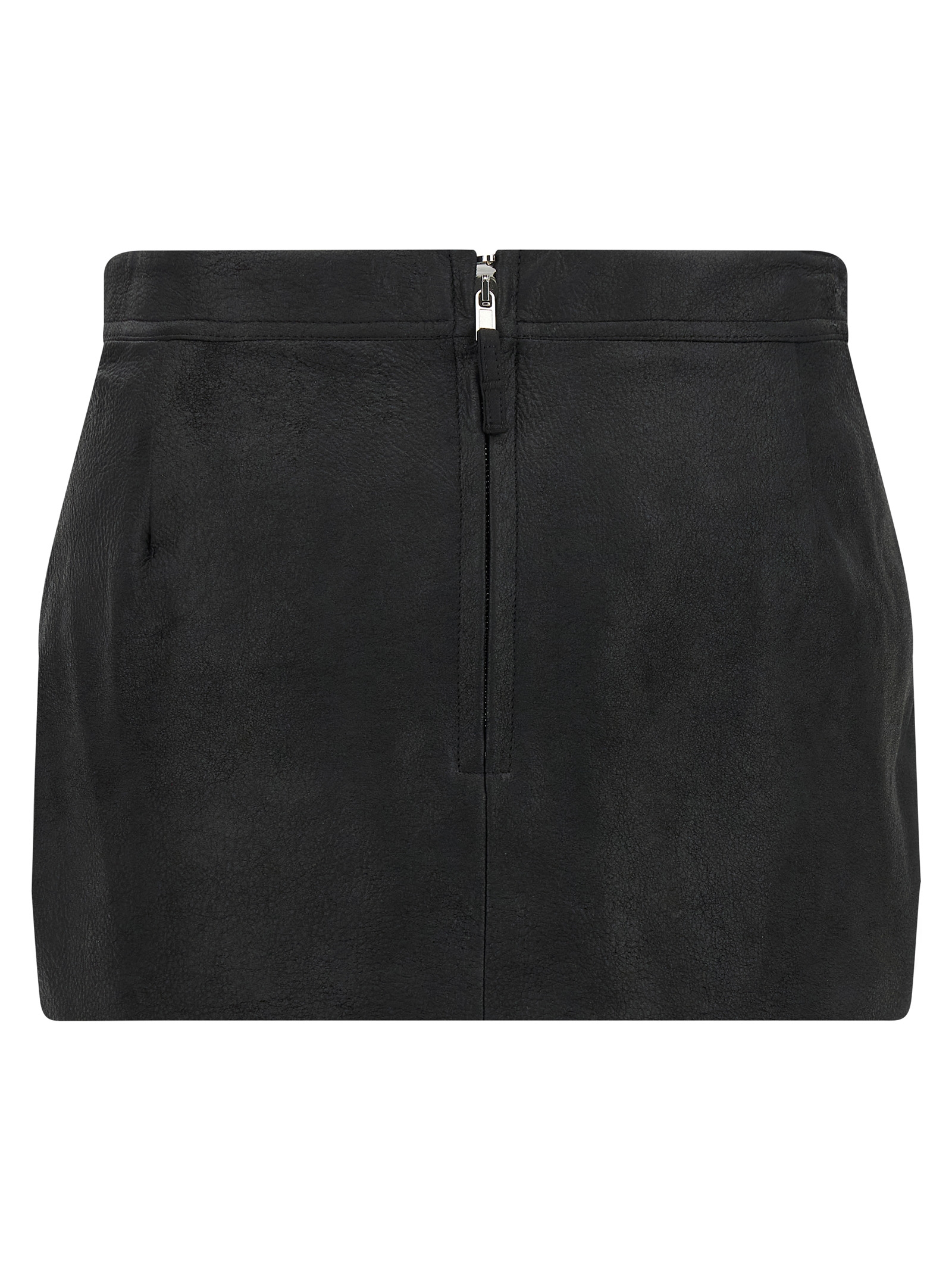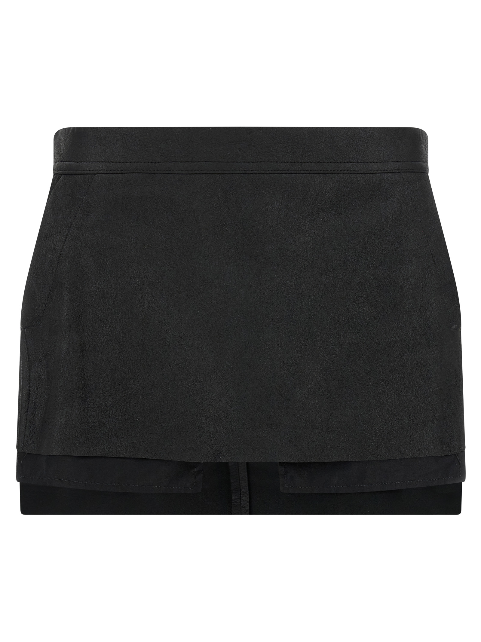 ‘Fog Cutoff’ mini skirt in leather, asymmetrical, with side pockets and back zip closure.
