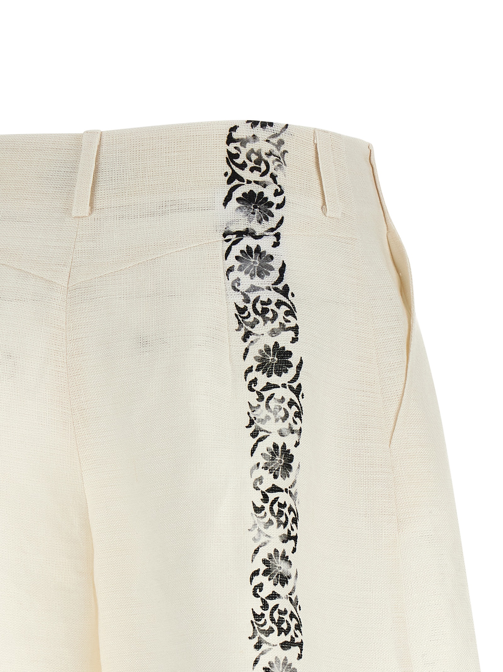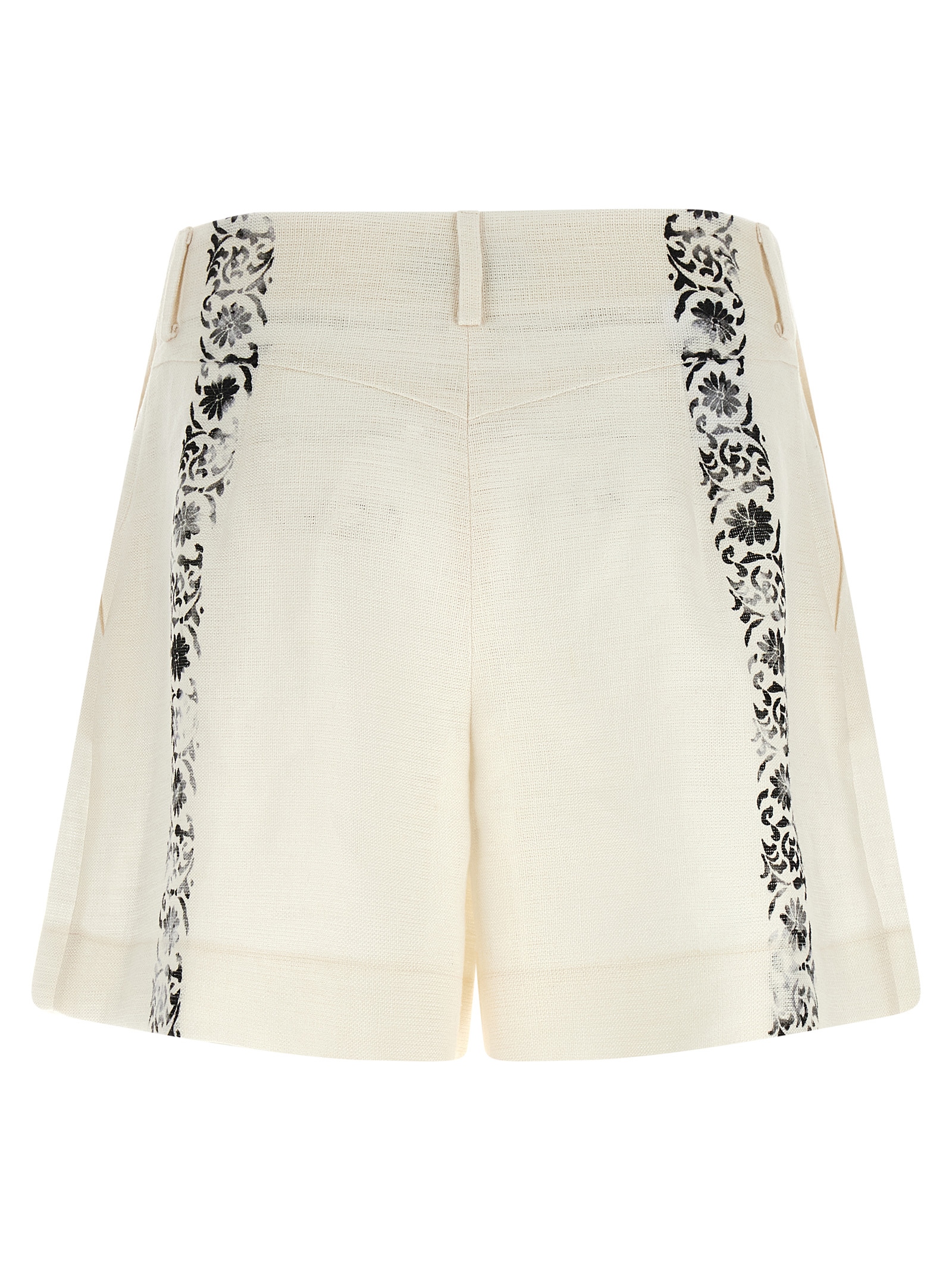 Pure linen shorts with ‘Fortuny’ inspired print with stripes and geometries obtained by placed print, high waist, pins, wide leg, zip and front button closure, French pockets.