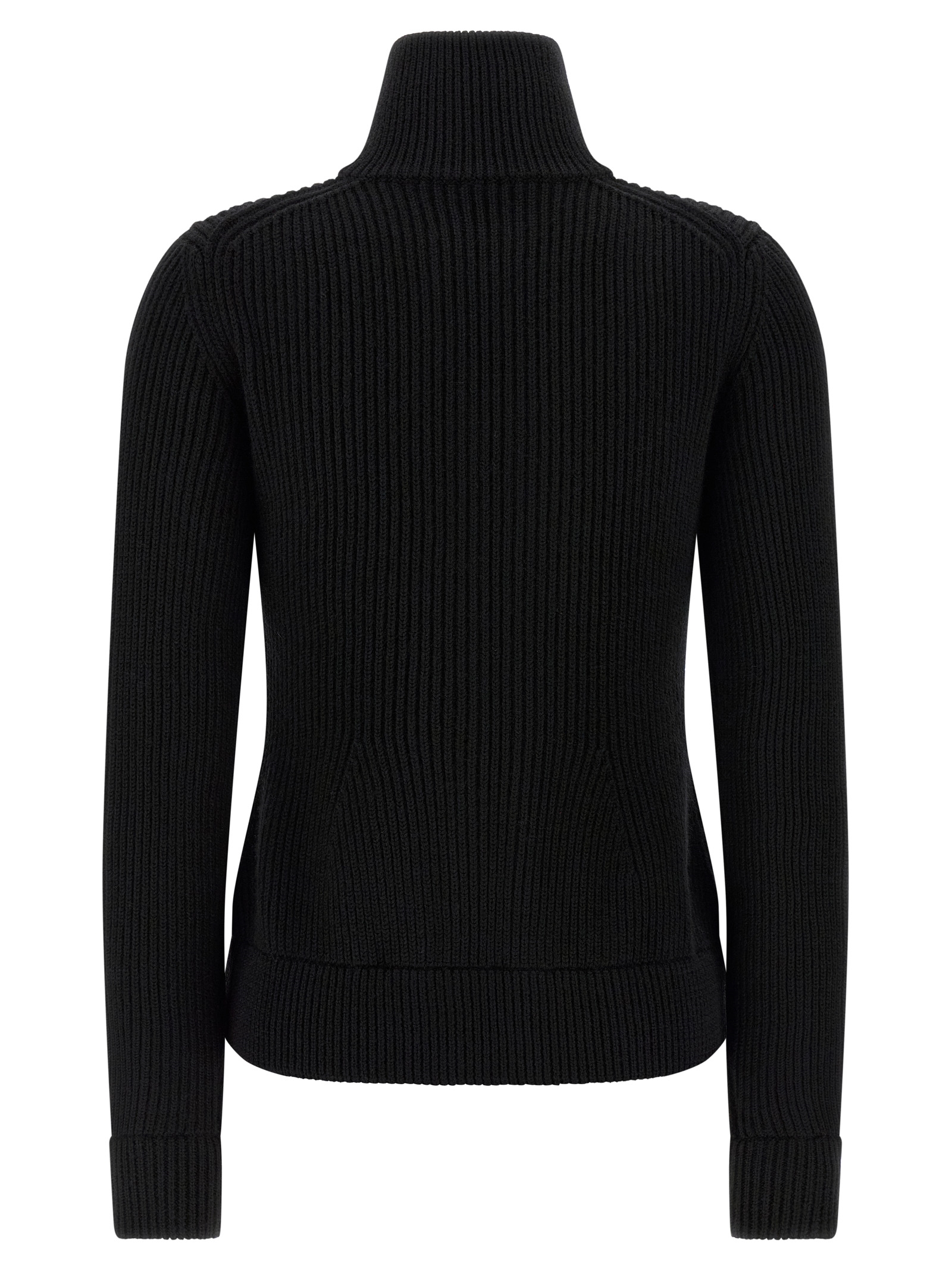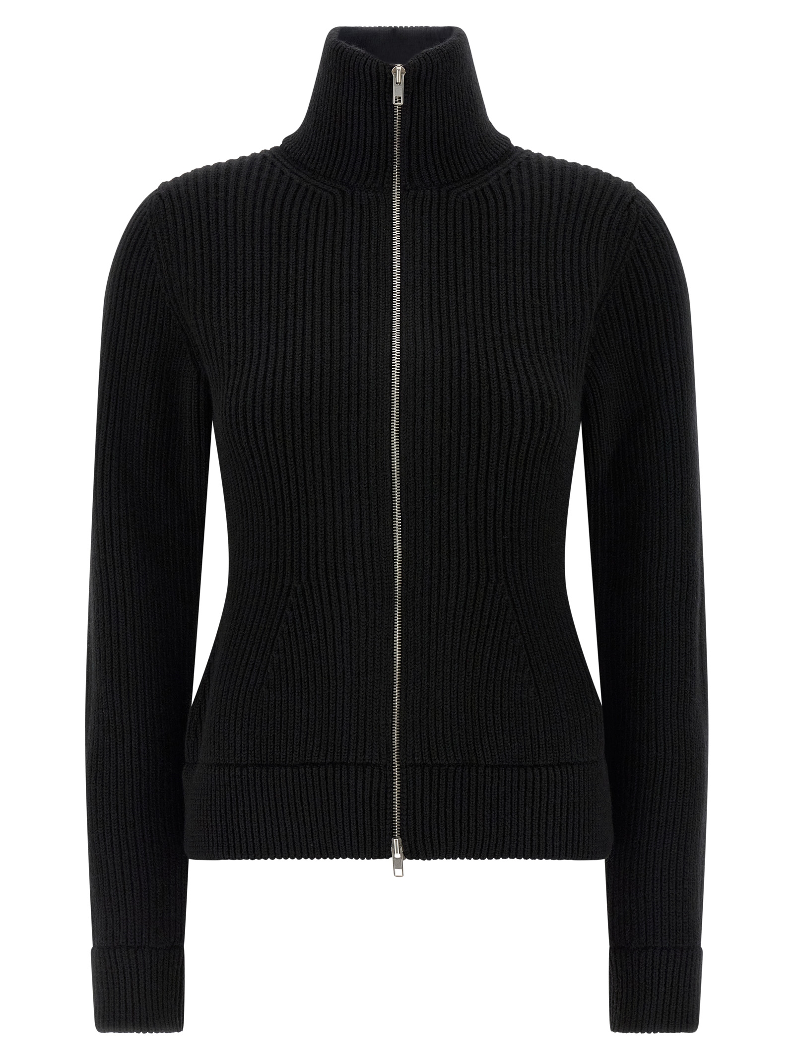 Knitted virgin wool cardigan, high neck, front zip closure, long cuffed sleeves, back ‘Four stitches’.