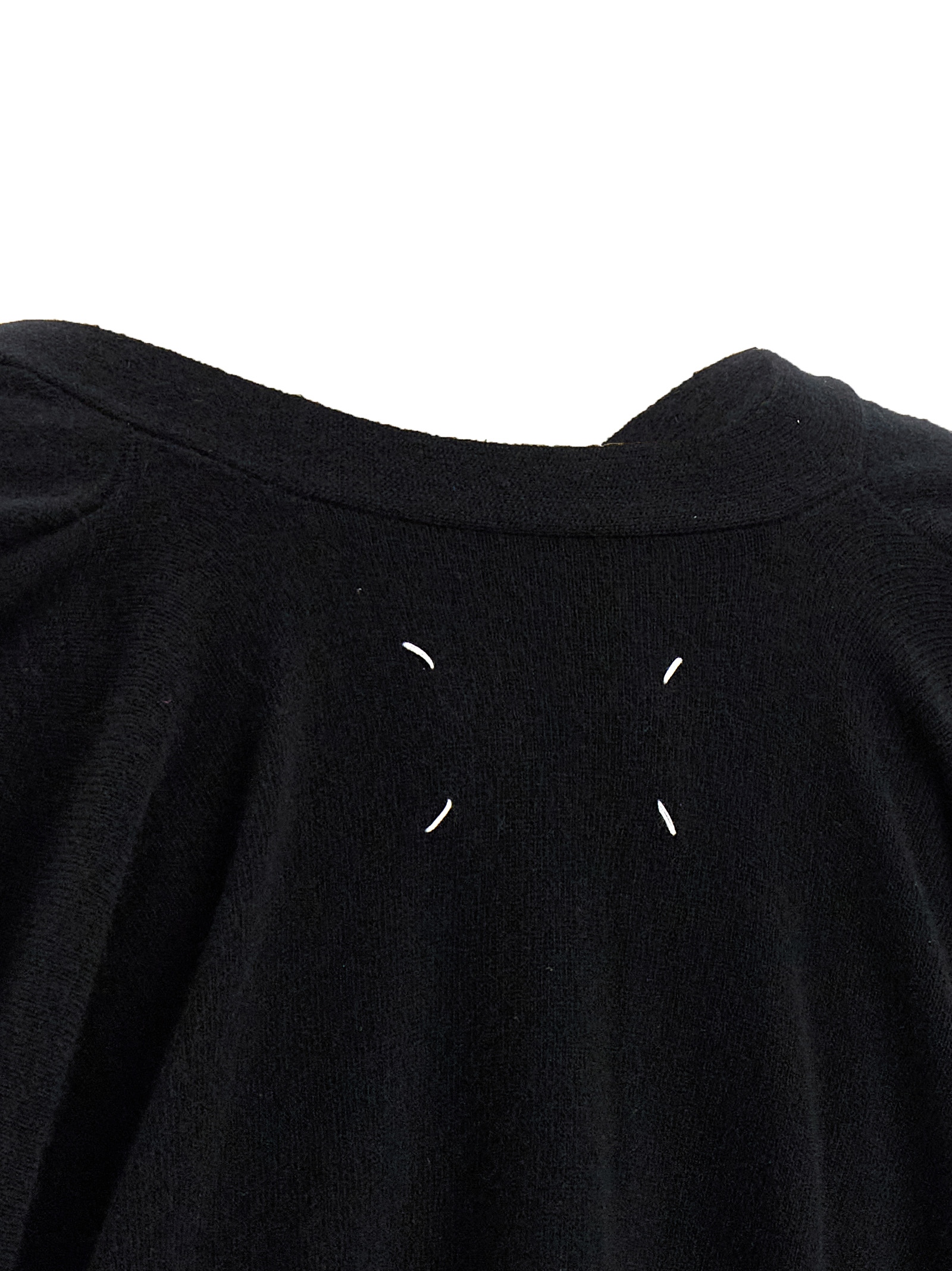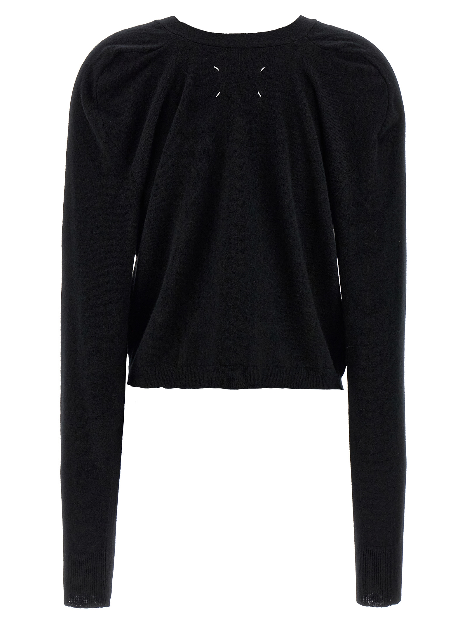 Wool cardigan, slightly cropped model, V-neck, front button closure, pockets, long sleeves with ruffles on the shoulders, ‘Four Stitches’ at the back.