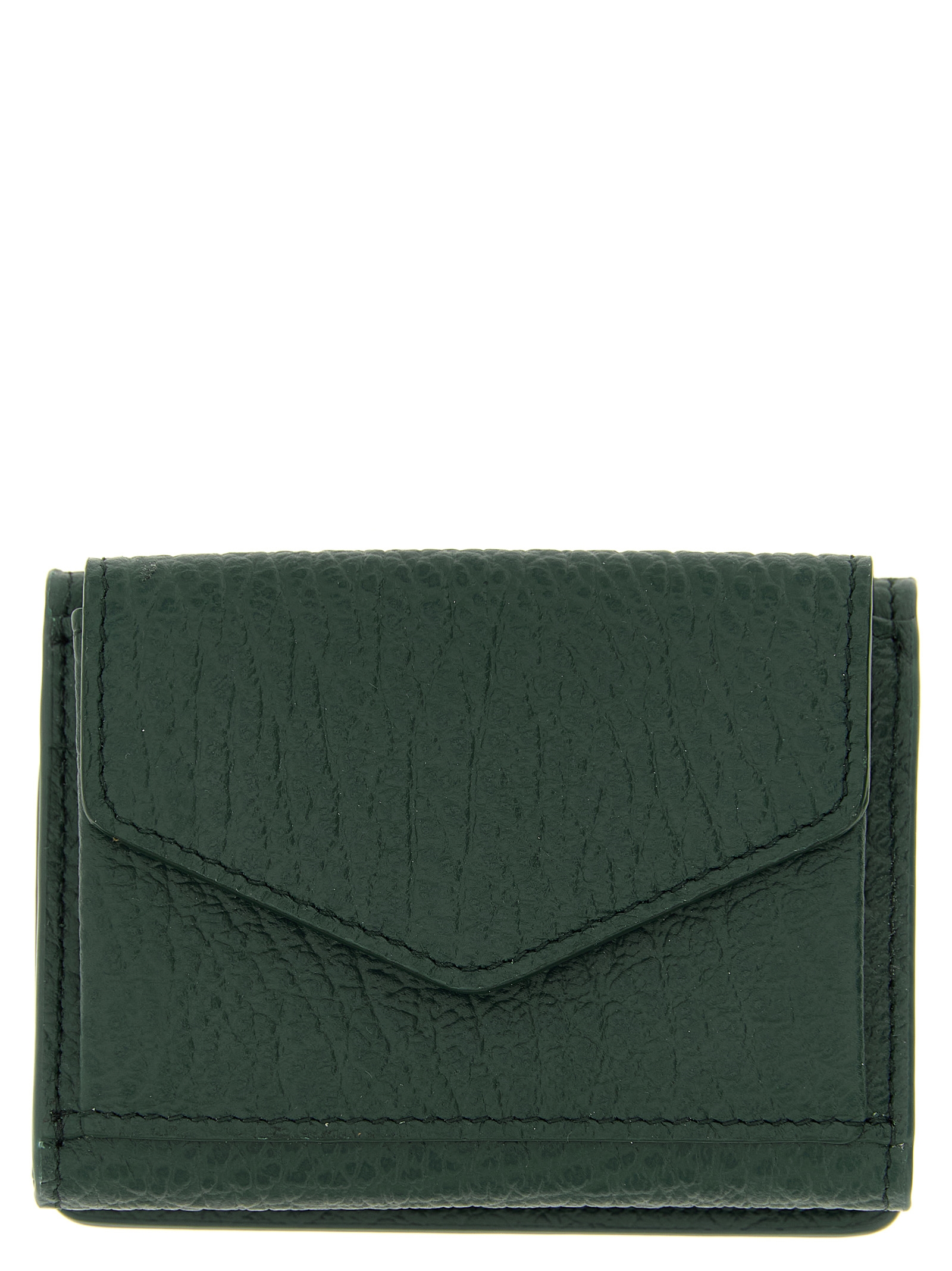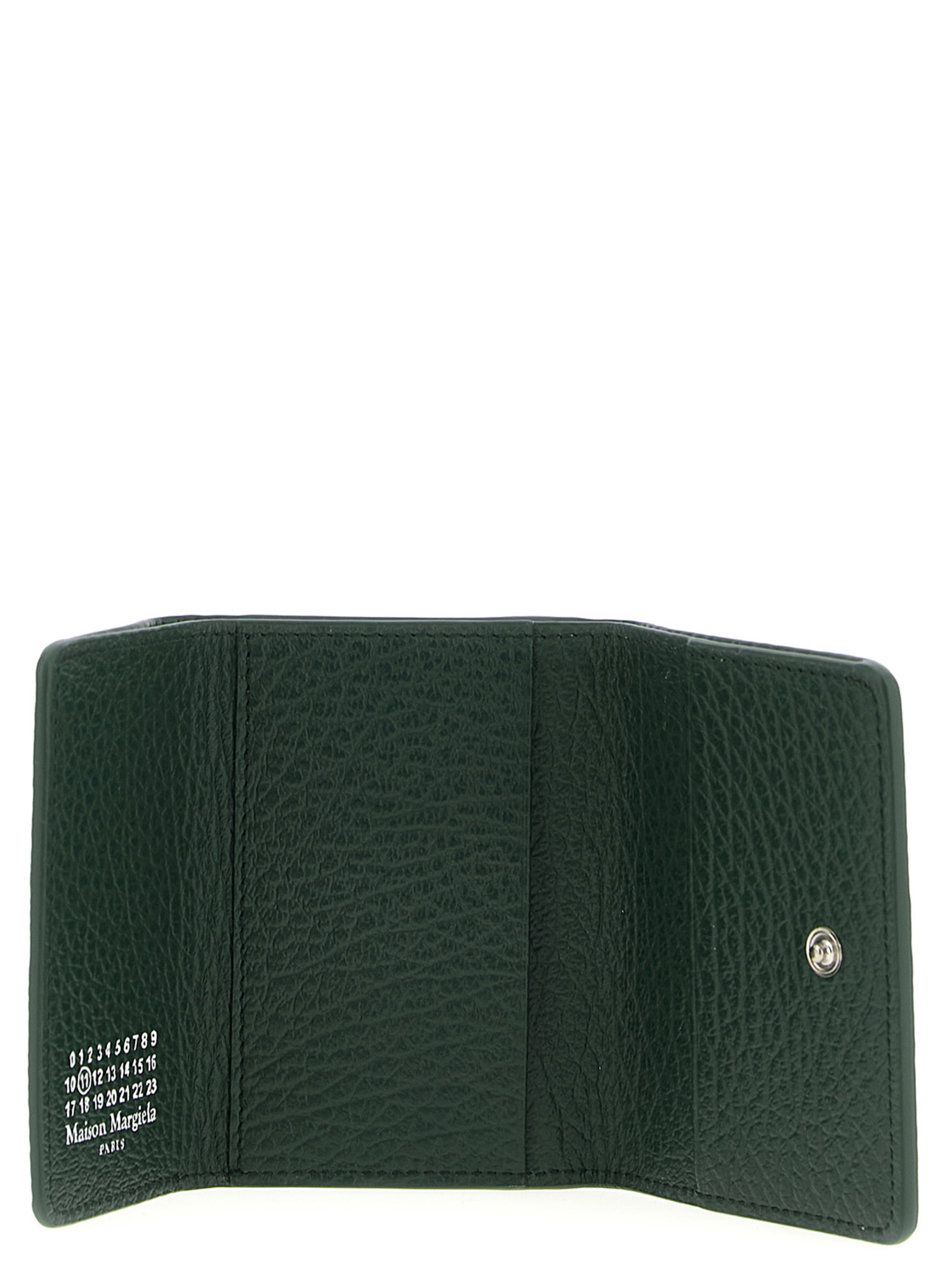 Embossed grain leather wallet, flap closure with snap button and ‘Four Stitches’ on the back, front snap button pocket.