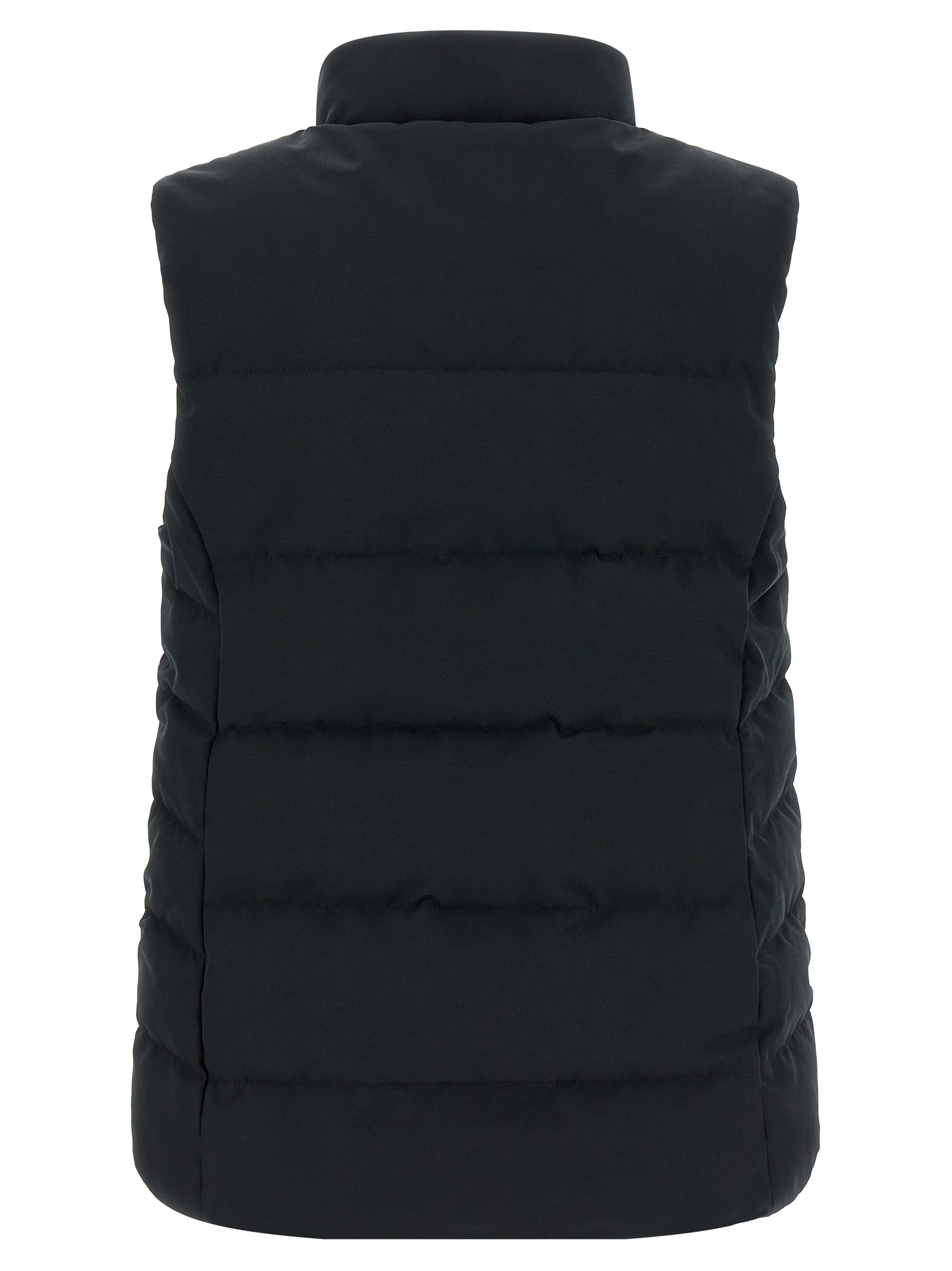 ‘Freestyle’ vest in water-repellent Arctic Tech® fabric quilted and duck feather padding, logo patch and front zip and snap button closure, standing collar with brushed tricot lining, pockets, asymmetrical hem.