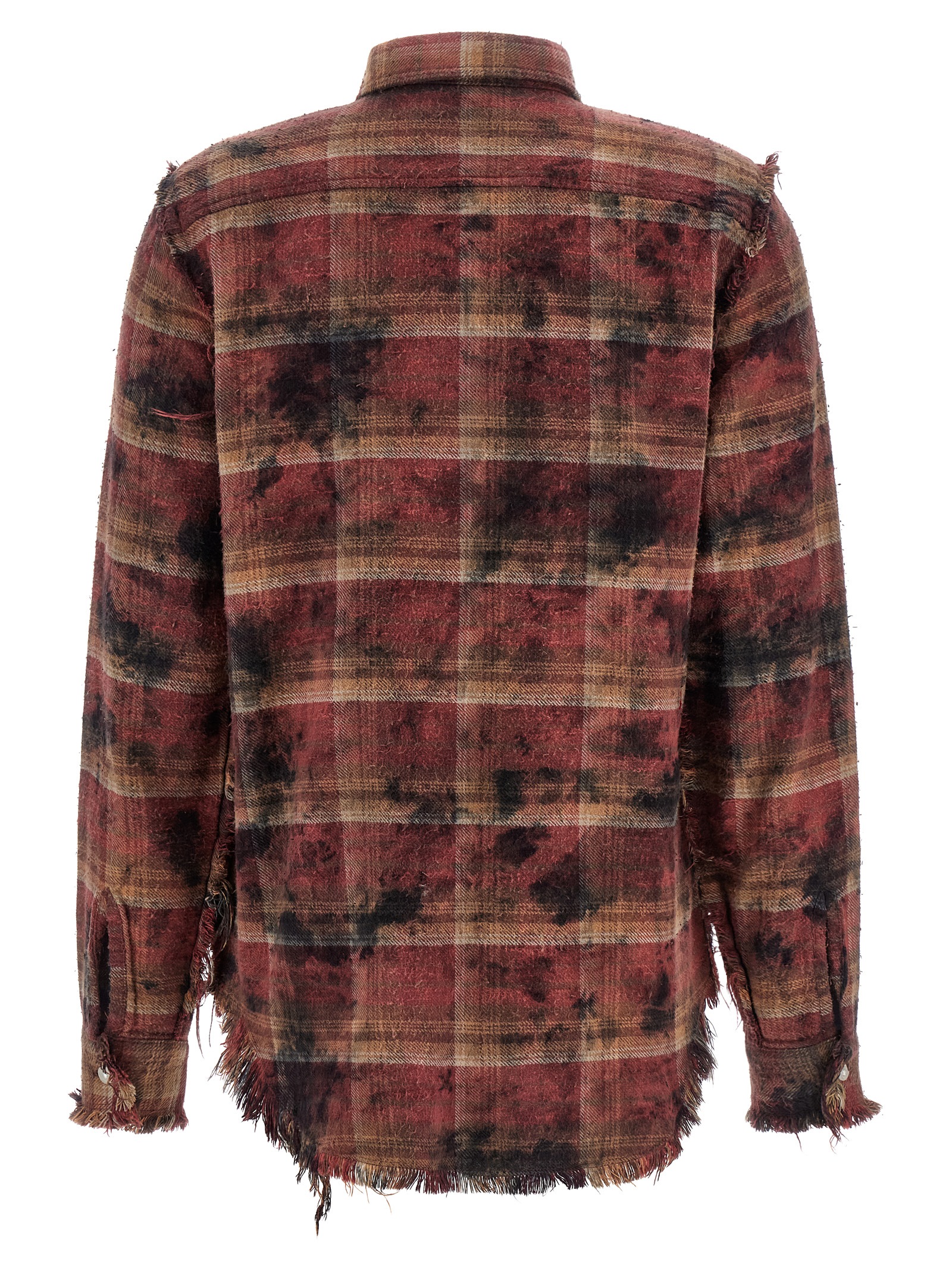 Used-effect check print peach cotton shirt, fringed hems, front button closure, breast pocket, long wide sleeves with cuffs and dropped shoulders, asymmetrical hem.