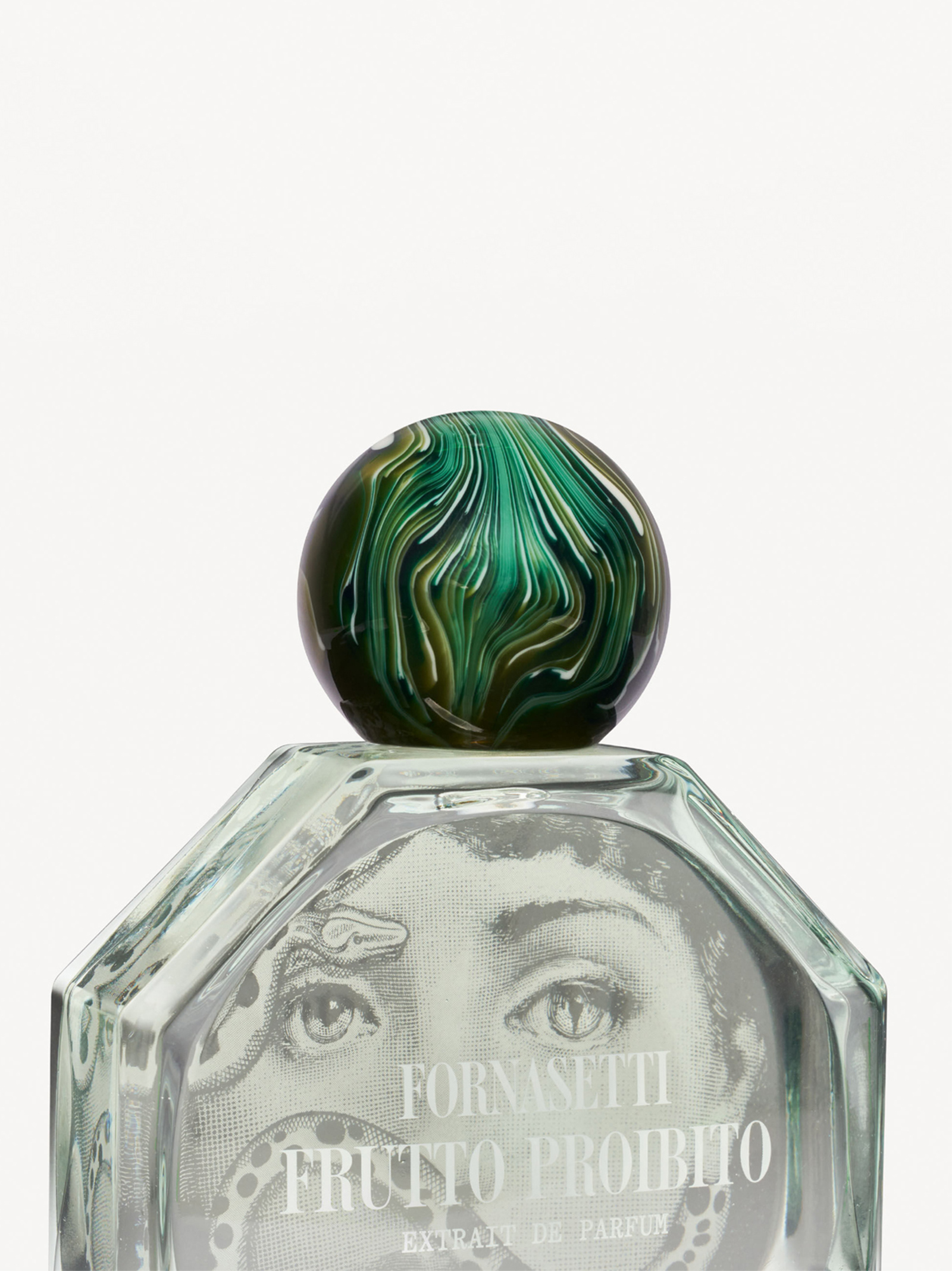 The bottle’s novel octagonal design makes the Fornasetti extrait de parfum a unique object, whilst the green Malachite cap adds an elegant, refined touch. The box plays with the octagonal shape, evoking the design of the bottle.