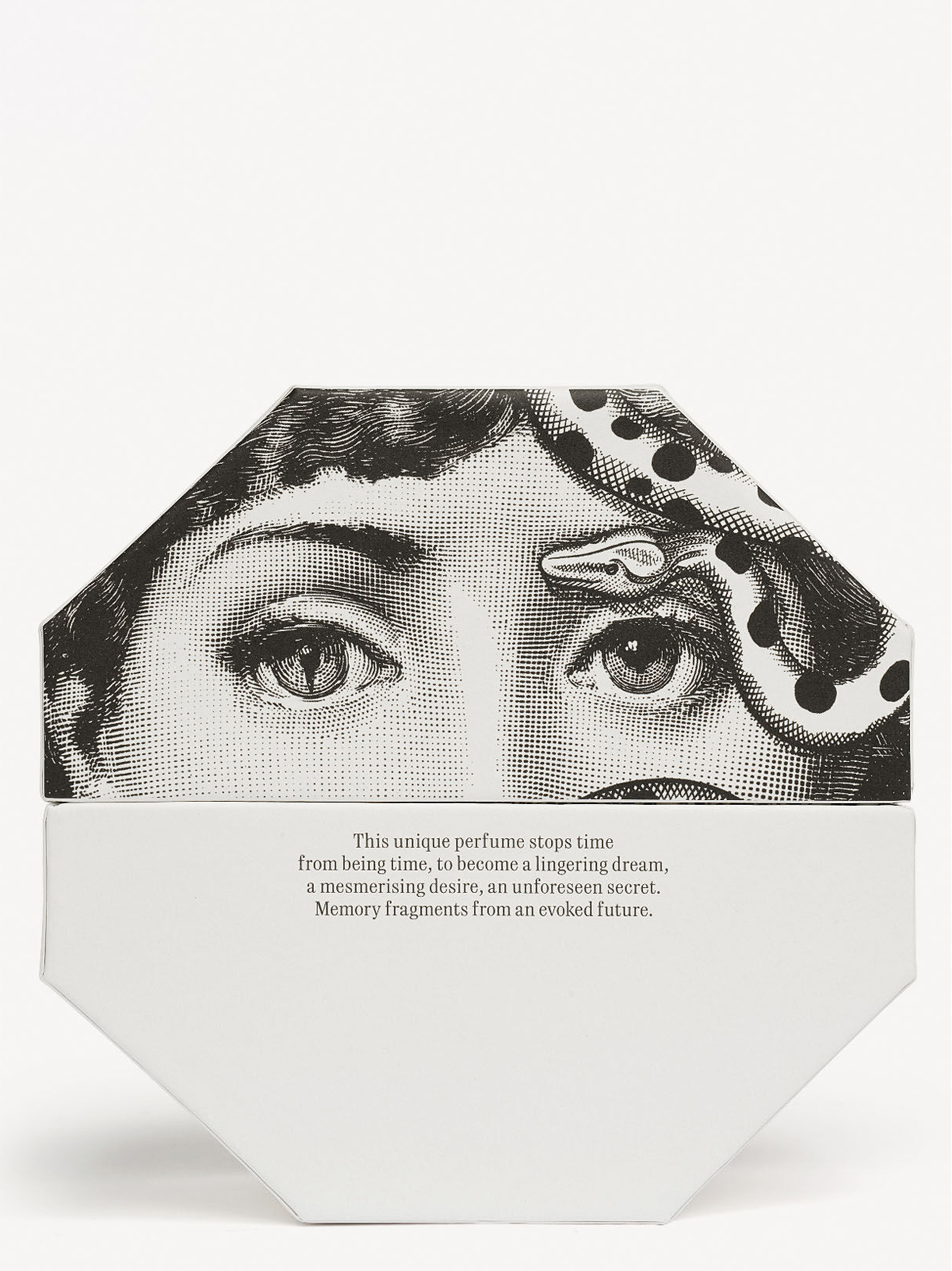 The Frutto Proibito fragrance is visually interpreted by the face of the 19th century opera singer, Lina Cavalieri, who was both a classical beauty with an enigmatic gaze and Fornasetti’s muse, and who is now an icon. The woman encounters the temptation of the snake, a reminder of Original Sin.