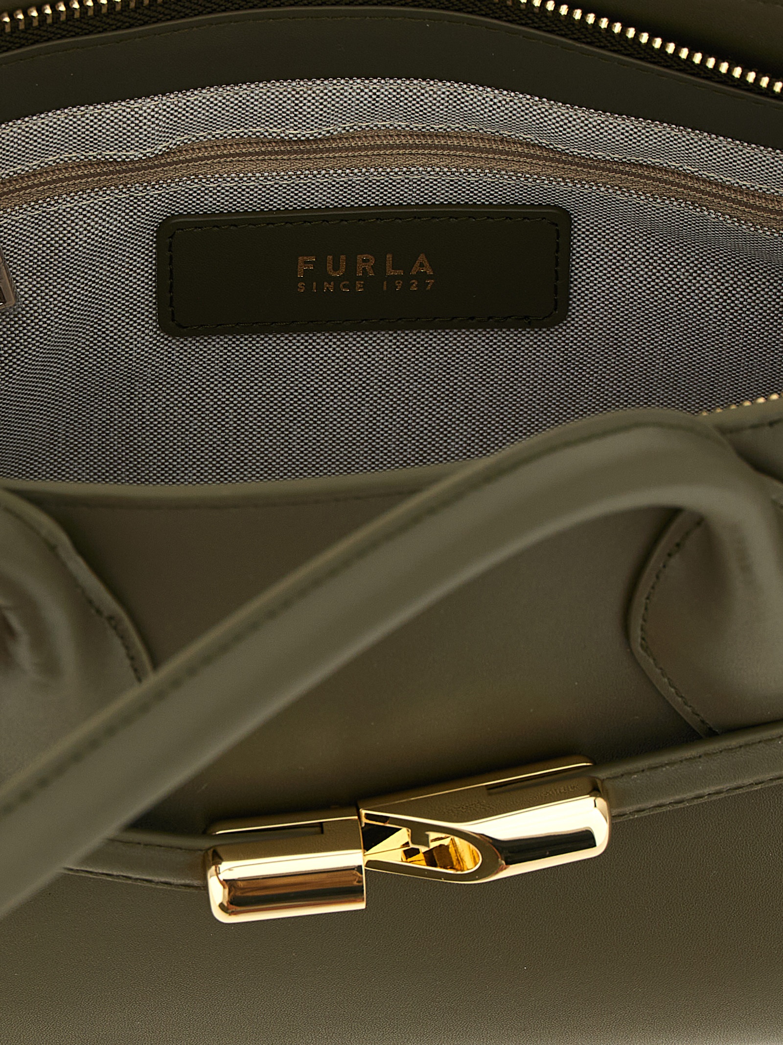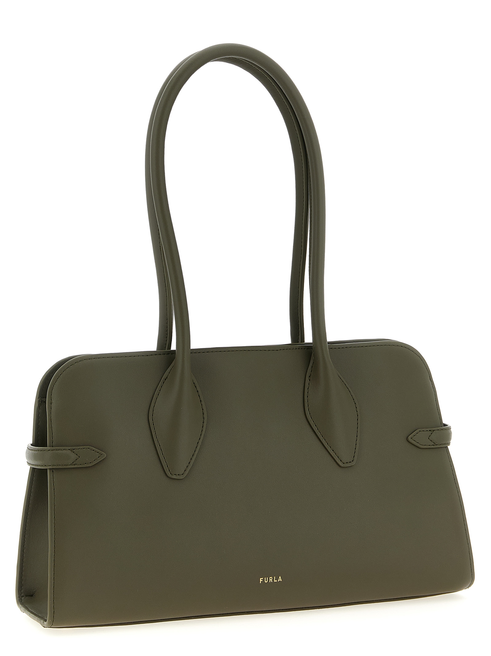 ‘Furla Goccia Dome M’ shoulder bag in smooth leather, front belt detail with cylindrical hardware glossy finish with Arco logo, double fixed handle, top zip closure, metal details.