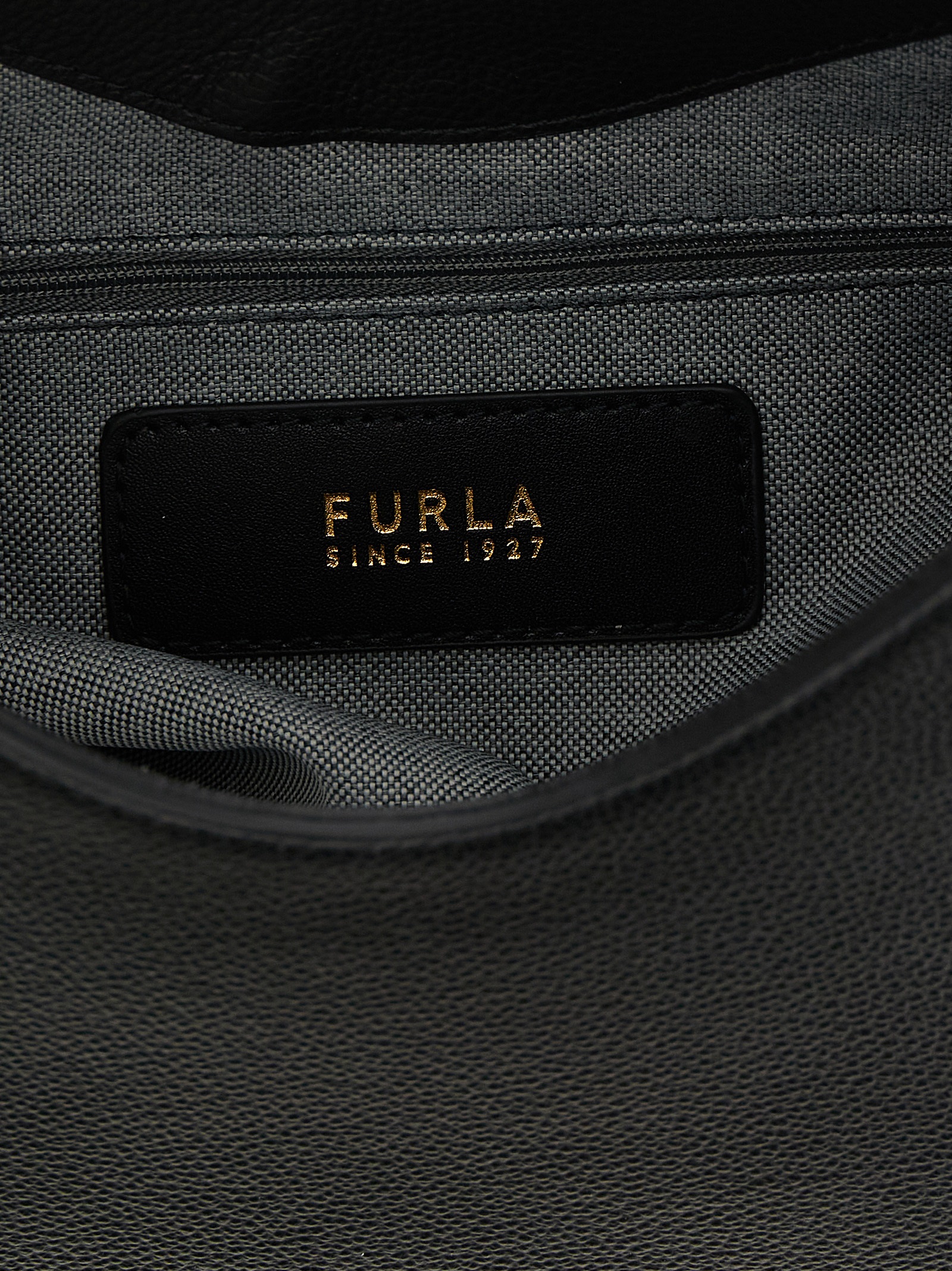 Small ‘Furla Goccia’ shoulder bag in smooth leather and printed midnight calfskin leather, hobo model, soft and unstructured silhouette, cylindrical hardware closure with weight and carved ‘Arco Furla’ logo, back embossed lettering logo, adjustable handle, rigid base with metal feet, lining, two inner pockets.