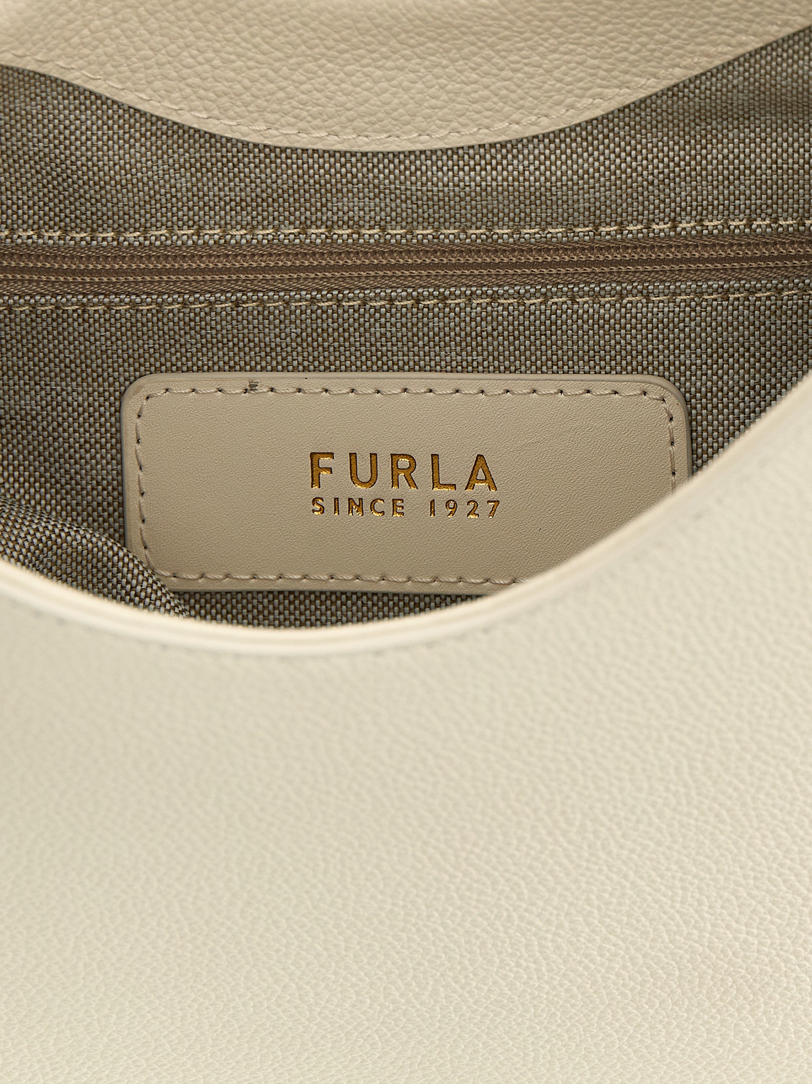 Small ‘Furla Goccia’ shoulder bag in smooth leather and printed midnight calfskin leather, hobo model, soft and unstructured silhouette, cylindrical hardware closure with weight and carved ‘Arco Furla’ logo, back embossed lettering logo, adjustable handle, rigid base with metal feet, lining, two inner pockets.