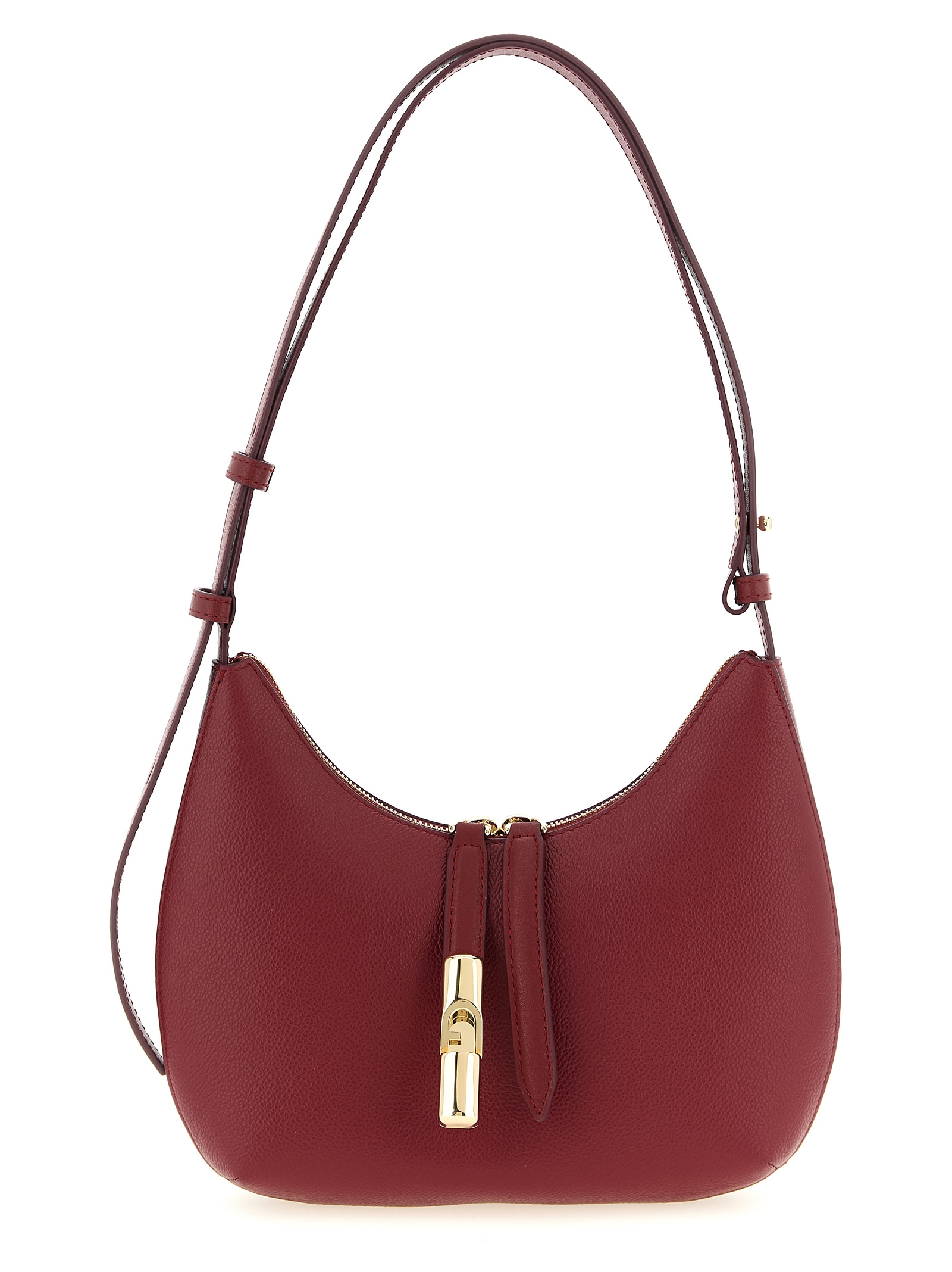 Small ‘Furla Goccia’ shoulder bag in hammered and smooth leather, zip closure with cylindrical hardware in glossy finish with Arco logo on one of the two leather pullers, adjustable handle.