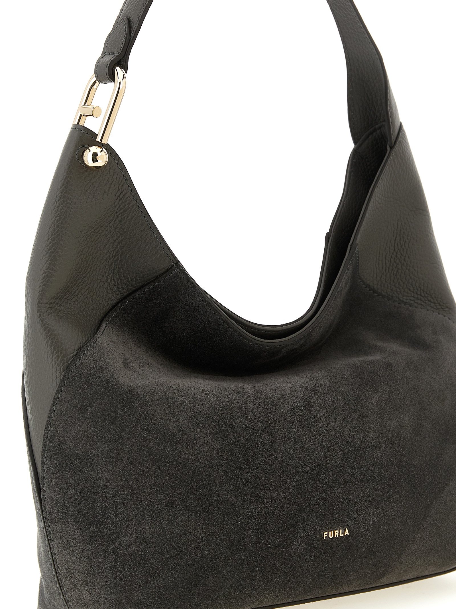 ‘Furla Lara’ medium shoulder bag in suede and smooth tone-on-tone calf leather, front metal lettering logo, magnetic closure, fixed handle with iconic Arco logo with metal ball element.