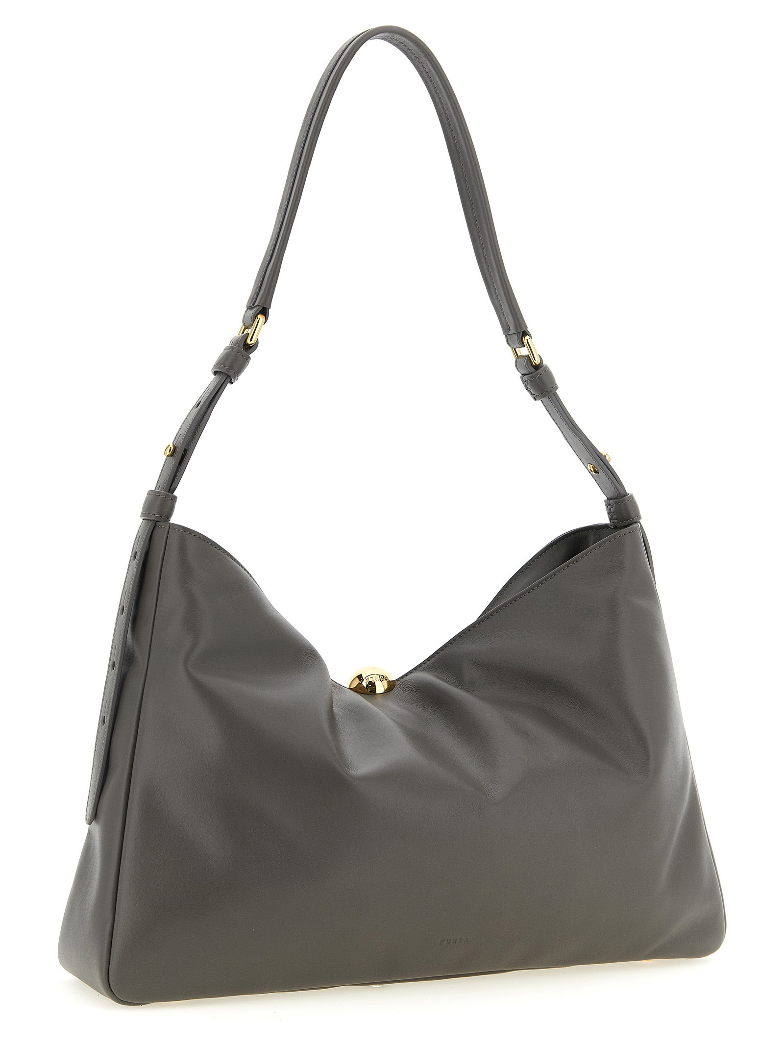 Large ‘Furla Sfera Soft’ shoulder bag in padded smooth nappa leather, magnet button closure decorated with ball hardware, front embossed logo, adjustable handle, rigid base with metal feet.