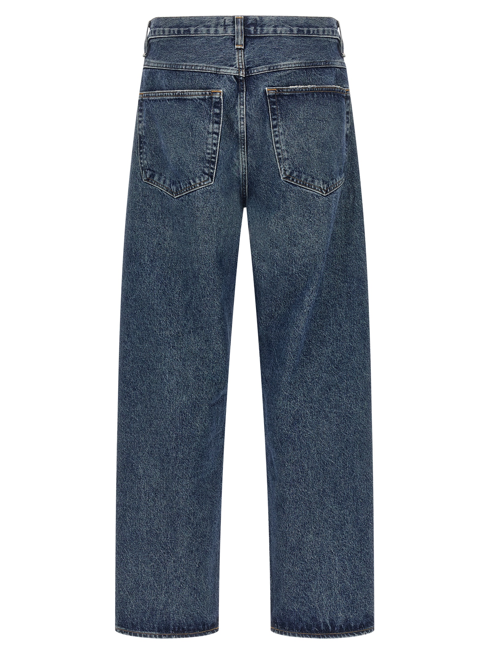 ‘Fusion’ stonewashed cotton denim jeans with used details, zip and front button closure, wide straight leg, five pockets.