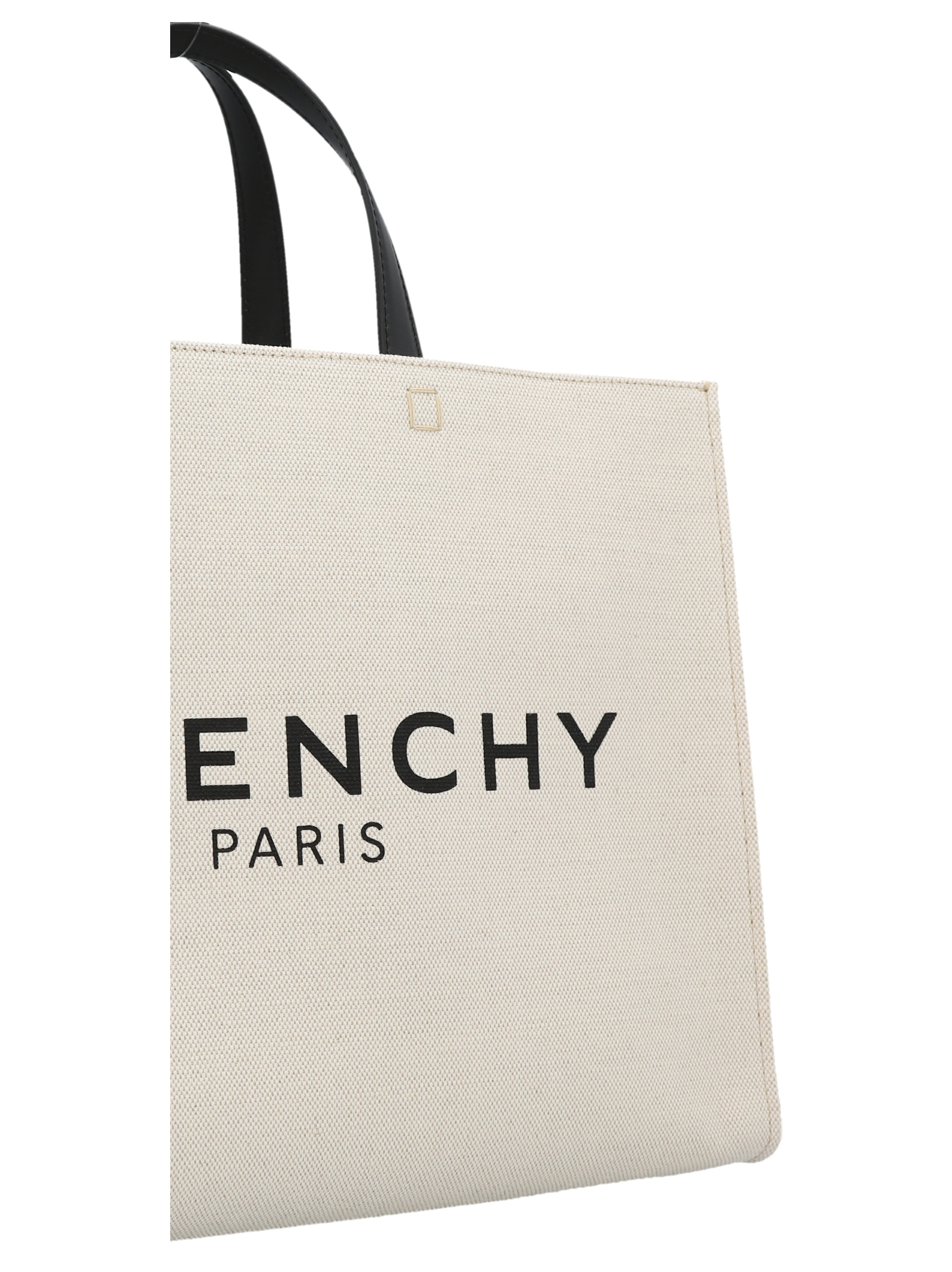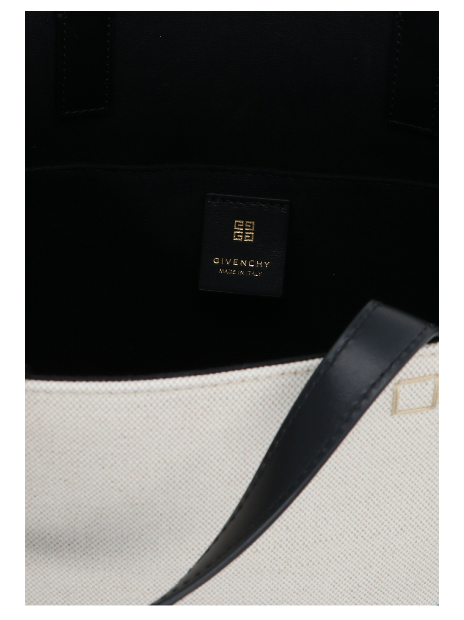 G’ cotton and linen canvas midi shopping bag with front logo print, black jacquard canvas shoulder strap with calf leather details and a metal ring, black leather handles, black leather feet with 4G pattern on the bottom, metal details from the gold finish and inner pocket.