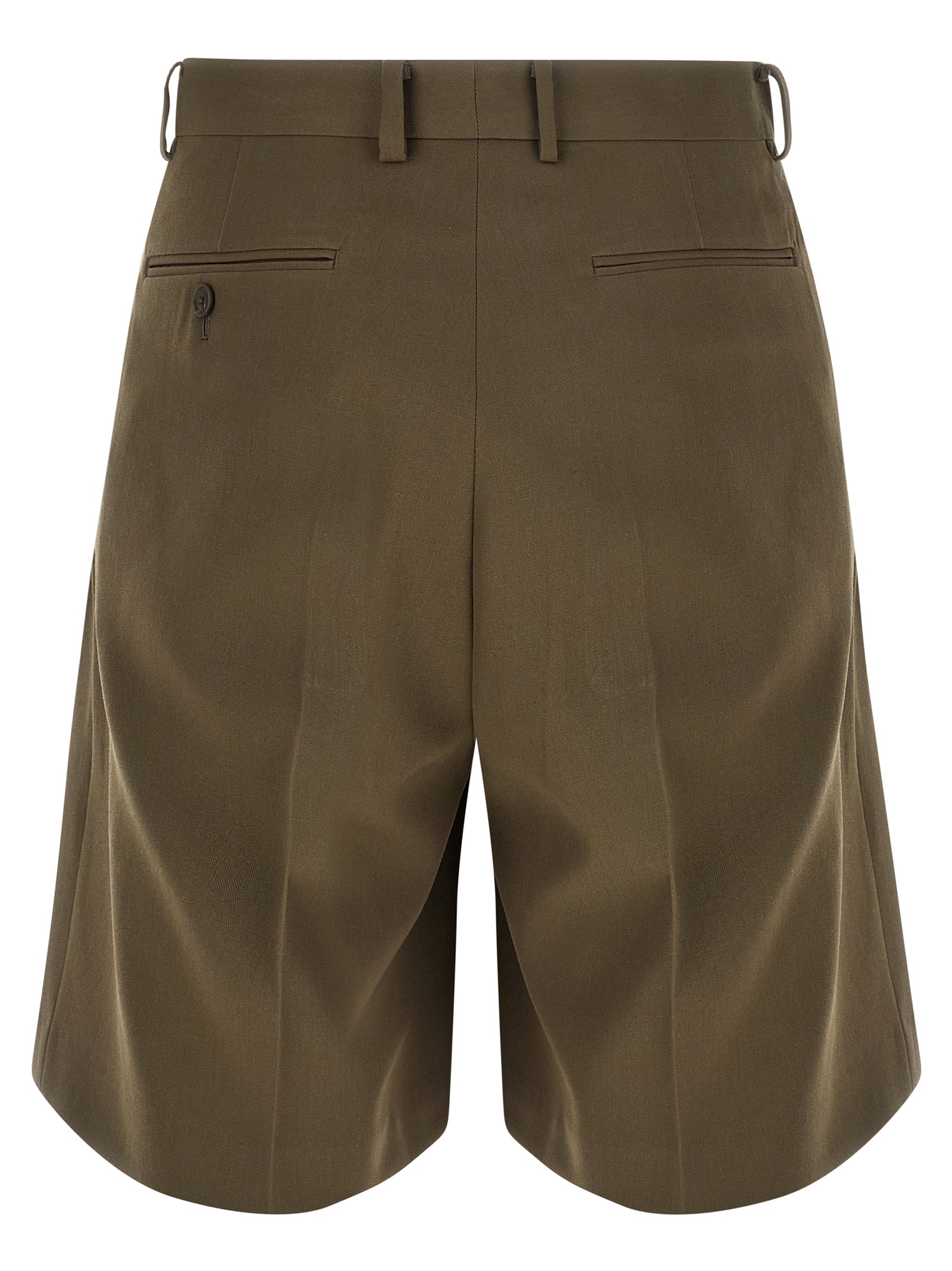 Formal wool gabardine bermuda shorts, wide leg with front pleats and stretched pleat, front button and hook zip closure, side and back welt pockets.