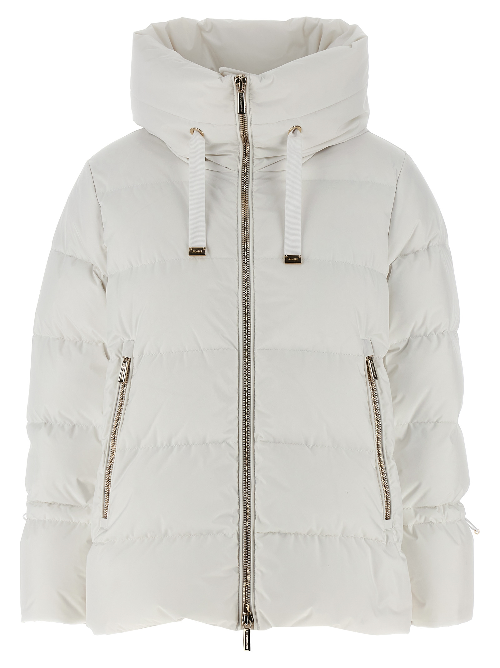 ‘Gadia’ down jacket in technical fabric with a silky appearance quilted with large boudin padding, goose down and water-repellent, trapezoid line, adjustable hood, high neck, front zip closure, pockets, long sleeves with drawstring on the wrist, drawstring on the hem.
